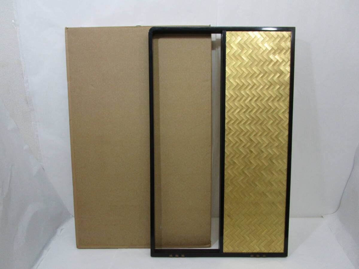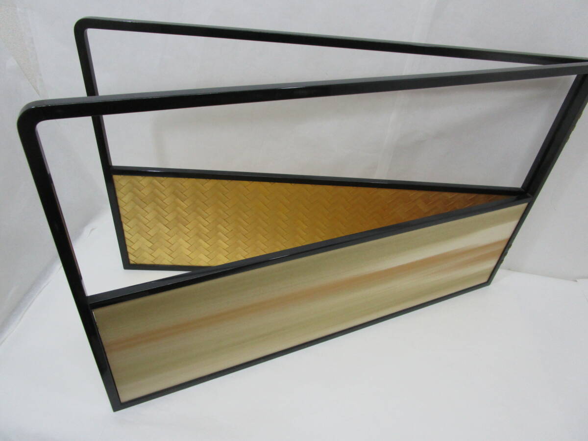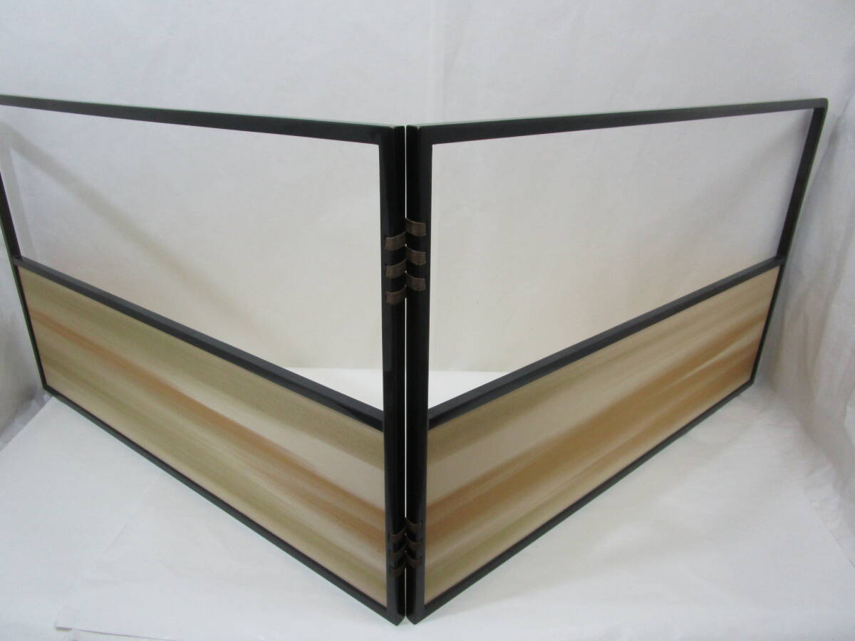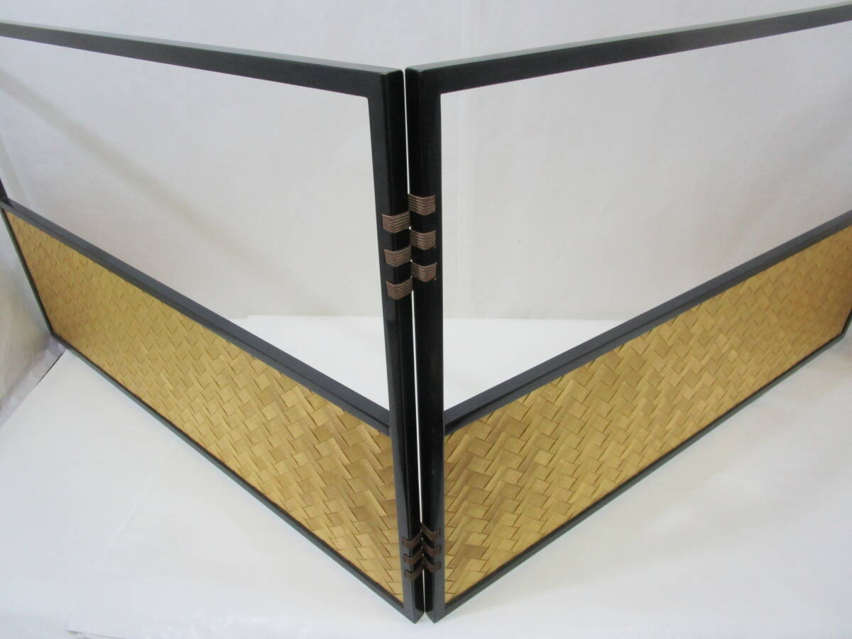 中古茶道具! 江戸間用  塗縁 [霞・金網代] 両面使用の 腰風炉先です。片面幅 (折りたたみ幅) 89cm×高さ 54.5cm   ★ 目立った汚れ無し。 裂地 (シミ有り) を使用された為、紙箱はキツメです。 どうぞ宜しく。