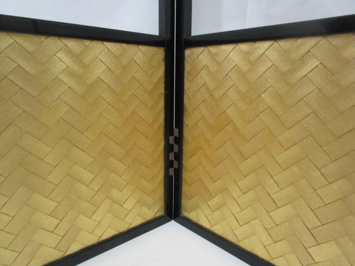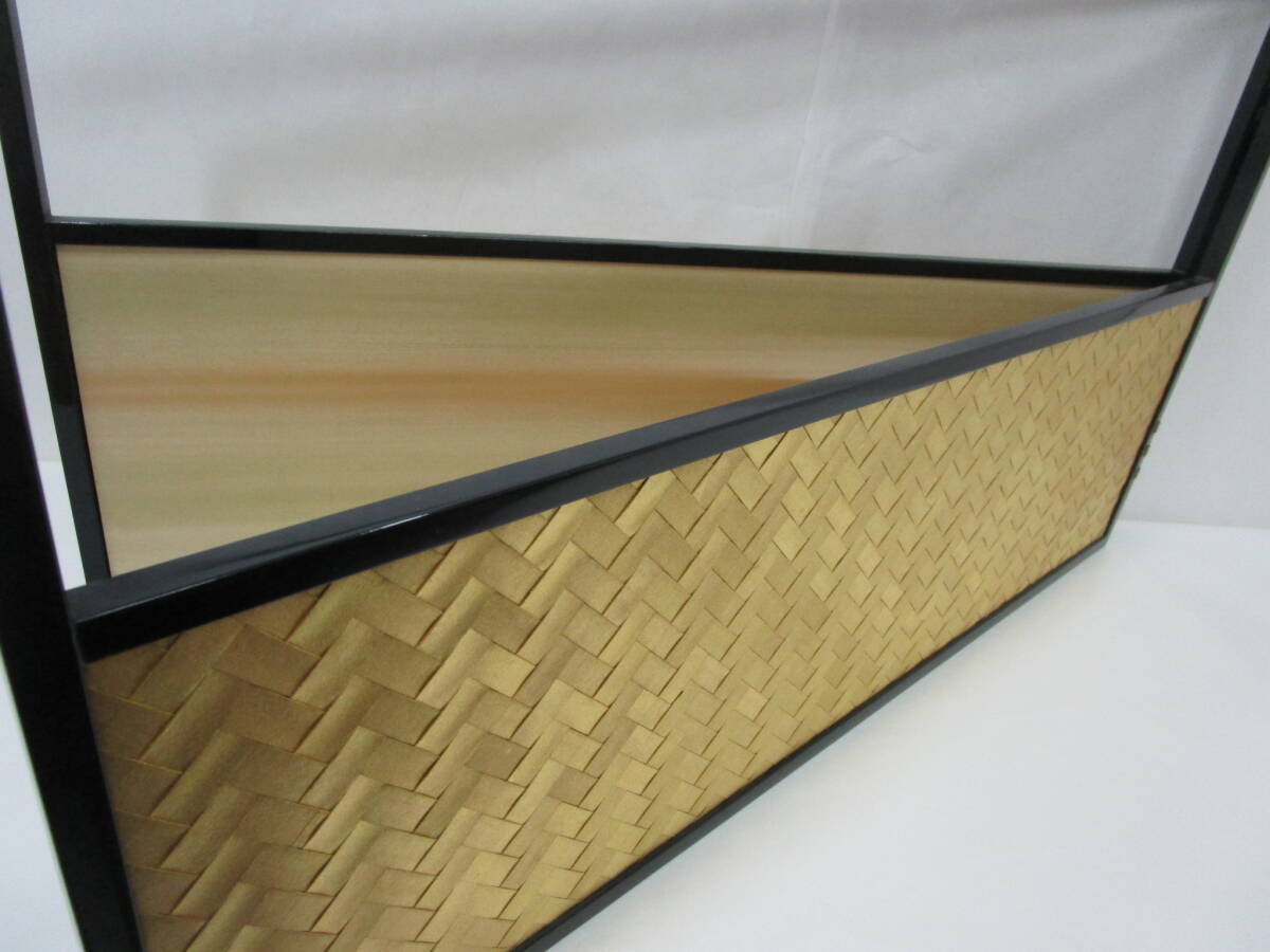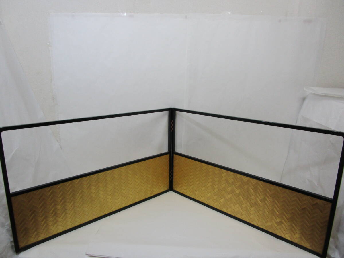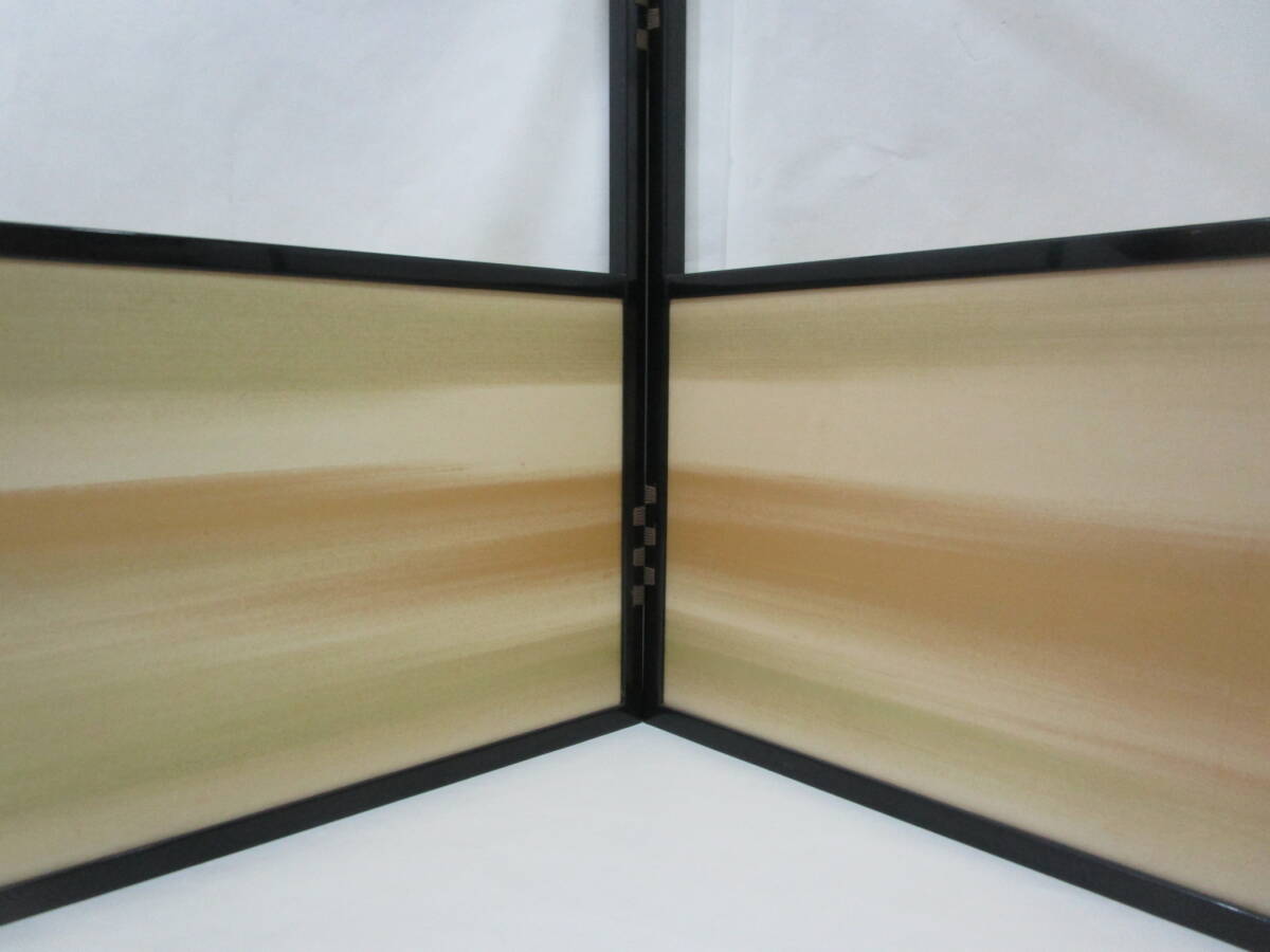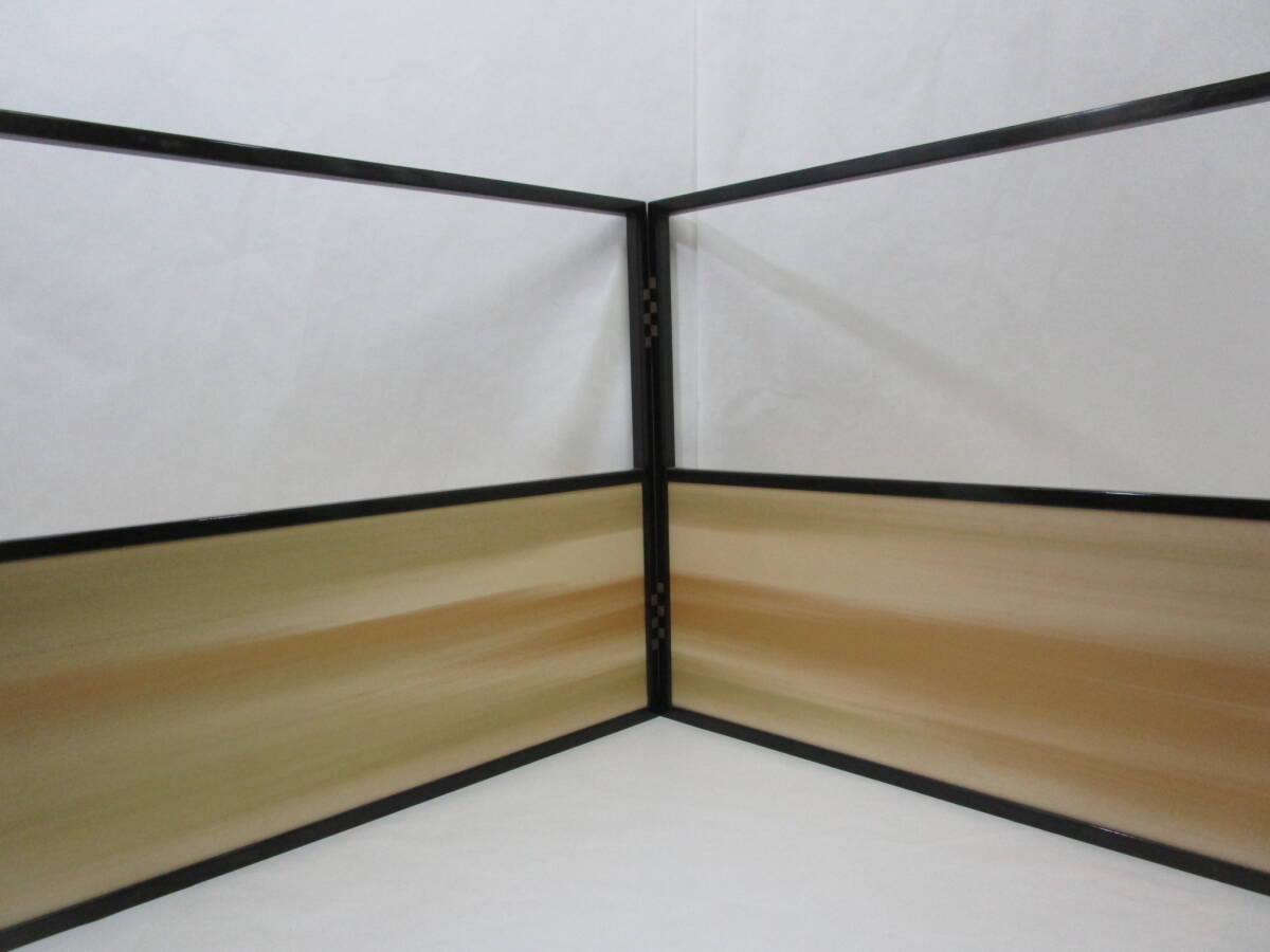 中古茶道具! 江戸間用  塗縁 [霞・金網代] 両面使用の 腰風炉先です。片面幅 (折りたたみ幅) 89cm×高さ 54.5cm   ★ 目立った汚れ無し。 裂地 (シミ有り) を使用された為、紙箱はキツメです。 どうぞ宜しく。