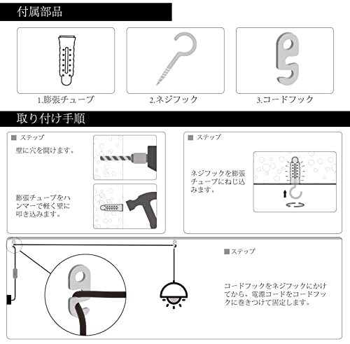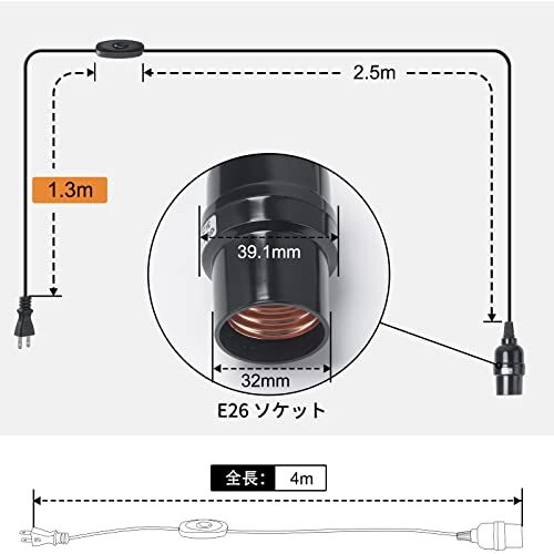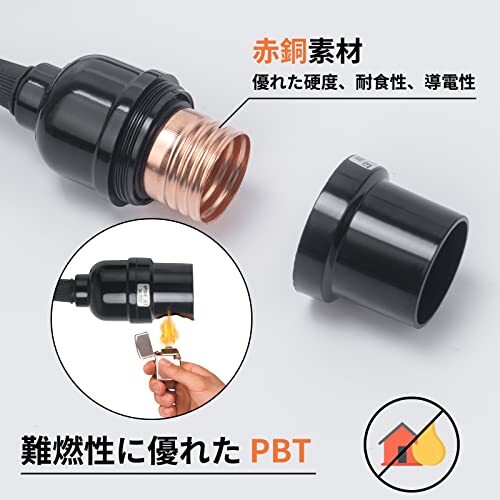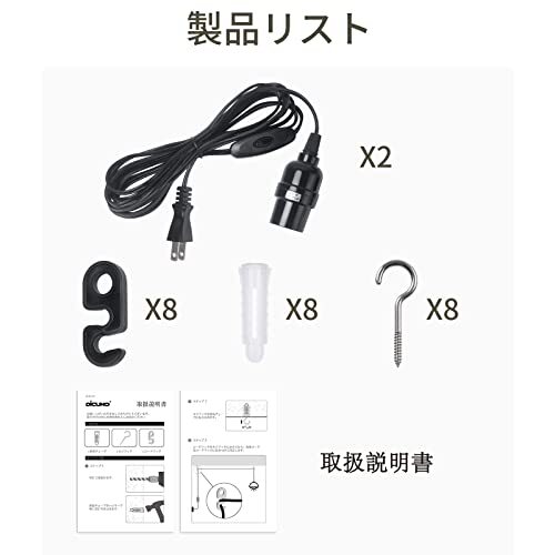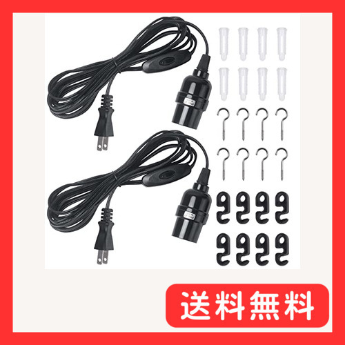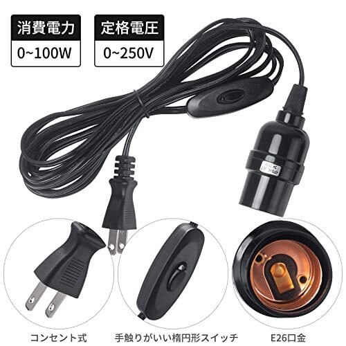 「DiCUNO コード付き ソケット E26 電球ソケット コンセント スイッチ付き 吊り下げ 4m ブラック おしゃれ 2個入」▼▼(商品説明)・ブラック 2個入 ・・Color:ブラックSize:2個入・コンセントに差し込んで使用する4mコード付きソケットです。4m長さのコードソケットは様々な場所に対応します。・口金:E26 使用可能電球:100Wまで 定格電圧:0-250V カラー:ブラック 素材:硬度、導電性、耐食性に優れた赤銅+難燃性に優れたPBT・便利な操作:ON/OFFスイッチ付きで、プラグの抜き差しで電球を点灯や消灯する手間を減らします。操作を容易にするため、スイッチをプラグから約130cmにしました。・簡単に:コンセント式なので、工事不要です。固定用の部品(膨張チューブ、ネジフック、コードフック)を付属します。取り扱い説明書の手順によると、数分で簡単に取り付けられます。・ご購入日より1年間のををご提供致します。何かがございましたら、お気軽にsupport.jp@dicuno.comにご連絡ください。一生懸命ご対応させていただきます。