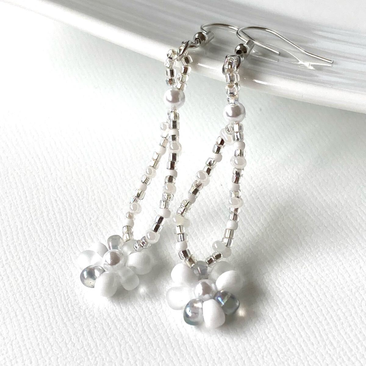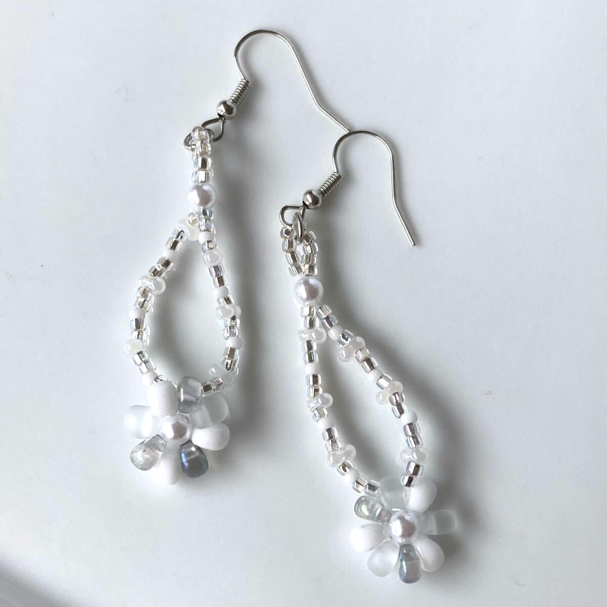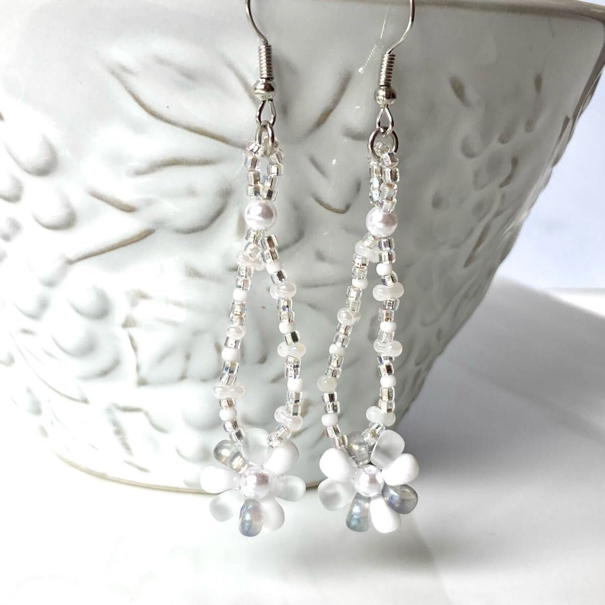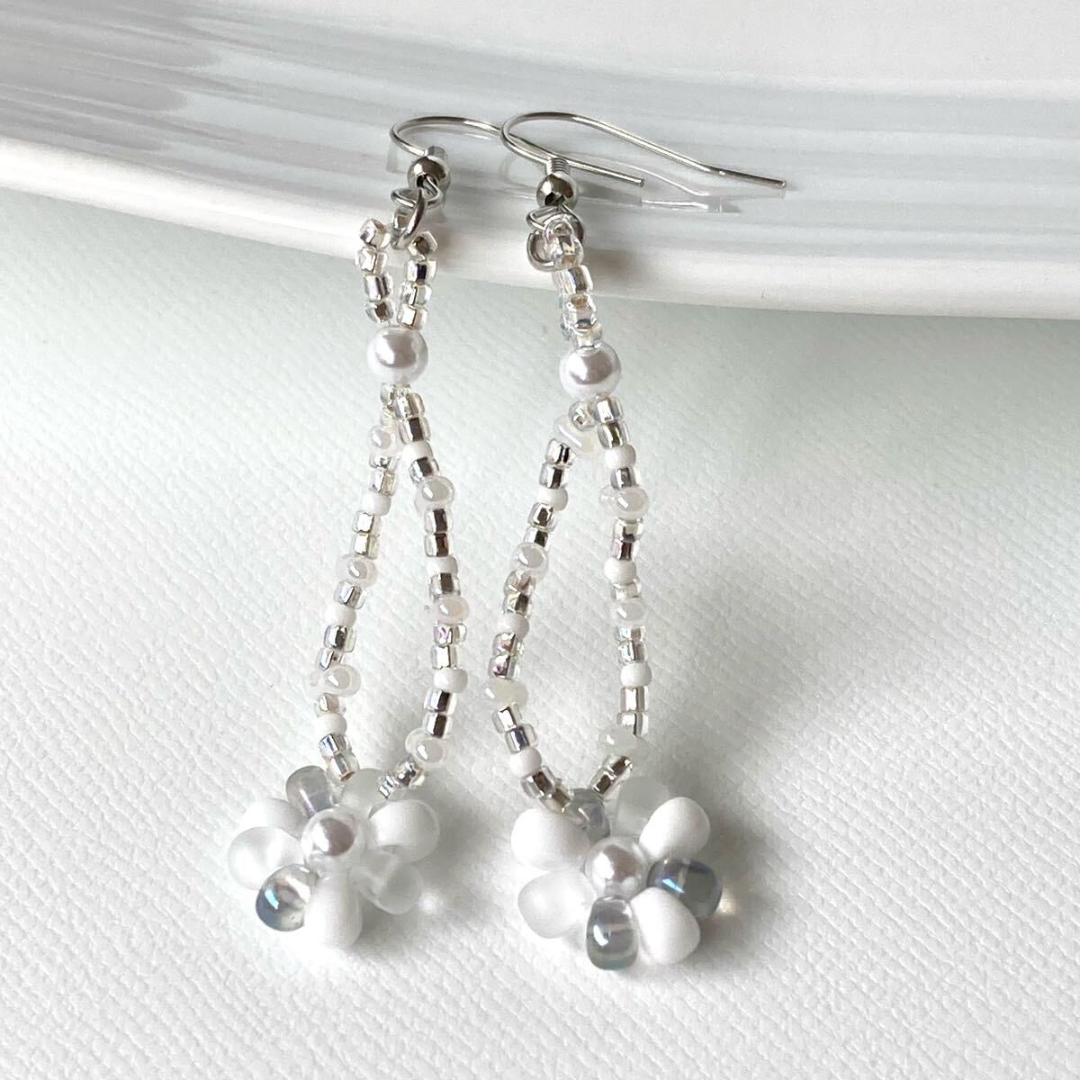 ビーズ ピアス ハンドメイド まが玉ビーズのお花モチーフのゆれるピアス 白×グレー です。
