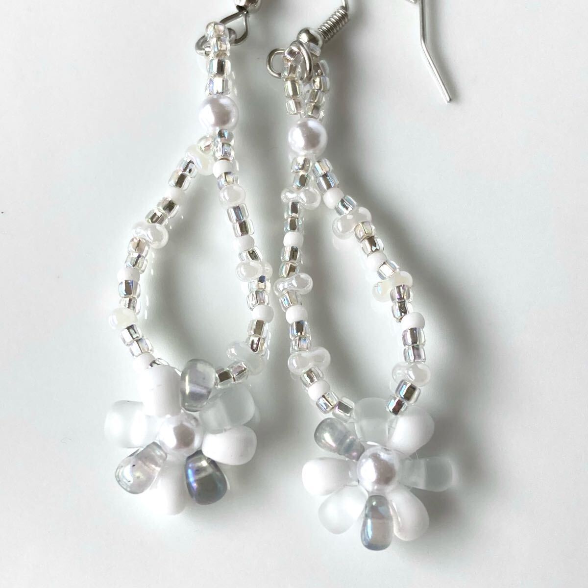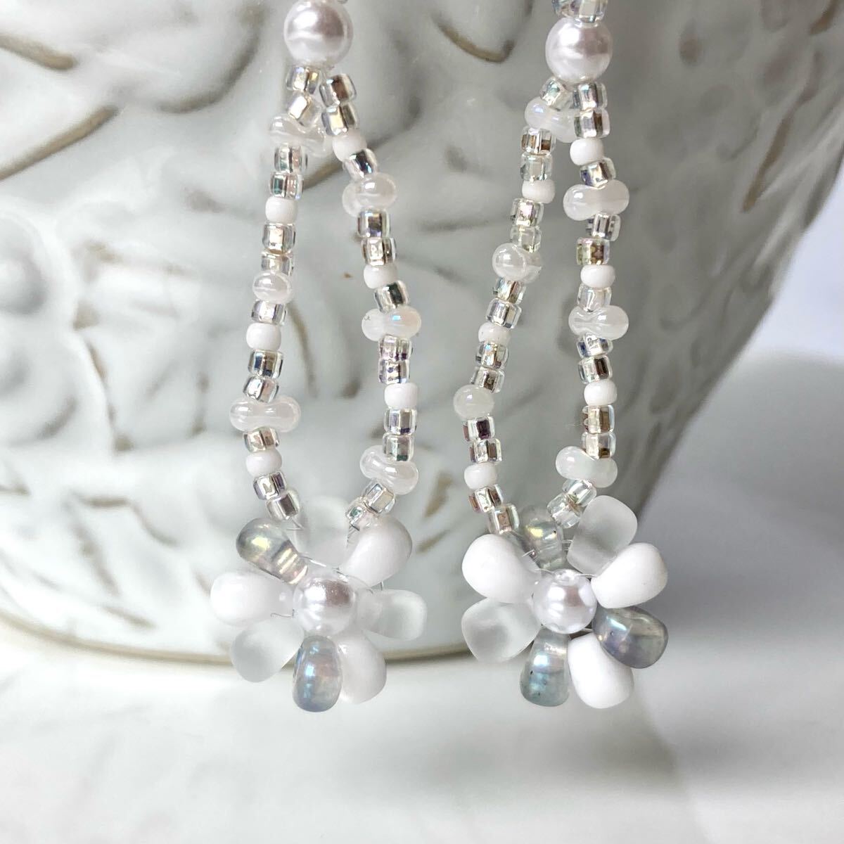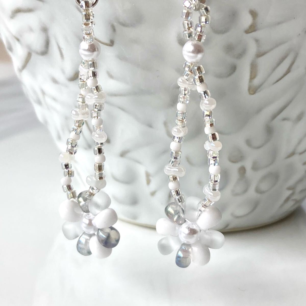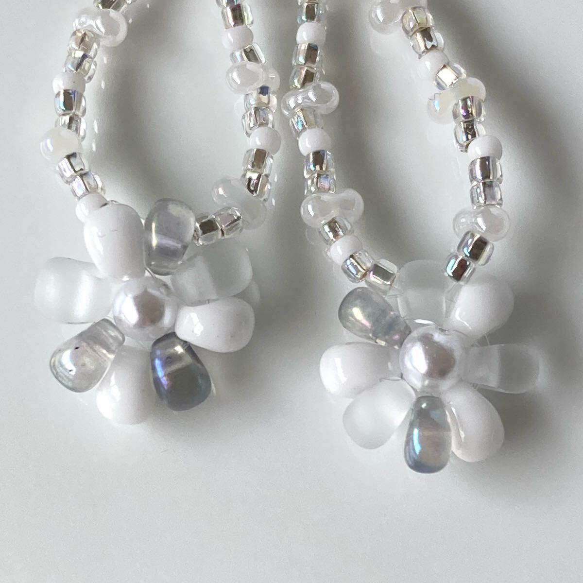 まが玉ビーズのお花モチーフのゆれるピアス 白×グレー