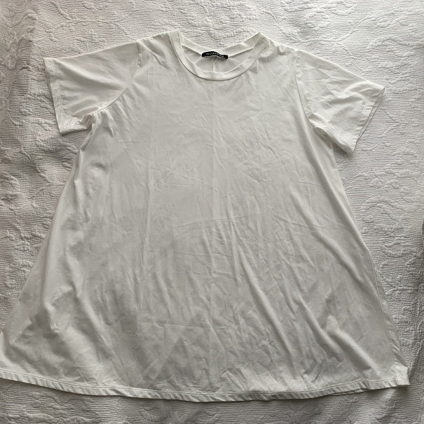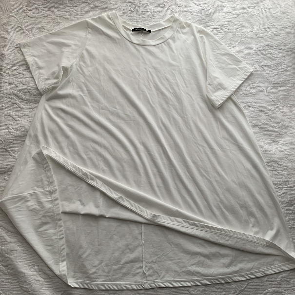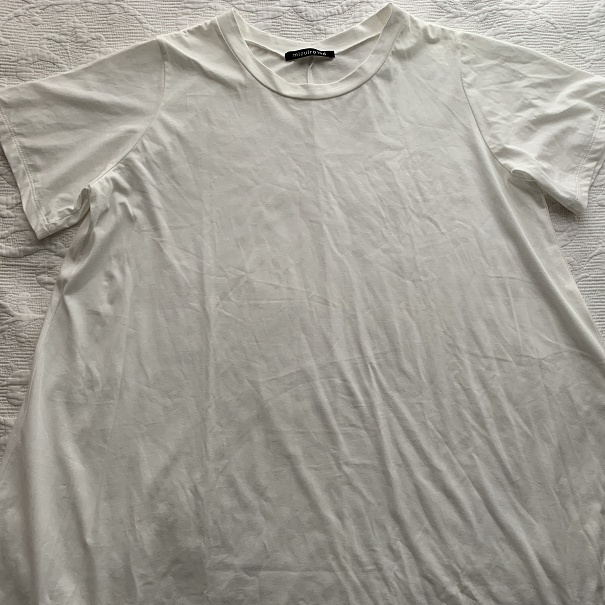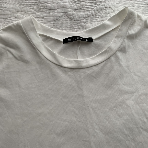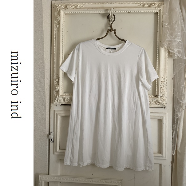 新品同様 mizuiro ind ミズイロインド  クルーネック Tシャツ フレアシルエット チュニック 半袖 ロング カットソー 白 ホワイト