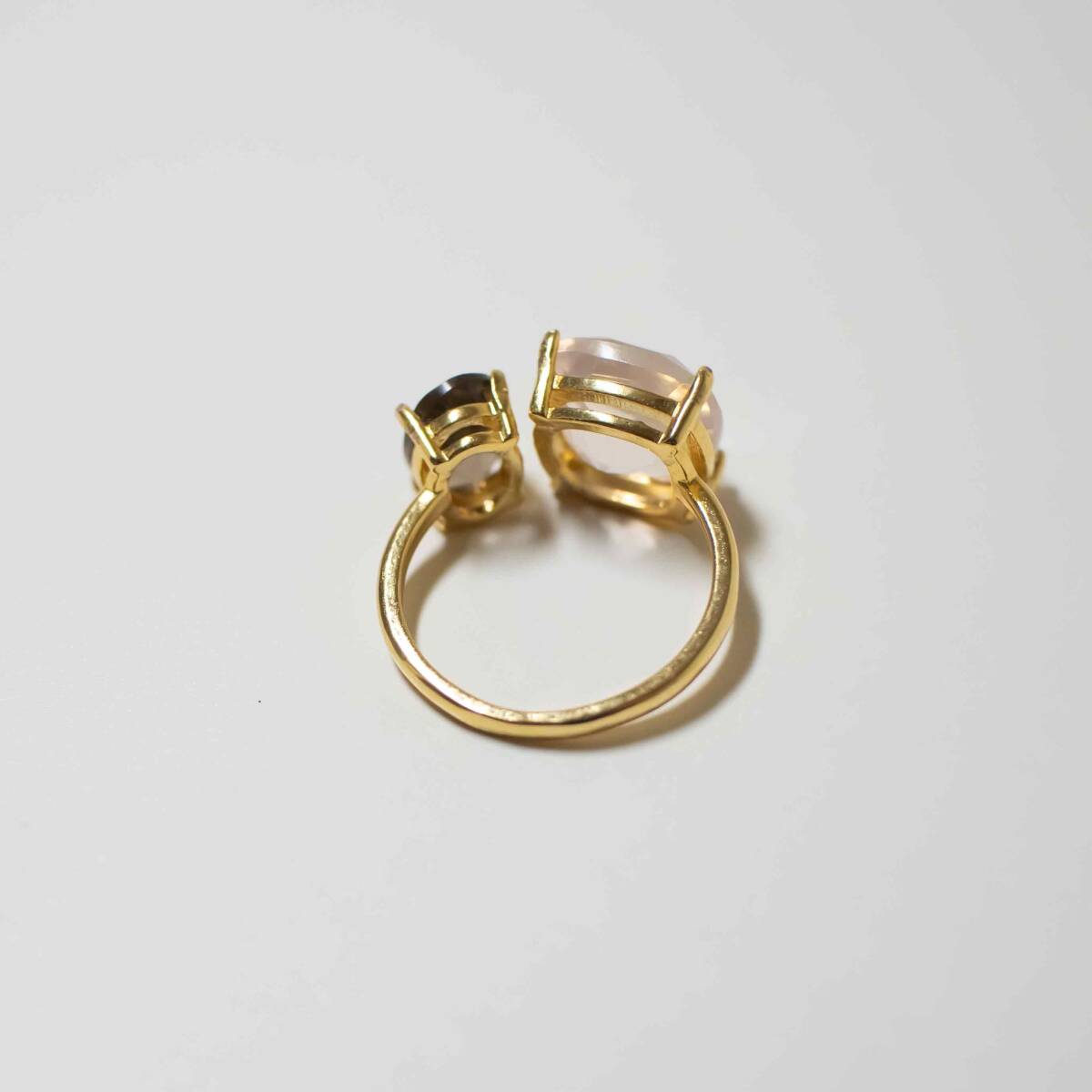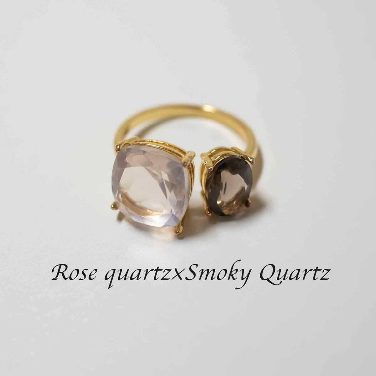 天然石◆ローズクォーツ×スモーキークォーツ【フリーサイズ 12号〜】フォークリング ゴールド