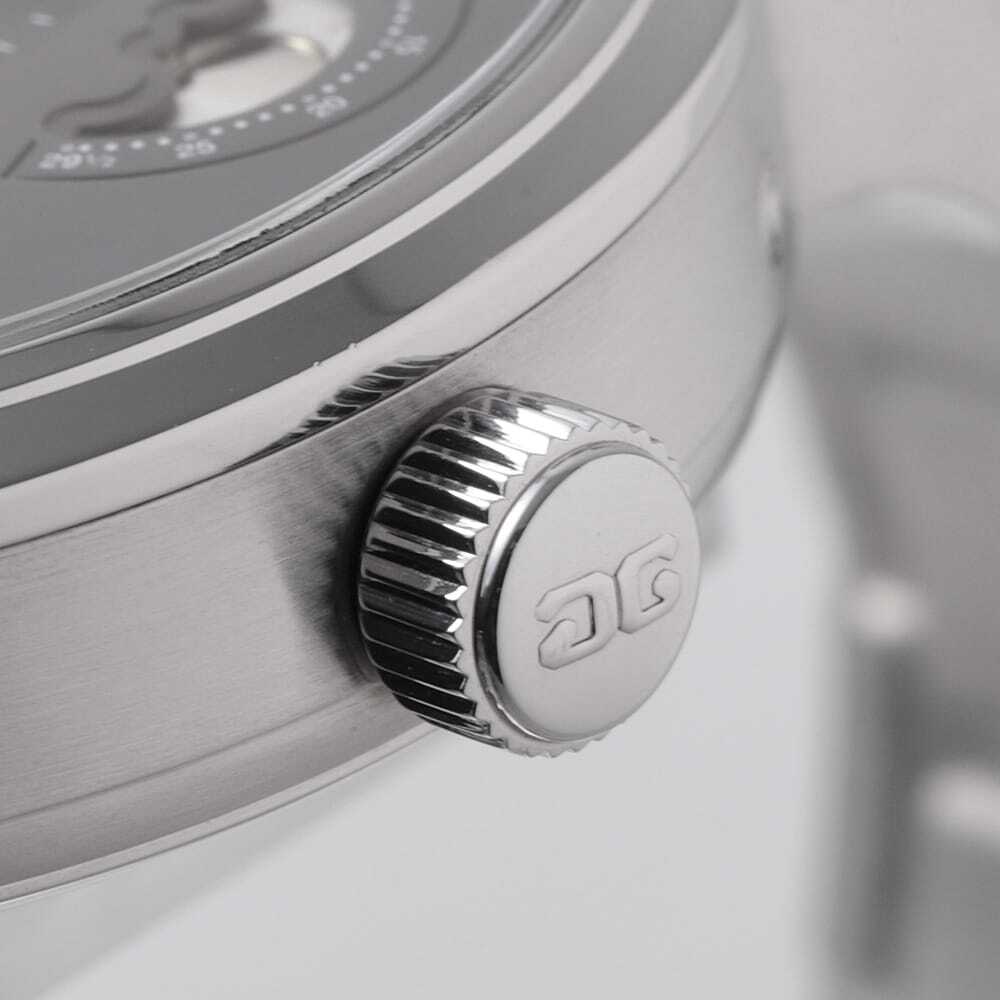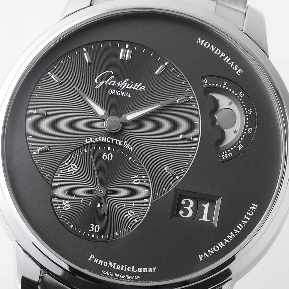 | モデル情報 | 左右非対称の美学を極めたレイアウトが、見る者の視線を惹きつける"パノマティック ルナ"。その文字盤は、約40もの精緻な工程を経て手作業で仕上げられた傑作です。落ち着きのある上品な雰囲気のグレーダイアルには、ロジウムめっきのインデックスが輝き、時・分・スモールセコンドの針には上質なホワイトゴールドが用いられています。2つのサブダイアルには、繊細な「レコード引き」仕上げが施され、光の加減でダークグレーからライトグレーへと豊かな表情を見せます。裏蓋から覗くムーブメントは自社製キャリバー90-02を搭載し、42時間のパワーリザーブに対応。伝統的な3/4プレート、青焼きネジ、ポリッシュされたスティールパーツ、そしてブランド独自のダブルスワンネック緩急微調整機構など、見どころが随所に散りばめられたモデルです。 |