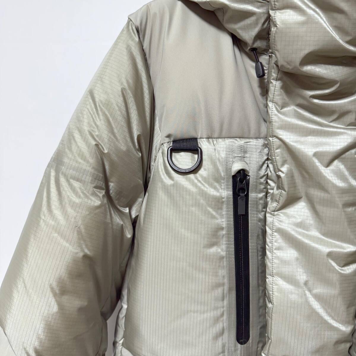 中わたのコールドスポットを軽減するバッフル構造、Wフラップのフロントや止水仕様のチェストポケットは、ヒマラヤンパーカのディテールを踏襲しています。