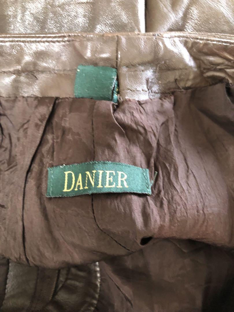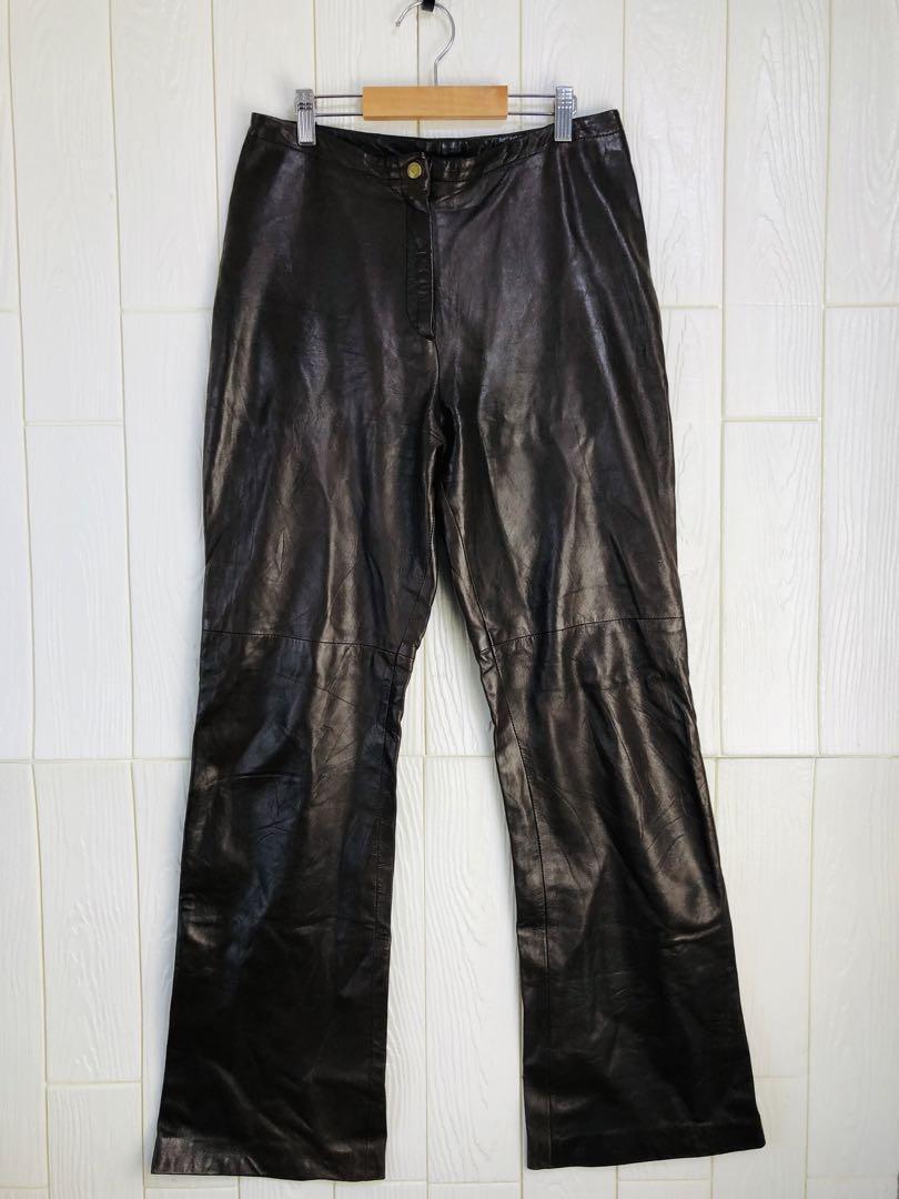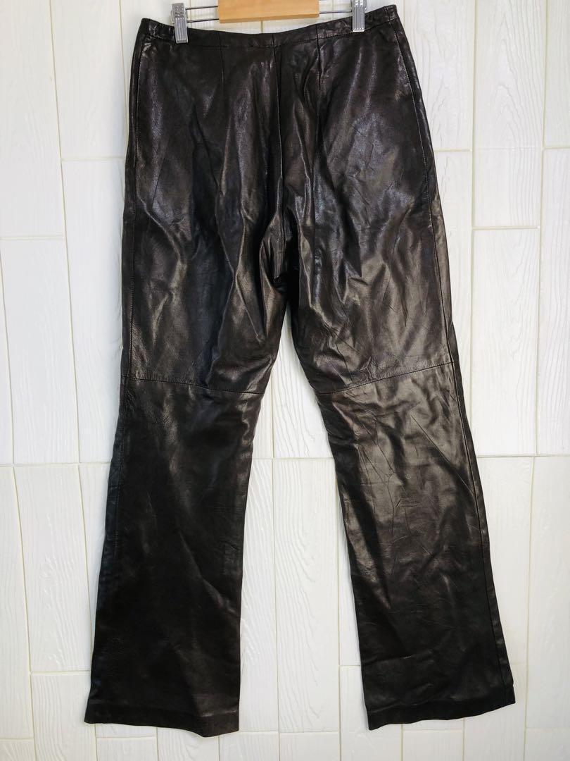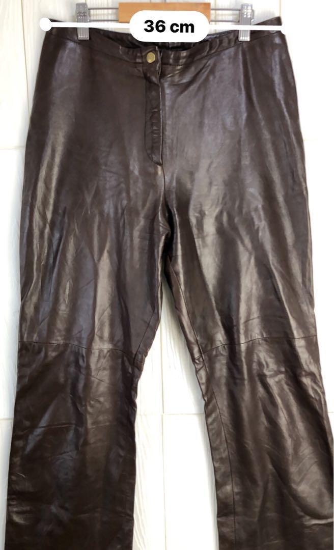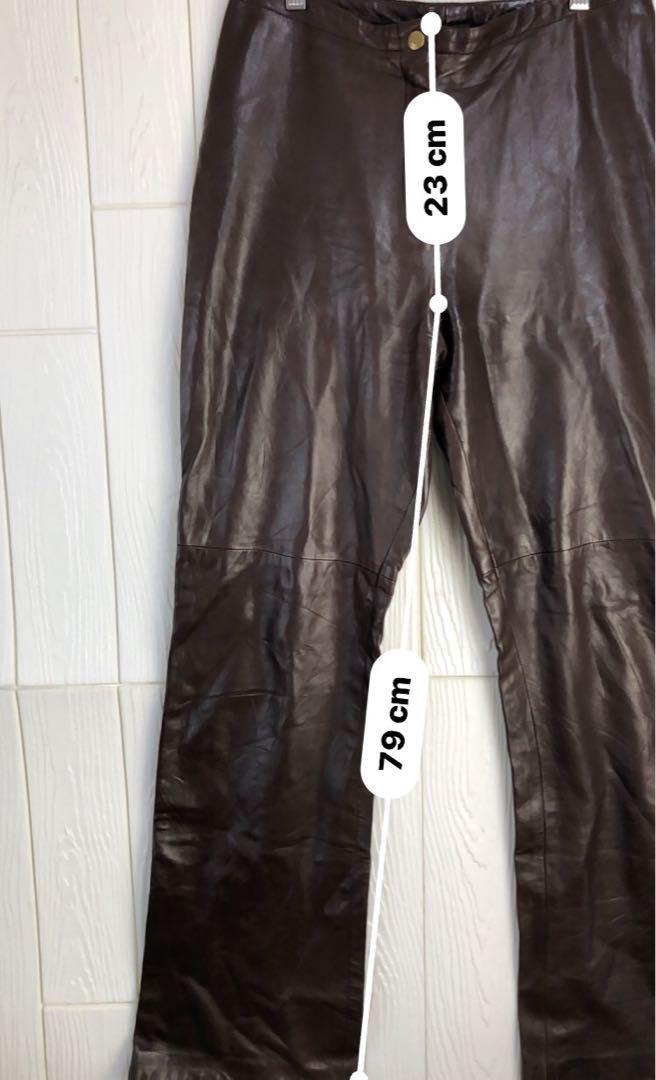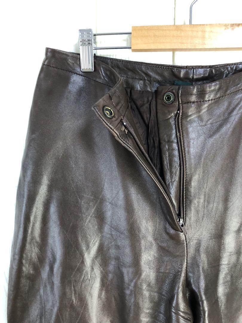 ダークブラウンのレザー製パンツ、ウエスト72cm、股下79cmのスタイリッシュなデザイン。