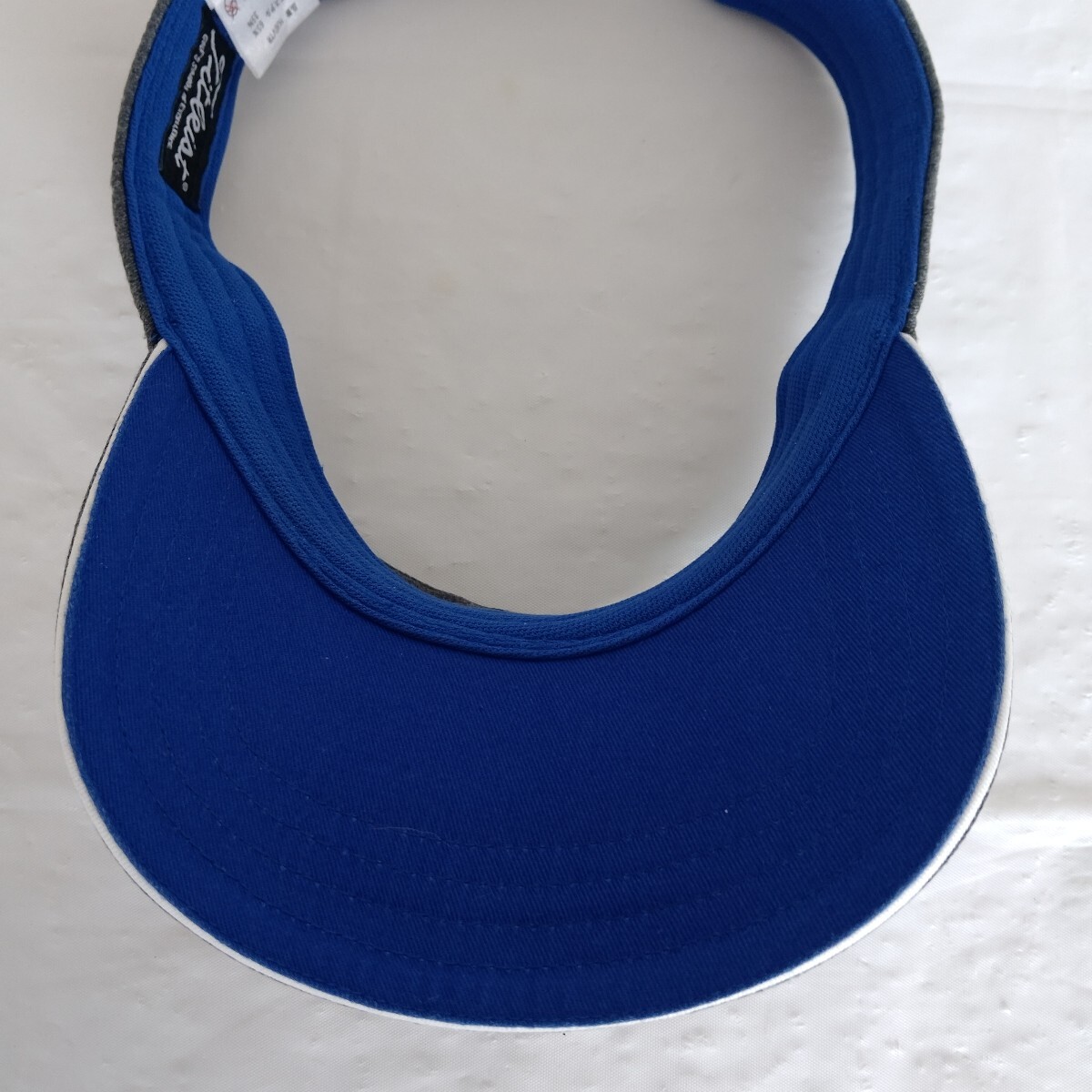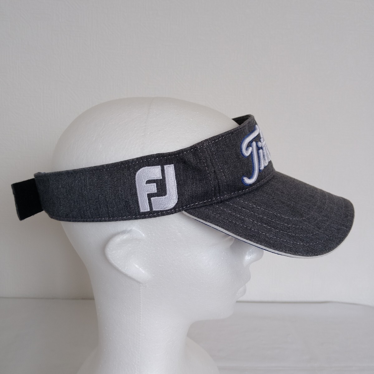 Titleist Pro V1 バイザー グレーです。色はグレー、フロントには『Titleist』の白のロゴ刺繍、左サイドには『PRO V1』の白の刺繍、右サイドには『FJ』フットジョイのロゴ刺繍、バイザー内側は青、後には白の四角刺繍にオレンジの縁取り刺繍、黒の『Titleist』のロゴ刺繍がデザインされているフットジョイとのコラボ商品です。
