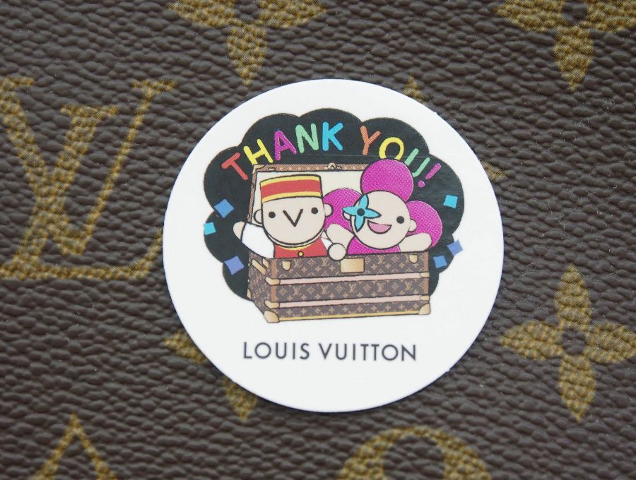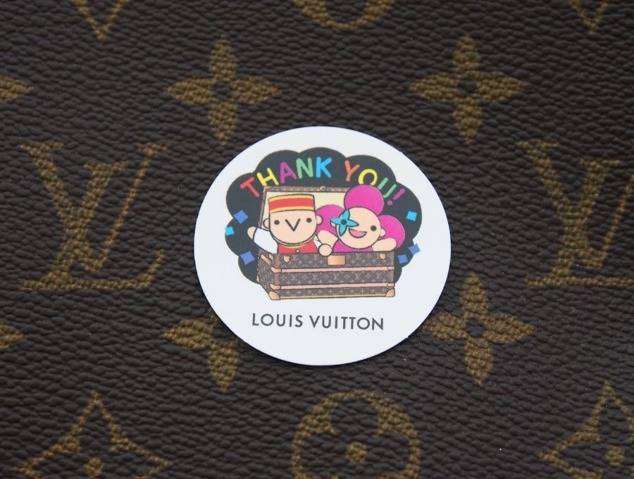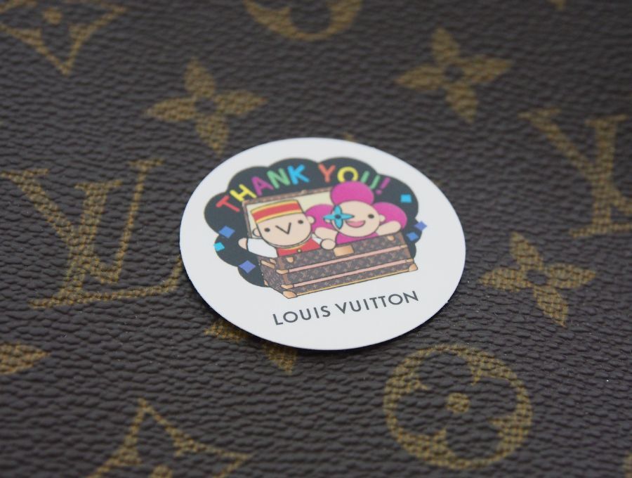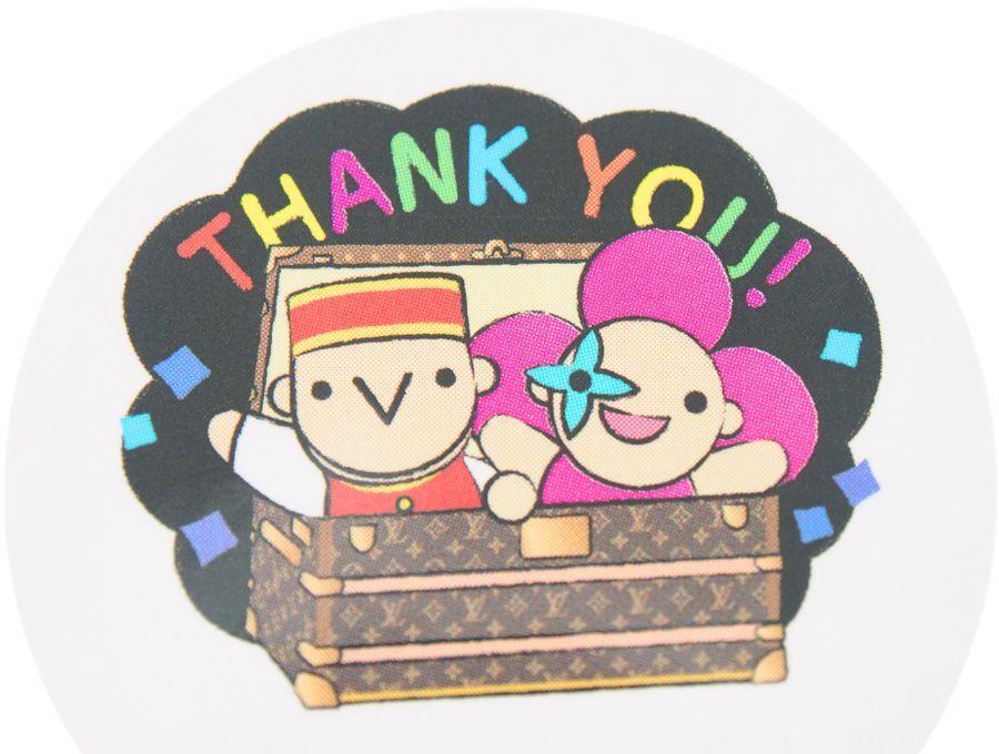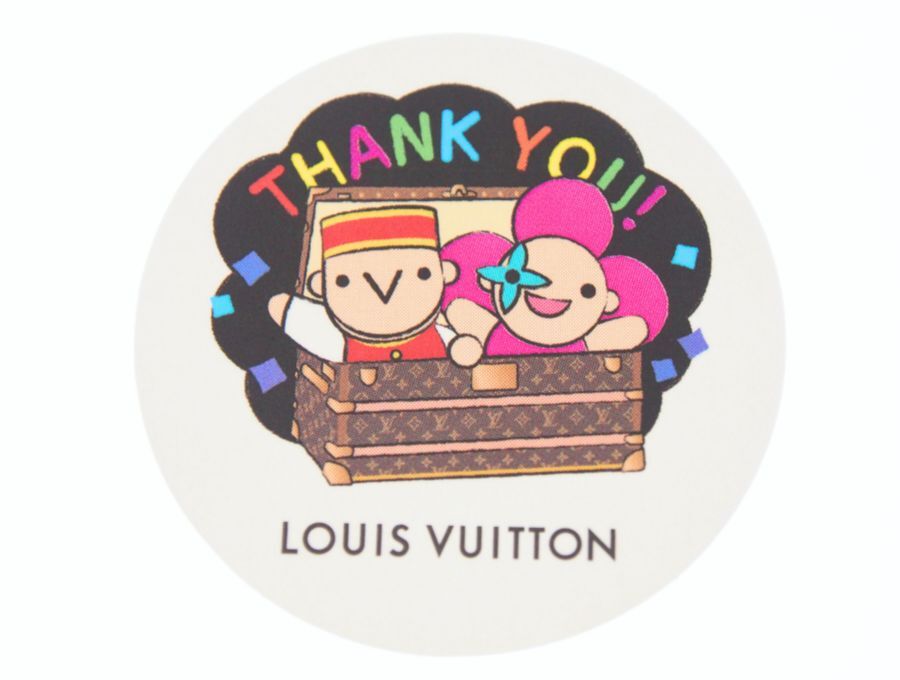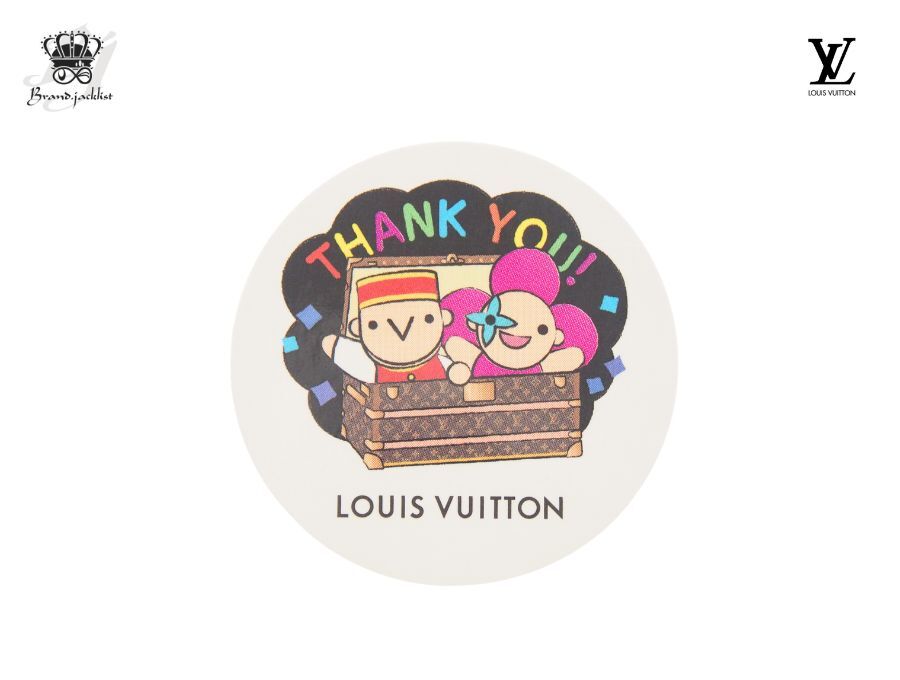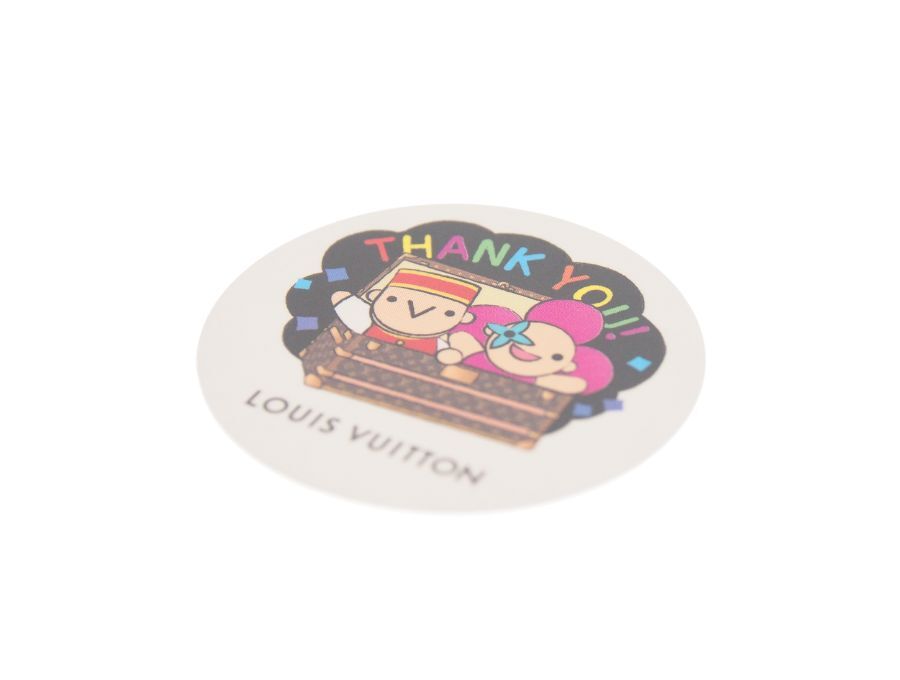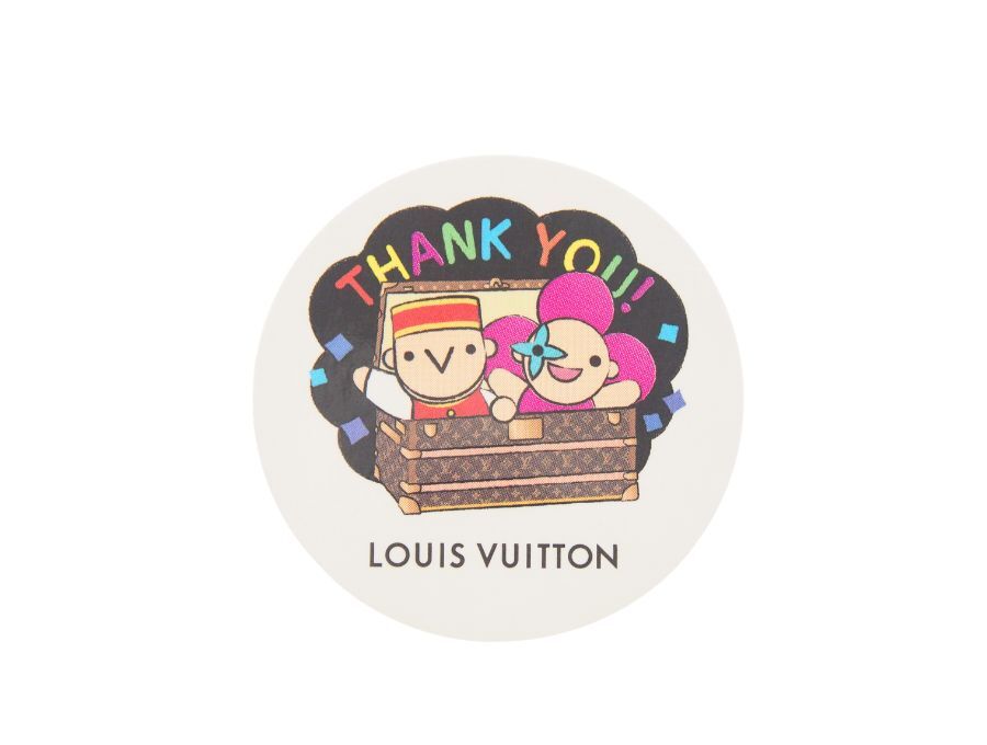 LOUIS VUITTONのノベルティシールになります。2017年に初登場したヴィトンのキャラクターの”ヴィヴィエンヌちゃん”と"ガストン・グルームくん"がモノグラム柄のトランクから「 Thank you!」と御礼を言っている、丸い形をしたポップなステッカーになっています。店頭でも配られた事があるミニステッカーですが、希少なお品になります。