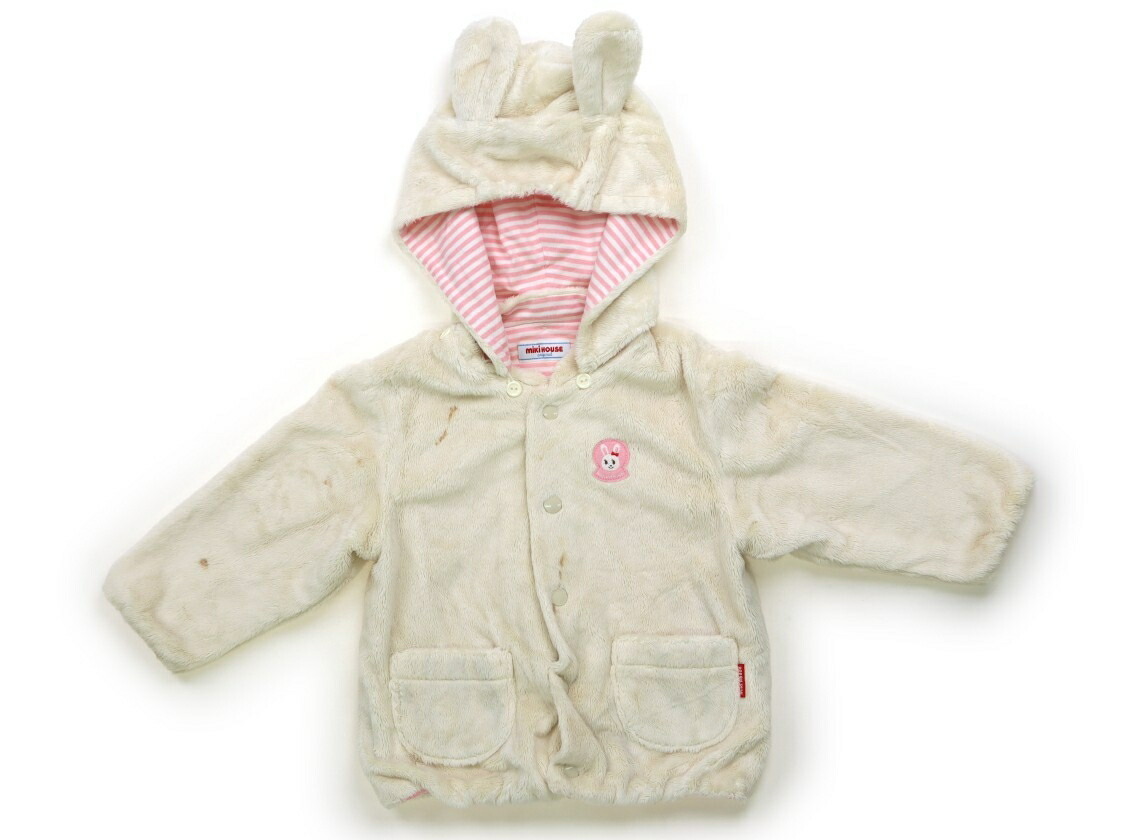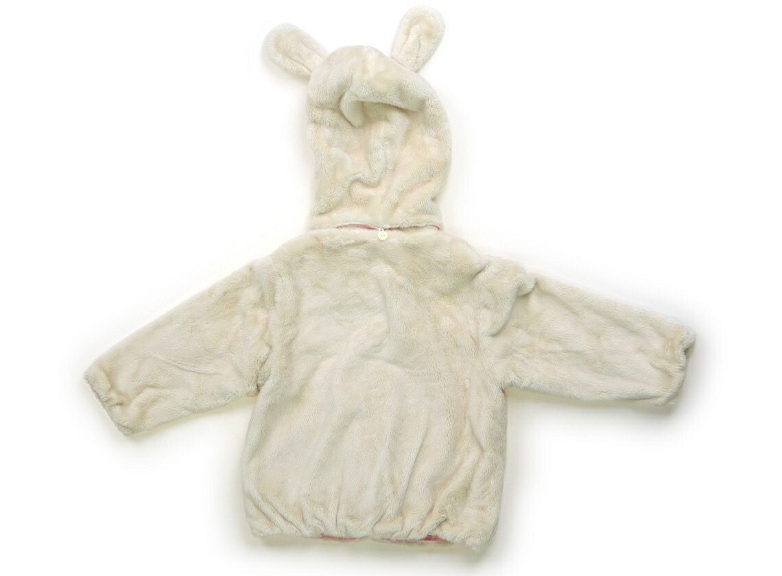 実際のサイズ表記はS70-80。フードの取り外しが可能です。フェイクファーにカットソー生地の裏地がついています。スナップボタン留め。お腹・袖・胸に目立つ茶色いシミ汚れが見受けられます。外遊びや洗い替え用にいかがでしょうか?
