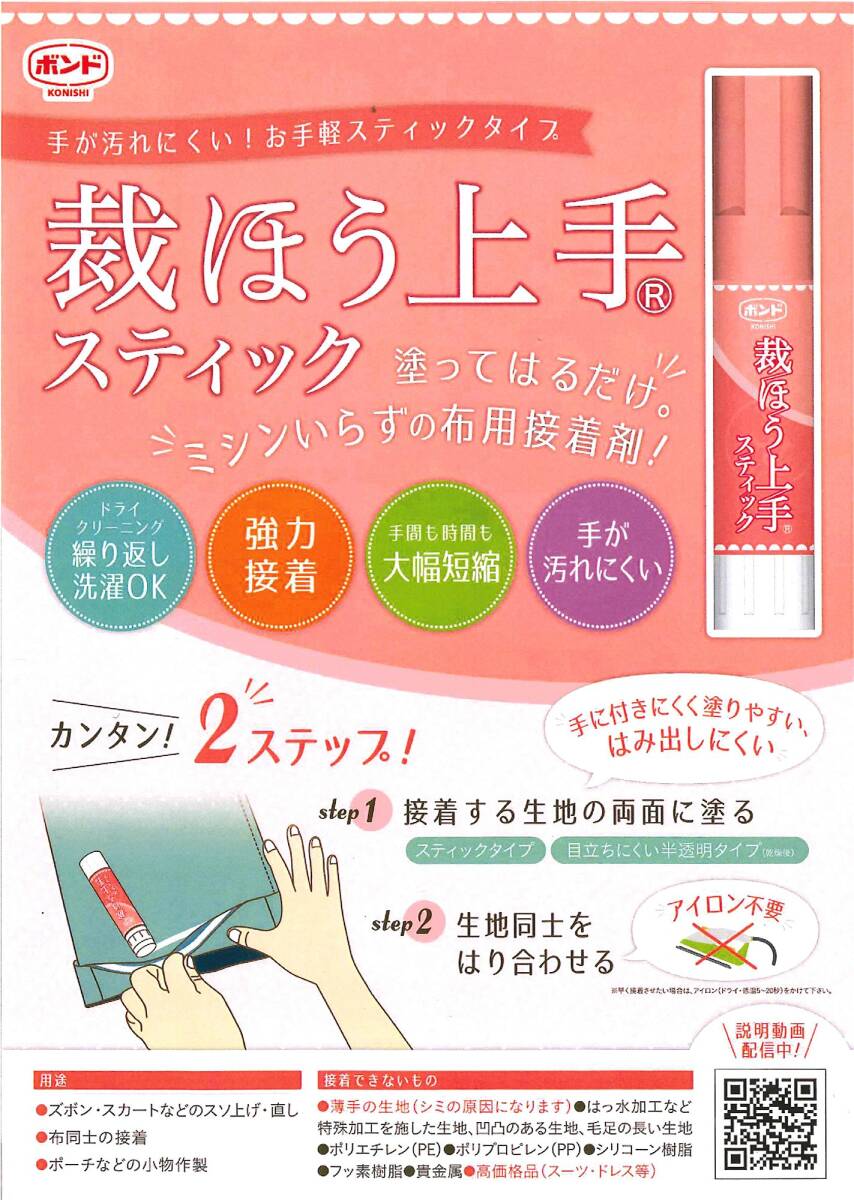 スティックタイプで手につきにくく、カンタン塗りやすい!ミシンいらずの布用接着剤 「裁ほう上手」のスティックタイプ。お得な2本セットです。