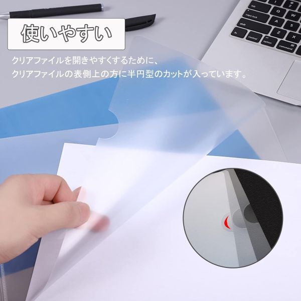 【半円型のカットで使いやすい】クリアファイルを開きやすくするために、クリアファイルの表側上の方に半円型のカットが入っています。下の方に三角の切れ込みが入っていて、力が分散し素材が破れる事を防止できます。バックにも入れやすく、持ち歩きにとても便利です。