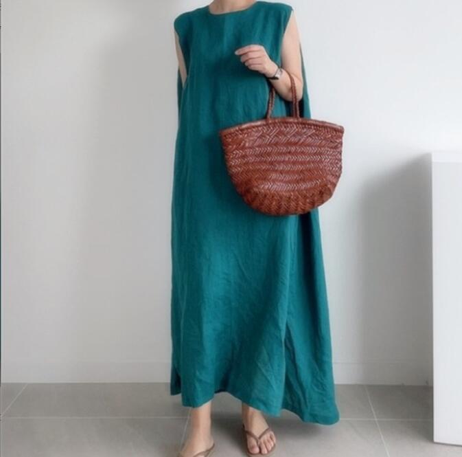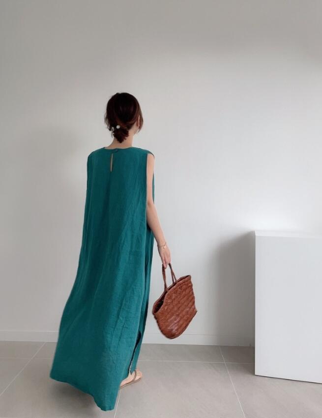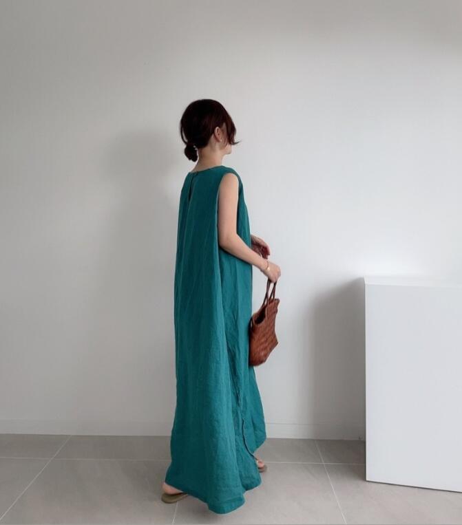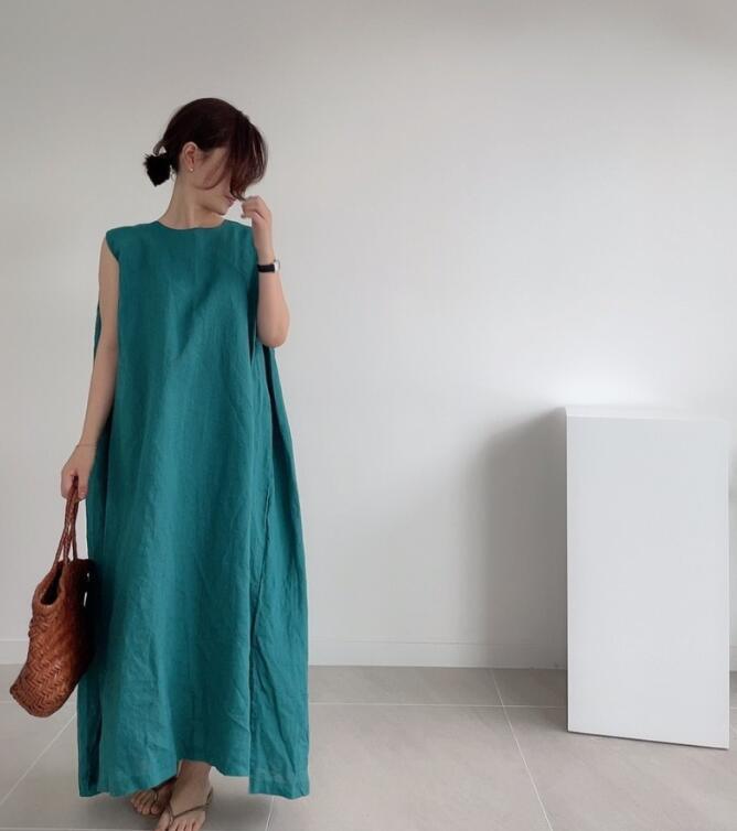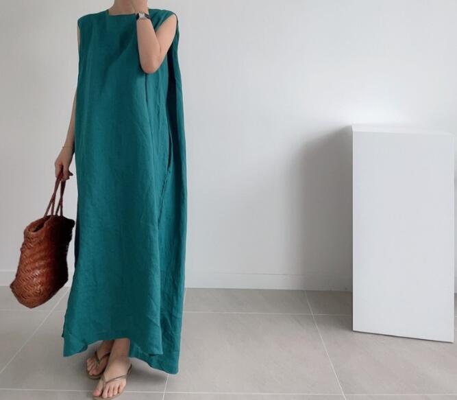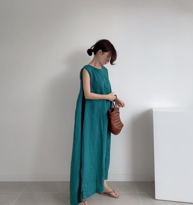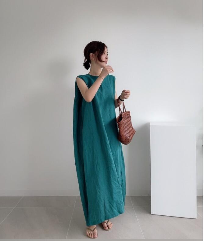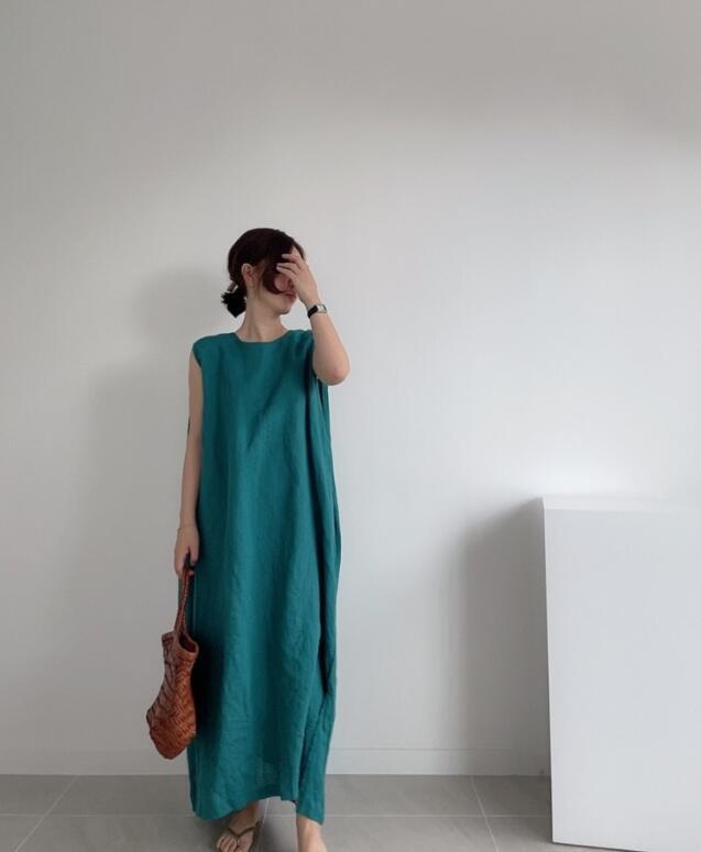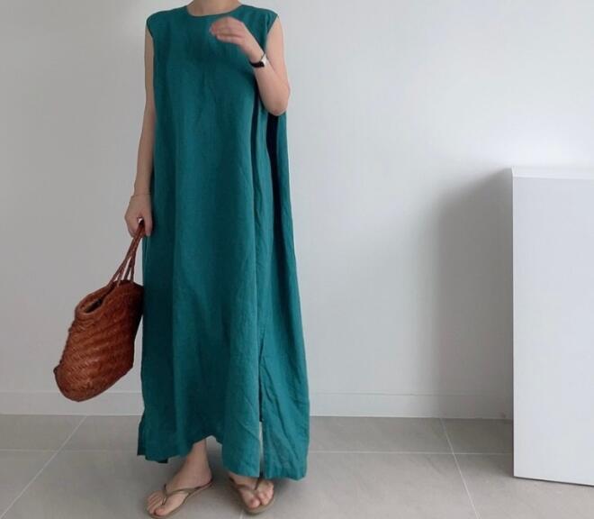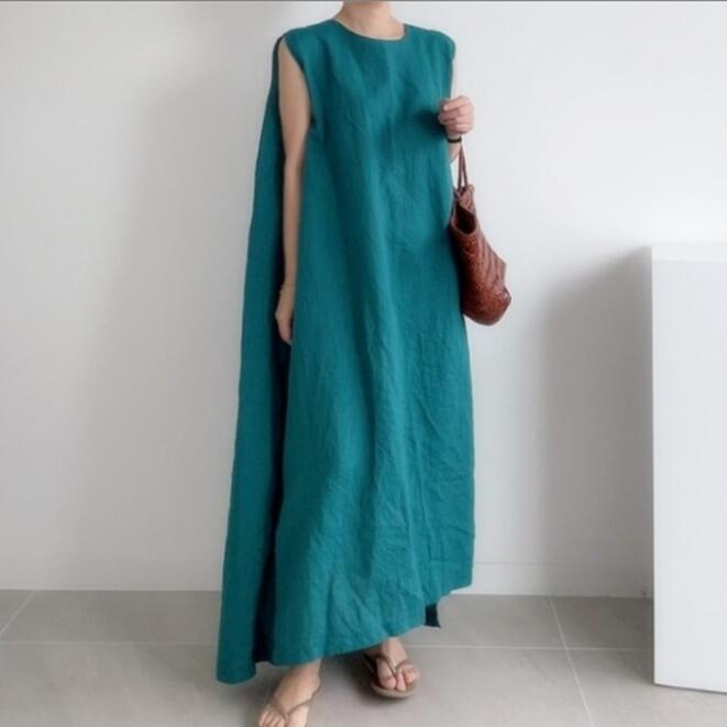 人気品 新品孔雀 ロングワンピース ワンピースノースリーブワンピース 緑 韓国 ゆったり 体型カバー 無地 マキシ丈 フリーサイズ