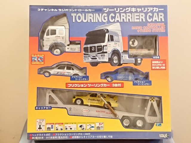 ご覧頂き有難うございます。トイコーのツーリングキャリアカーです。全長約64cmと大型で迫力が有ります(主観)。積載するベンツ190E エボリューション?(3台付属)は1/24スケール位です。目立ちませんがウインドウに少しキズが有ります。ヘッドライト点灯・前進後退ステアは動きますがトレーラーを外す機能が作動しません。電池BOXにさびなどはありません。傷んでいますが元箱付きです。画像と下記説明をご参照の上宜しくお願い致します。