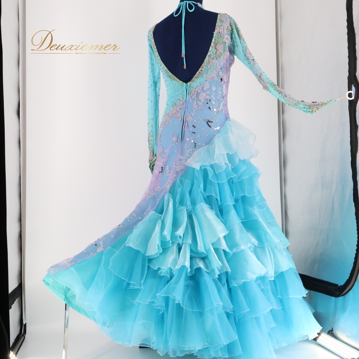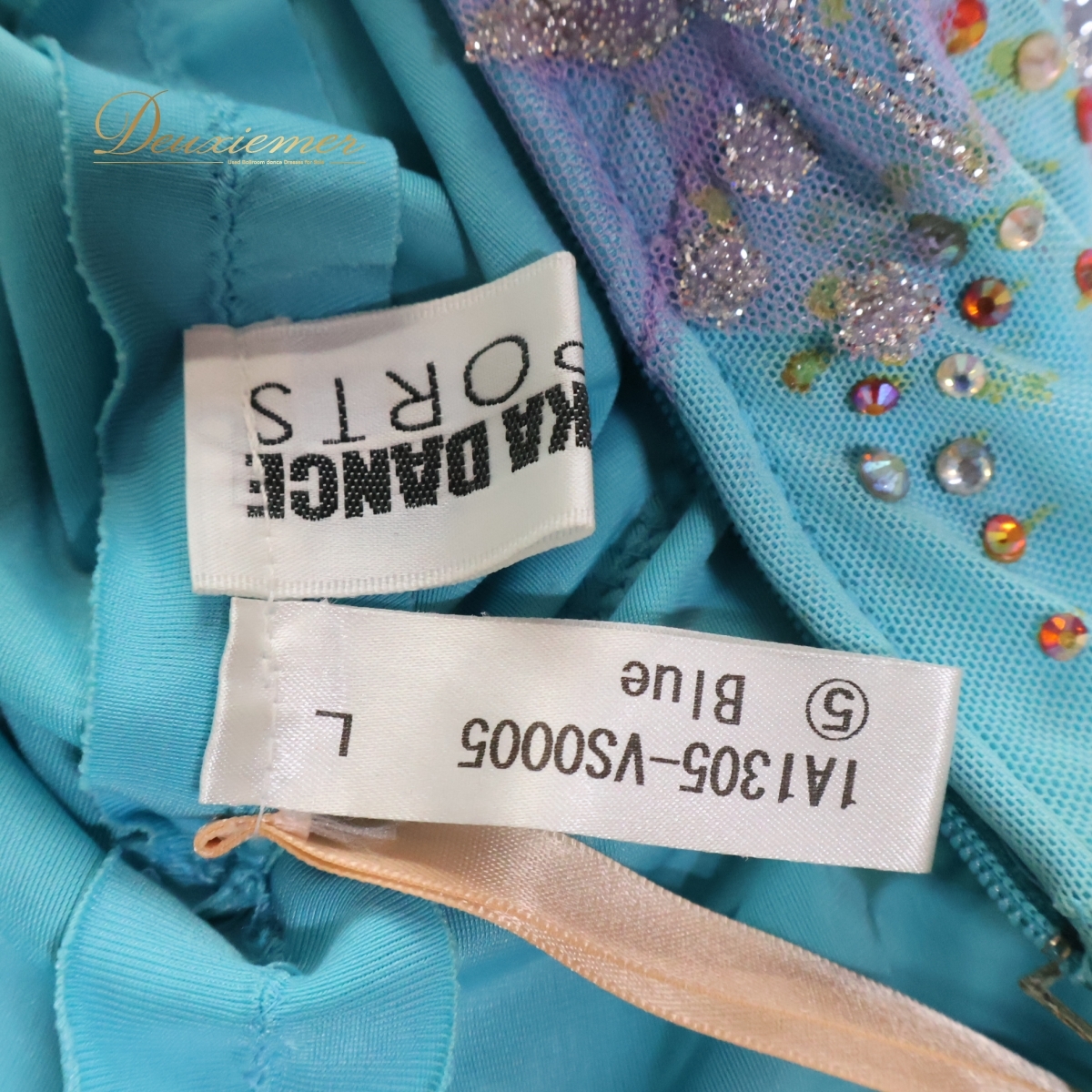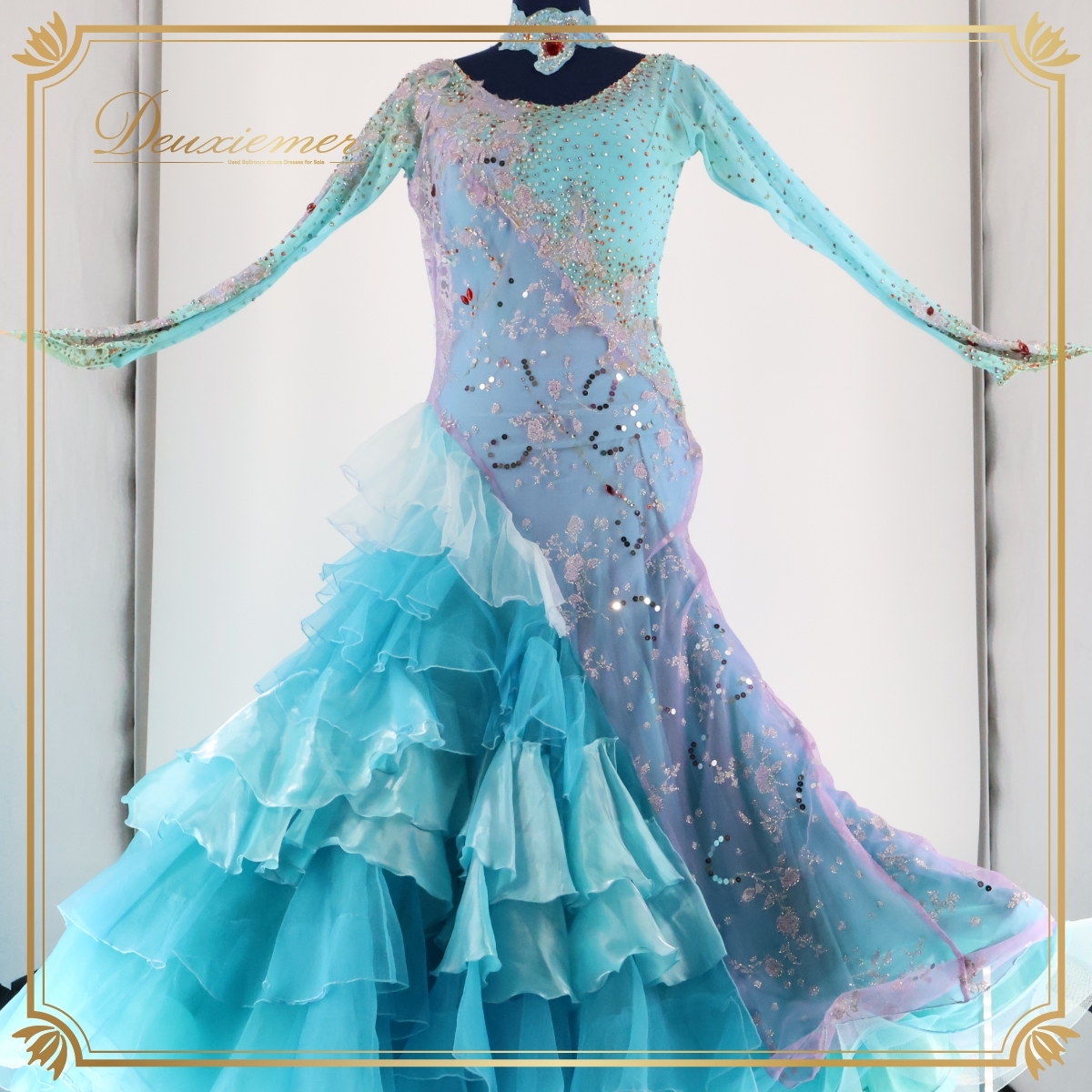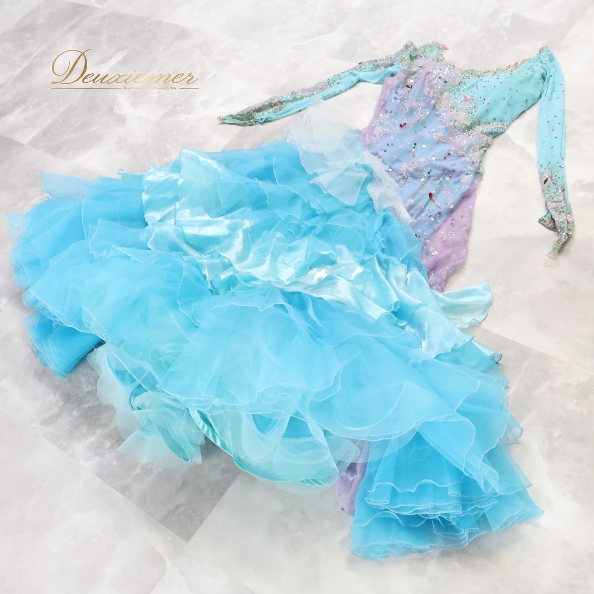 | 【商品名】社交ダンス 衣装 ワンピース ドレス 【サイズ】L表記 平置き実測:総丈約140cm(裾~肩部まで)、身幅約41cm、ウエスト約30cm~ ※実測の為、多少の誤差はご了承ください 【仕様】 ・背面ファスナー仕様 ・レオタード(ボタン)仕様 ・上半身の伸縮性有り ・肩パッド無し ・胸パッド有り ------------------------------------ 【ポイント】 ▽TAKADANCE タカダンス ▽明るい水色×ラベンダーカラー ▽特徴的なデザインでふんわり広がるスカート3枚重ね ------------------------------------ 【撮影時使用トルソー】 種 類:女性用トルソー9号 (一般的に使用されるサイズです) サイズ:肩幅約37cm、バスト約88cm、ウエスト約66cm、ヒップ約89cm |