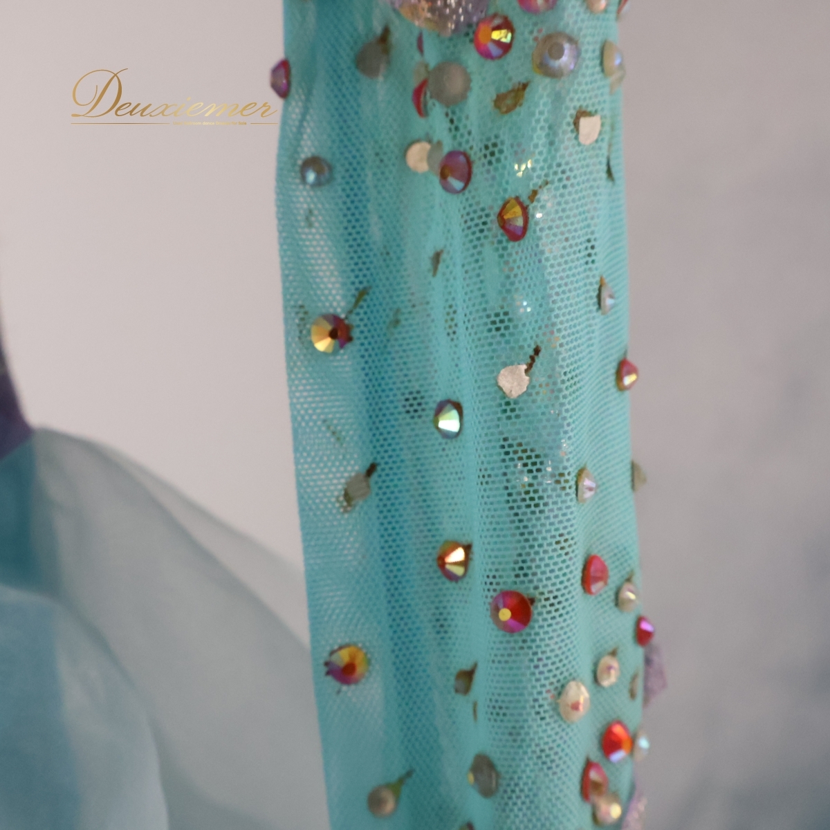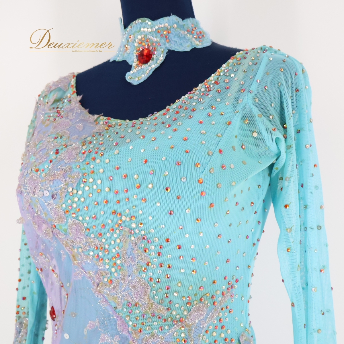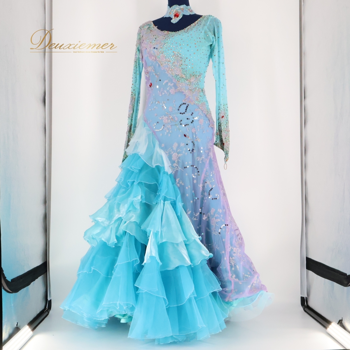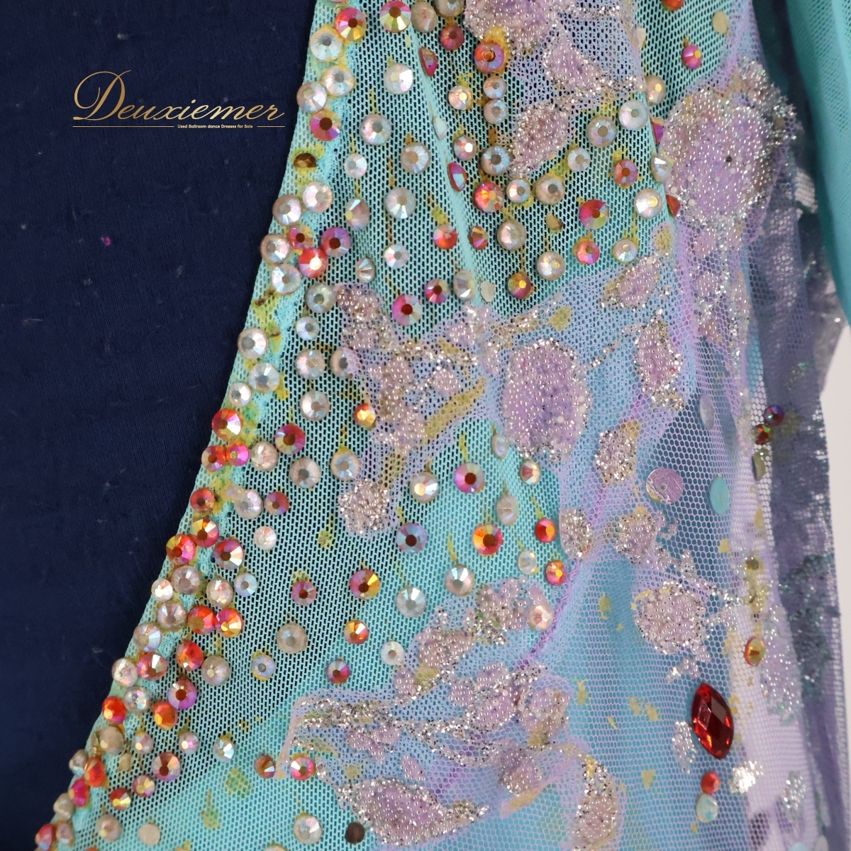 | 【商品名】社交ダンス 衣装 ワンピース ドレス 【サイズ】L表記 平置き実測:総丈約140cm(裾~肩部まで)、身幅約41cm、ウエスト約30cm~ ※実測の為、多少の誤差はご了承ください 【仕様】 ・背面ファスナー仕様 ・レオタード(ボタン)仕様 ・上半身の伸縮性有り ・肩パッド無し ・胸パッド有り ------------------------------------ 【ポイント】 ▽TAKADANCE タカダンス ▽明るい水色×ラベンダーカラー ▽特徴的なデザインでふんわり広がるスカート3枚重ね ------------------------------------ 【撮影時使用トルソー】 種 類:女性用トルソー9号 (一般的に使用されるサイズです) サイズ:肩幅約37cm、バスト約88cm、ウエスト約66cm、ヒップ約89cm |