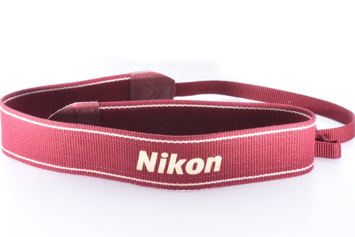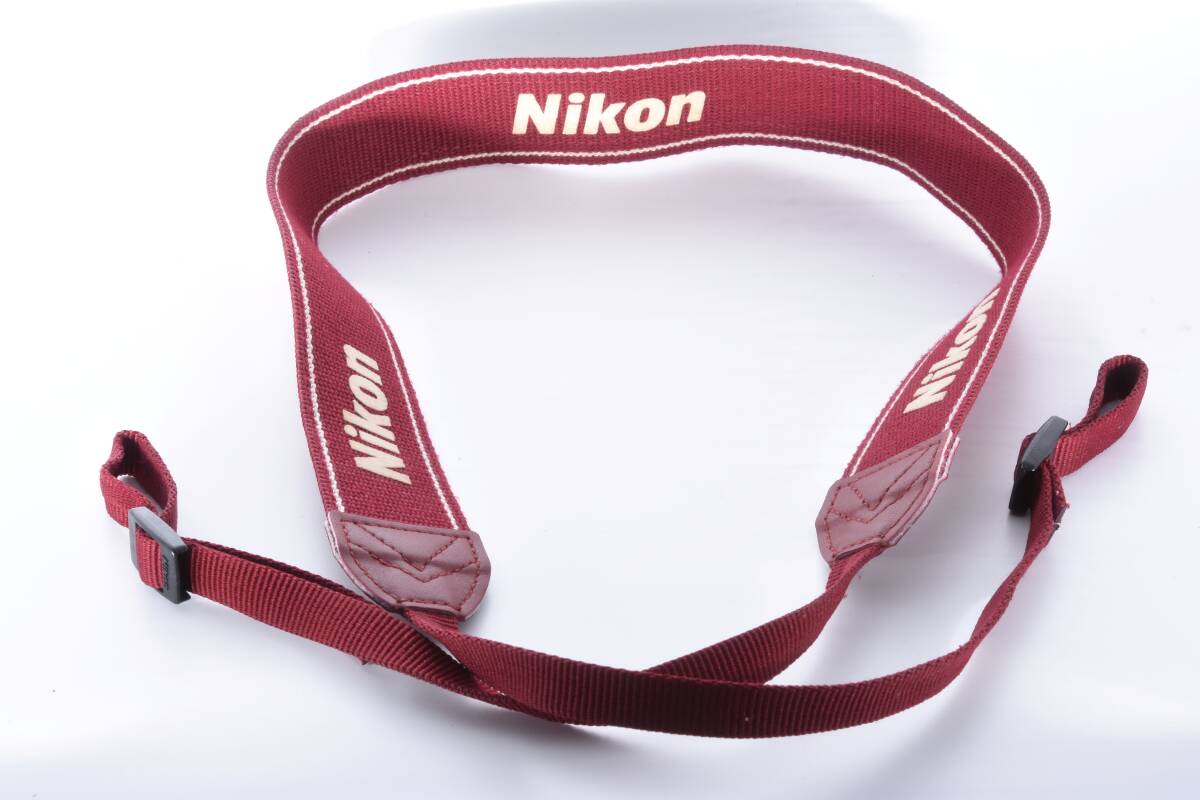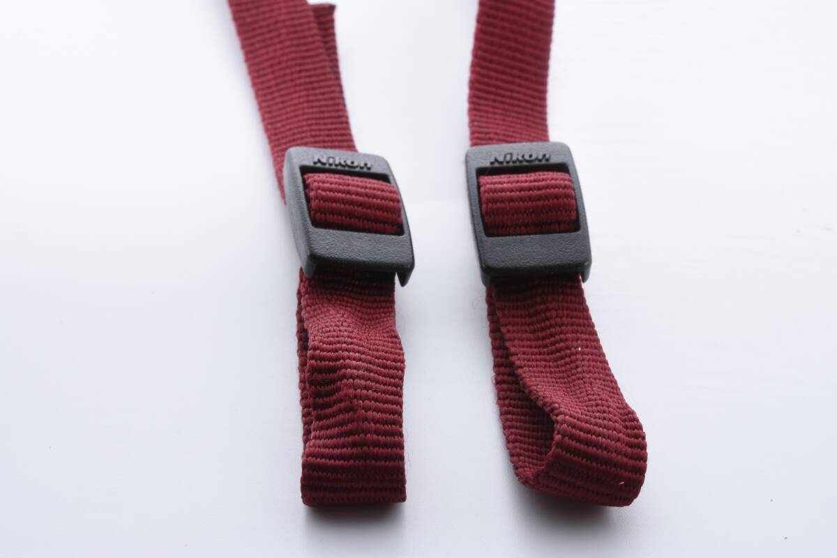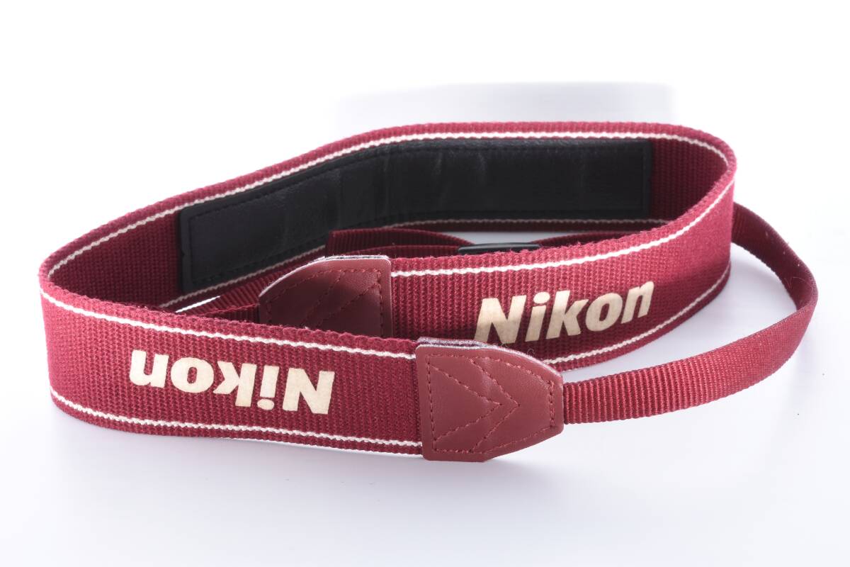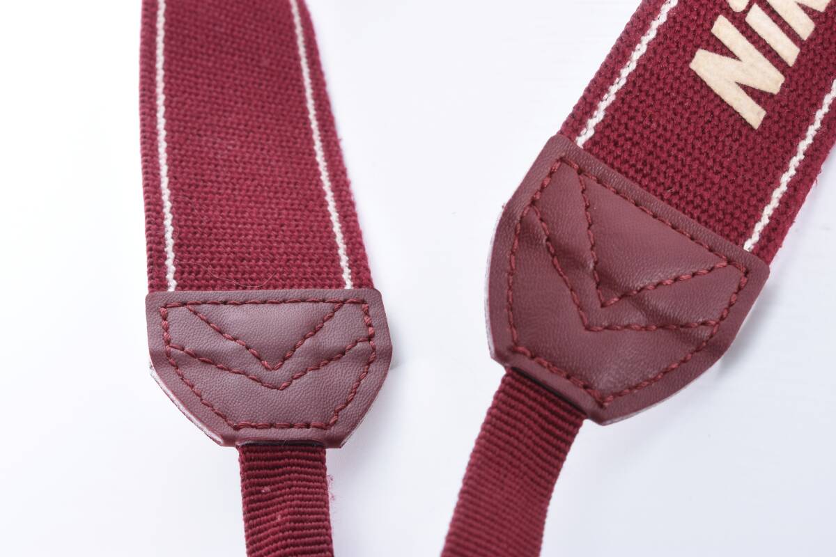 ナイロン製のバーガンディカメラストラップ、Nikonロゴ入りで耐久性があります。