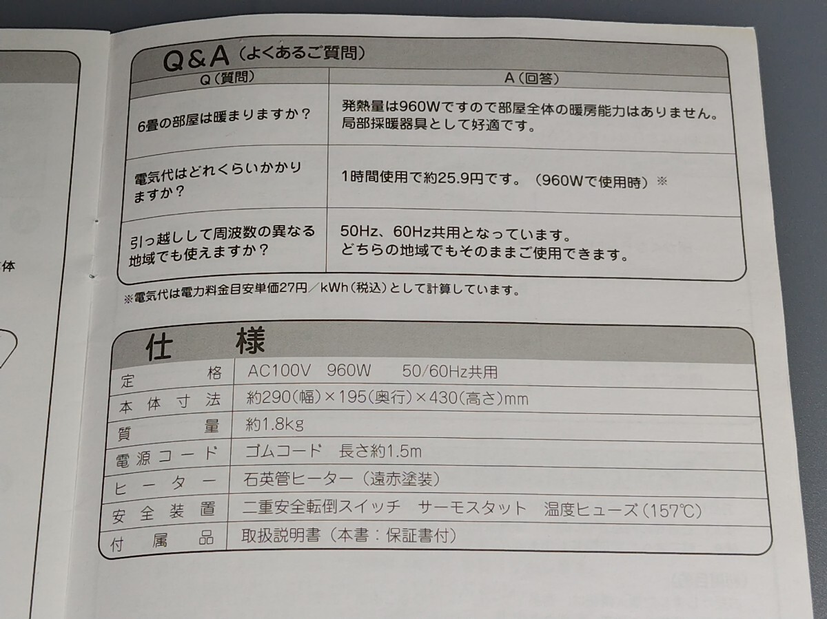 ★電気代 1時間使用で25.9円(960Wで使用時)