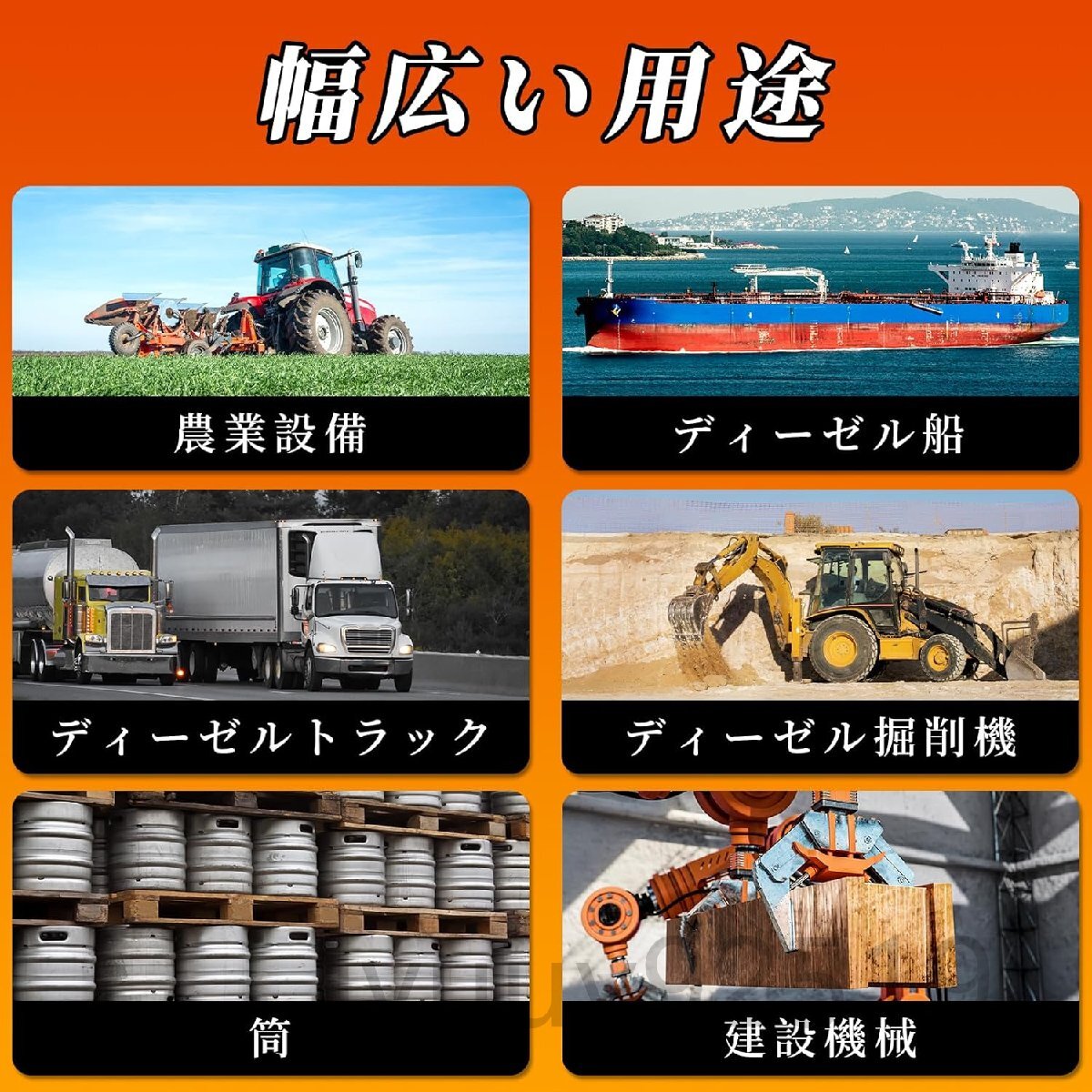 【幅広い用途】一般産業機器、医療機器、化学機器、農業機械、漁船、自動車、小型燃料補給などに適用されています。