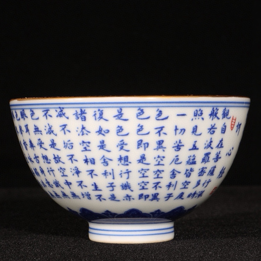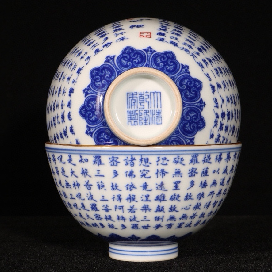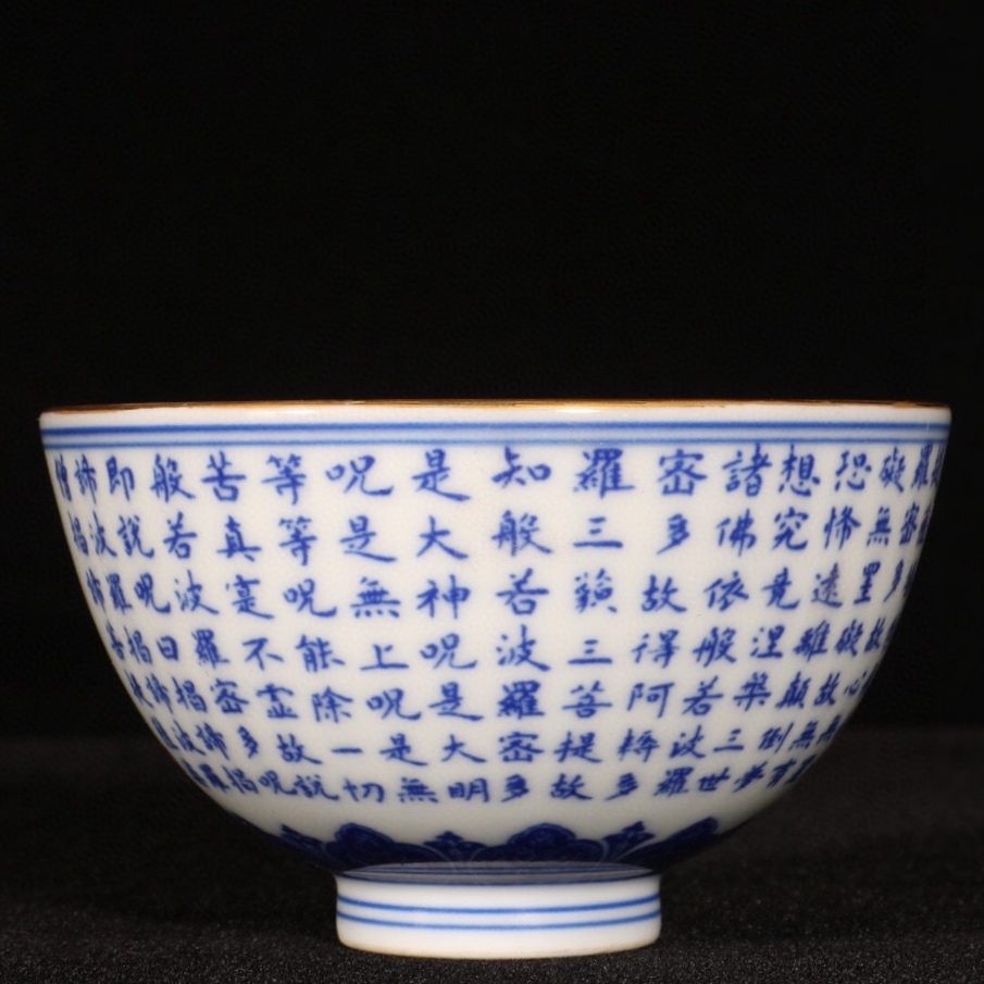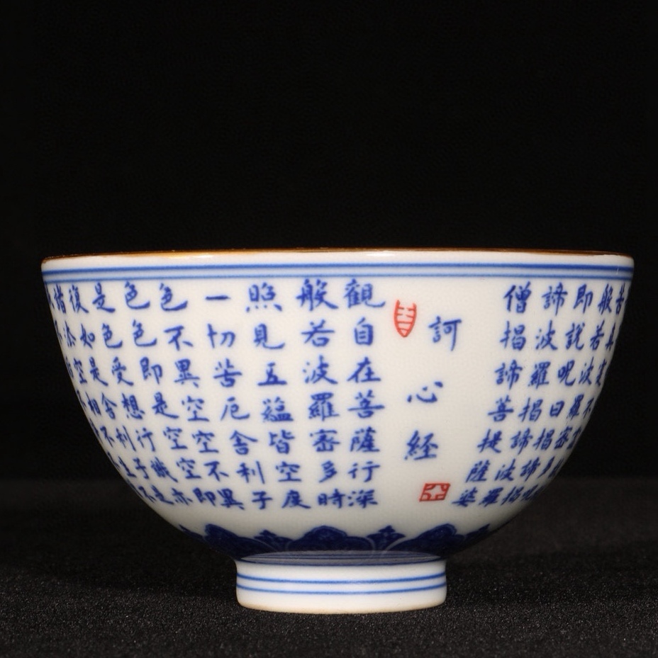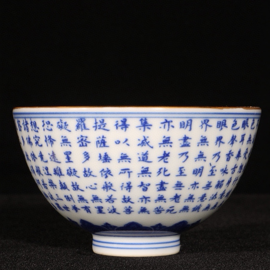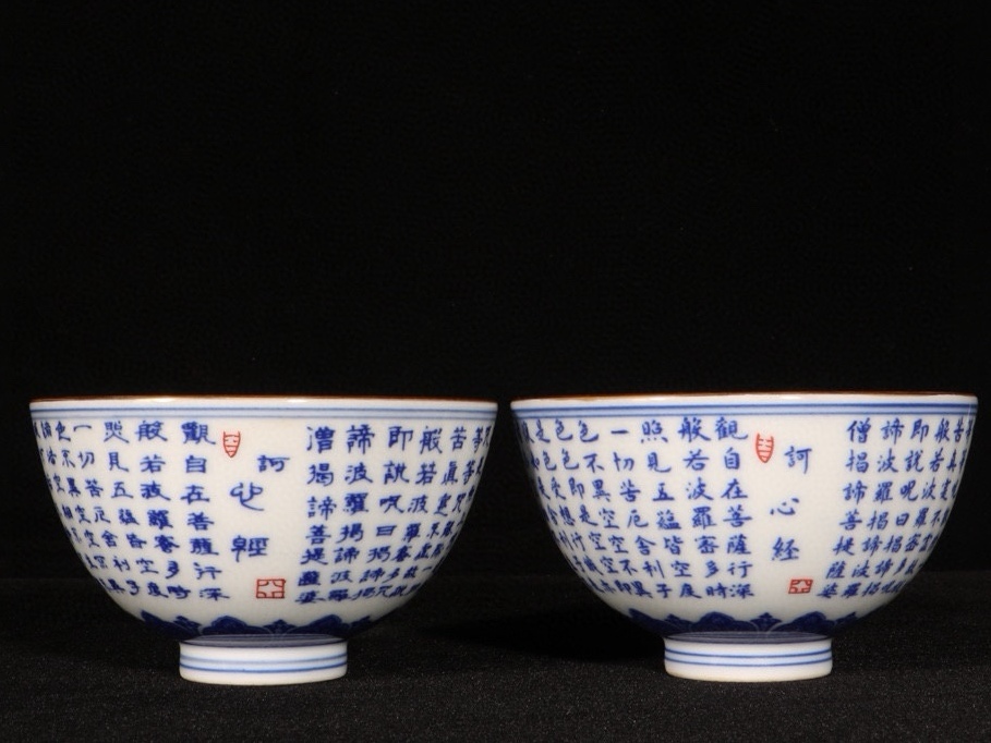 旧蔵 清 乾隆年製 青花 描金心經紋 杯一對 陶芸 磁器 中国磁器 極細工 中国古玩 骨董品 古美味 207
