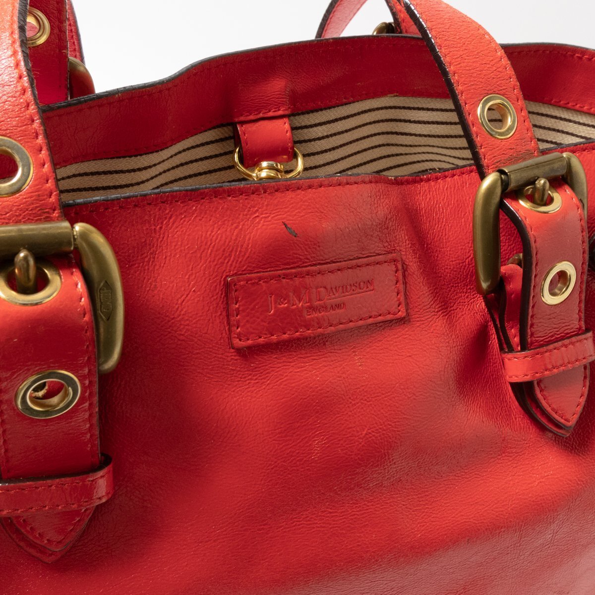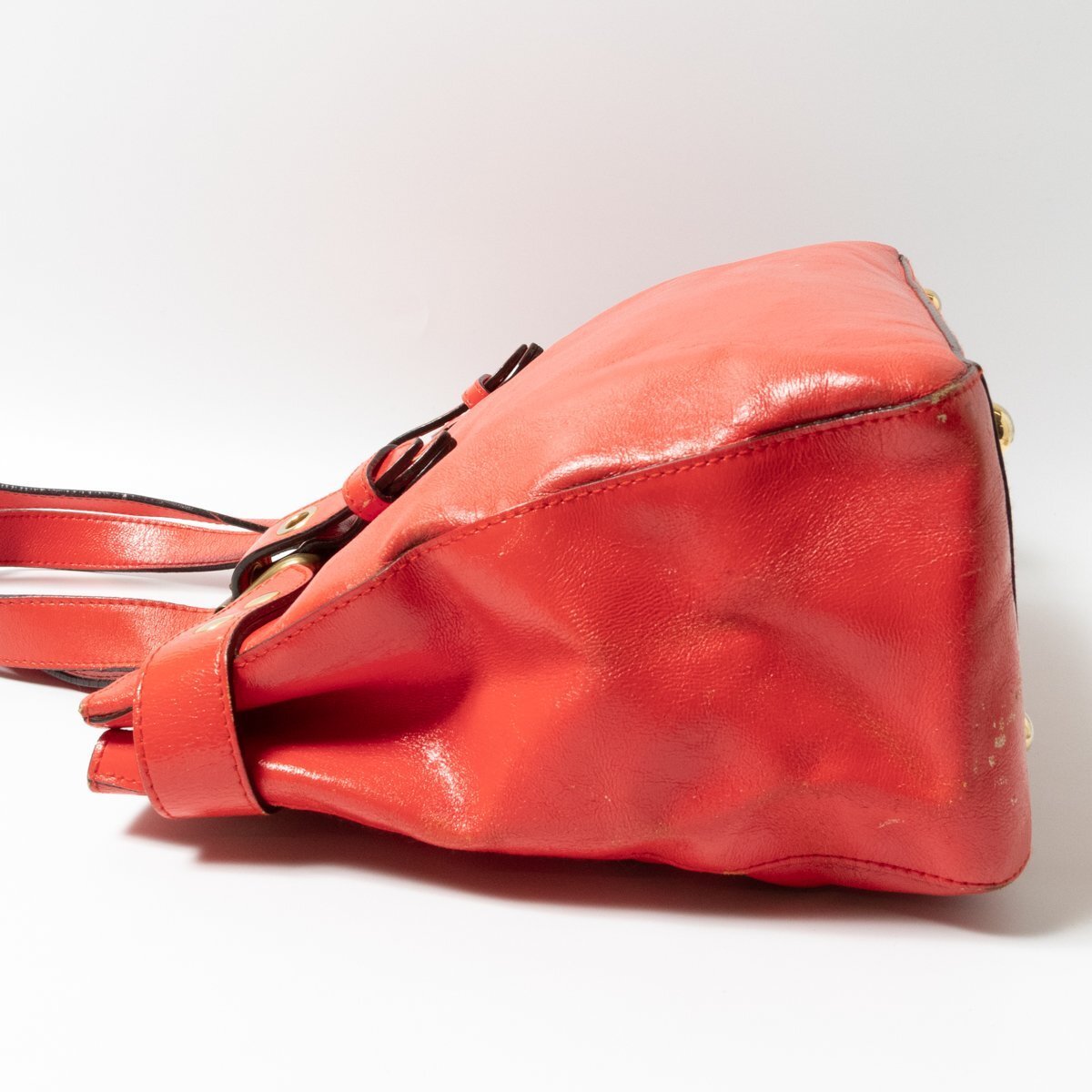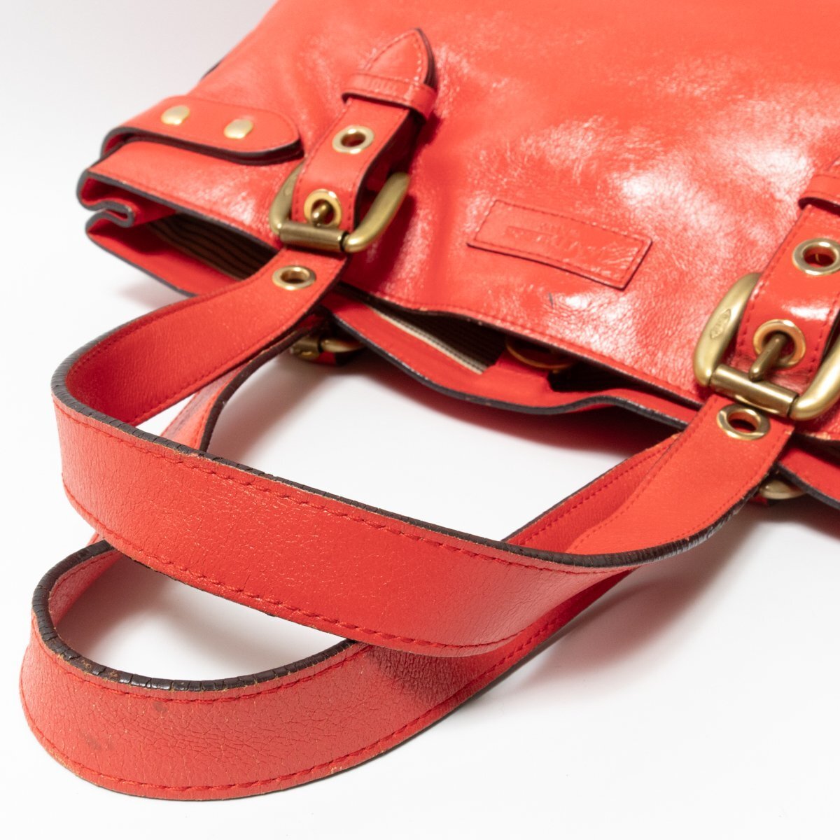 状態 | D:保管上の折れジワ、レザーにシワ・スレ傷・薄汚れや汚れ・コーティング剥がれ、金具にスレ傷や変色やくすみ、持ち手と開口部のコバに亀裂や剥がれ、内側にスレや薄汚れやペン汚れがございます。 |