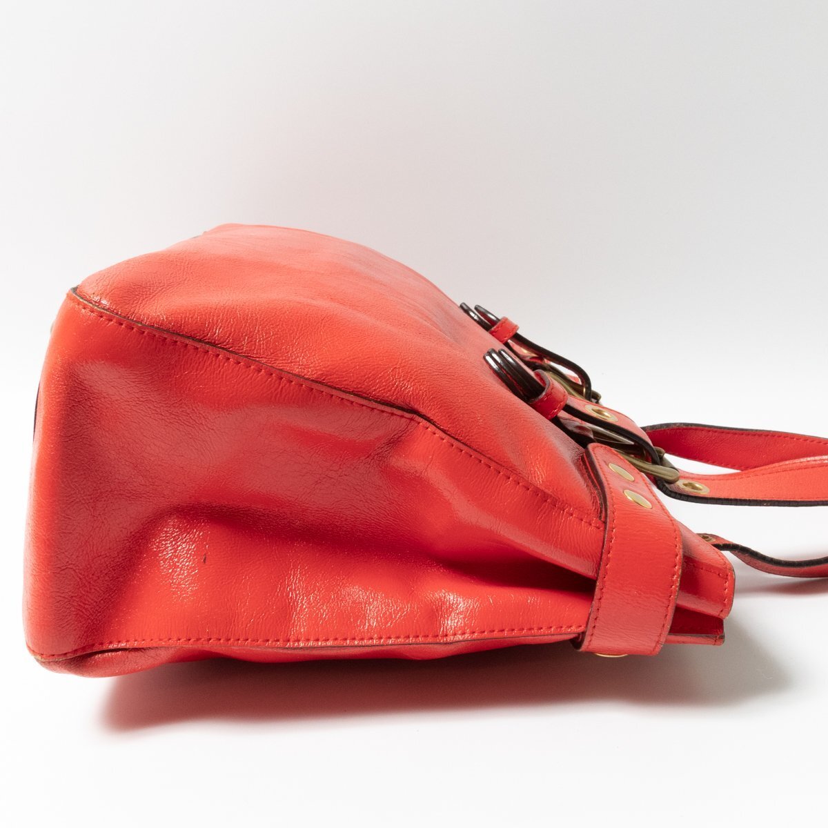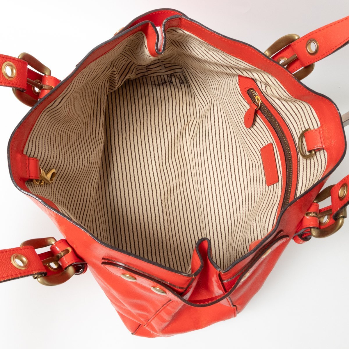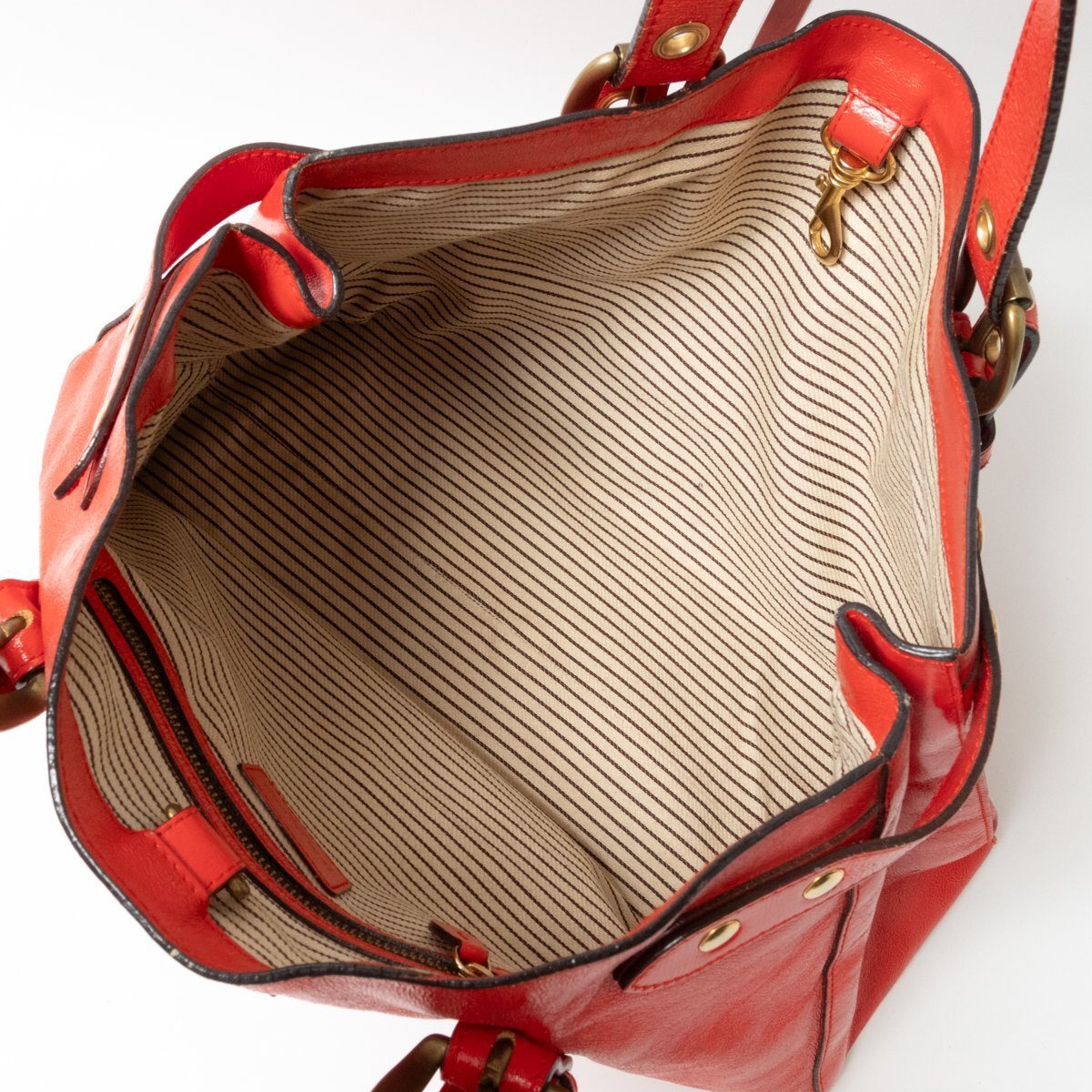 状態 | D:保管上の折れジワ、レザーにシワ・スレ傷・薄汚れや汚れ・コーティング剥がれ、金具にスレ傷や変色やくすみ、持ち手と開口部のコバに亀裂や剥がれ、内側にスレや薄汚れやペン汚れがございます。 |
