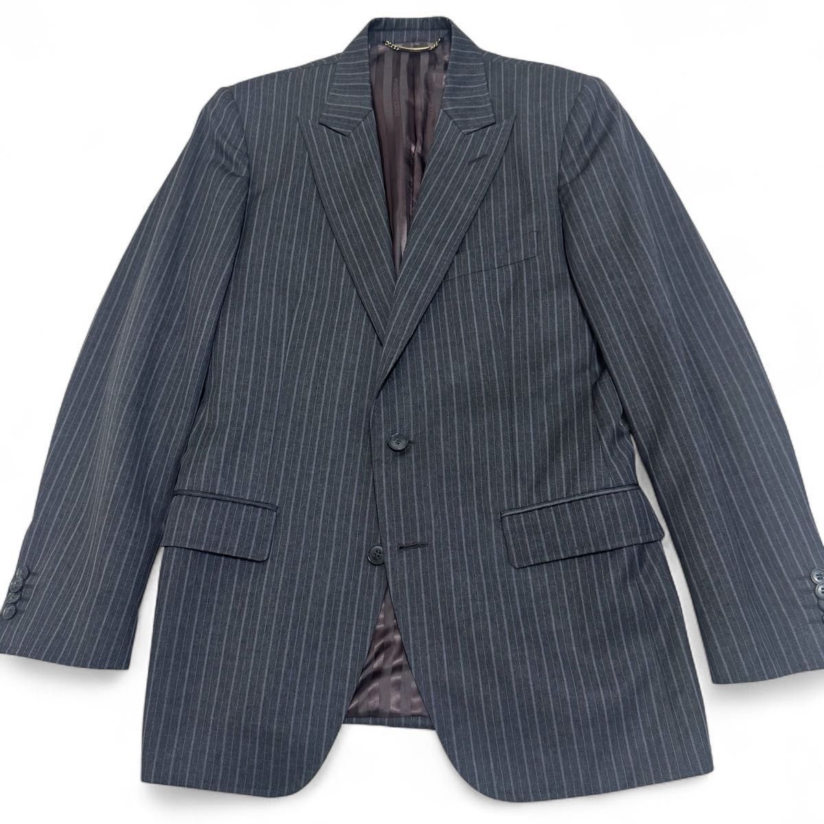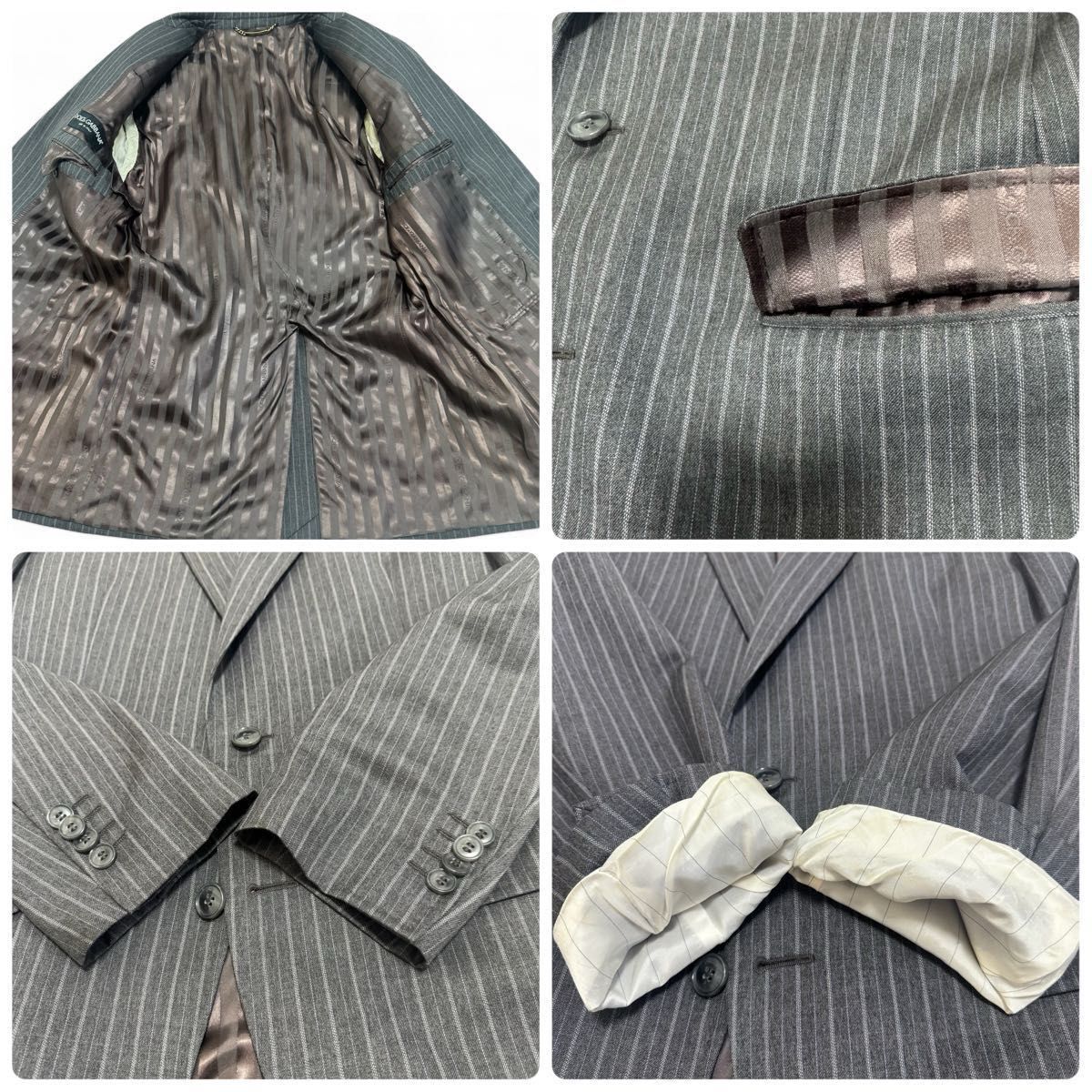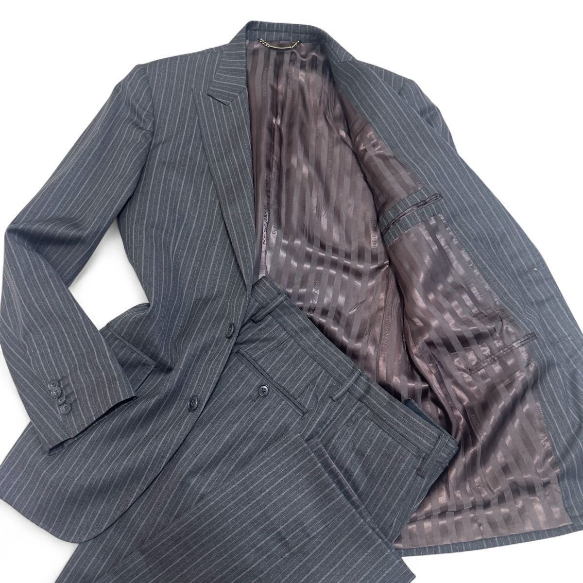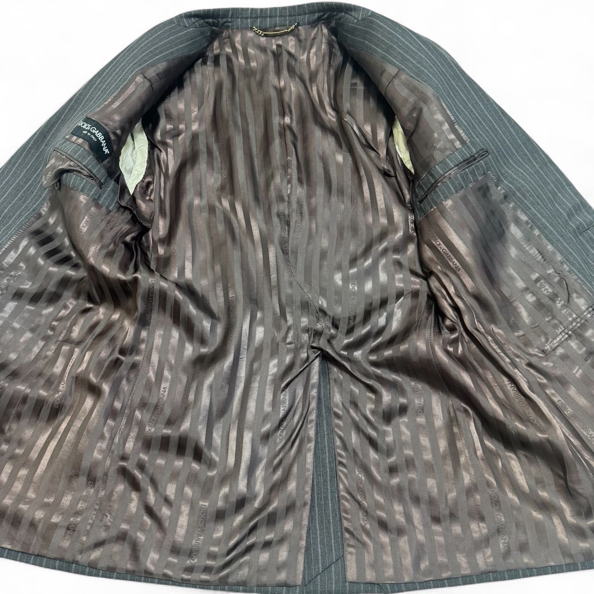 DOLCE&GABBANA ドルチェアンドガッバーナ virgin wool ヴァージンウール グレー GLAY ブラウン brown 茶 ストライプ 黒タグ 高級ライン ゴールド金具 チェーン セットアップ スーツ 裏地総柄 光沢 maid in ITALY イタリア製 LUXURY 最高級モデル 大きいサイズ 50 2B シングル 光沢