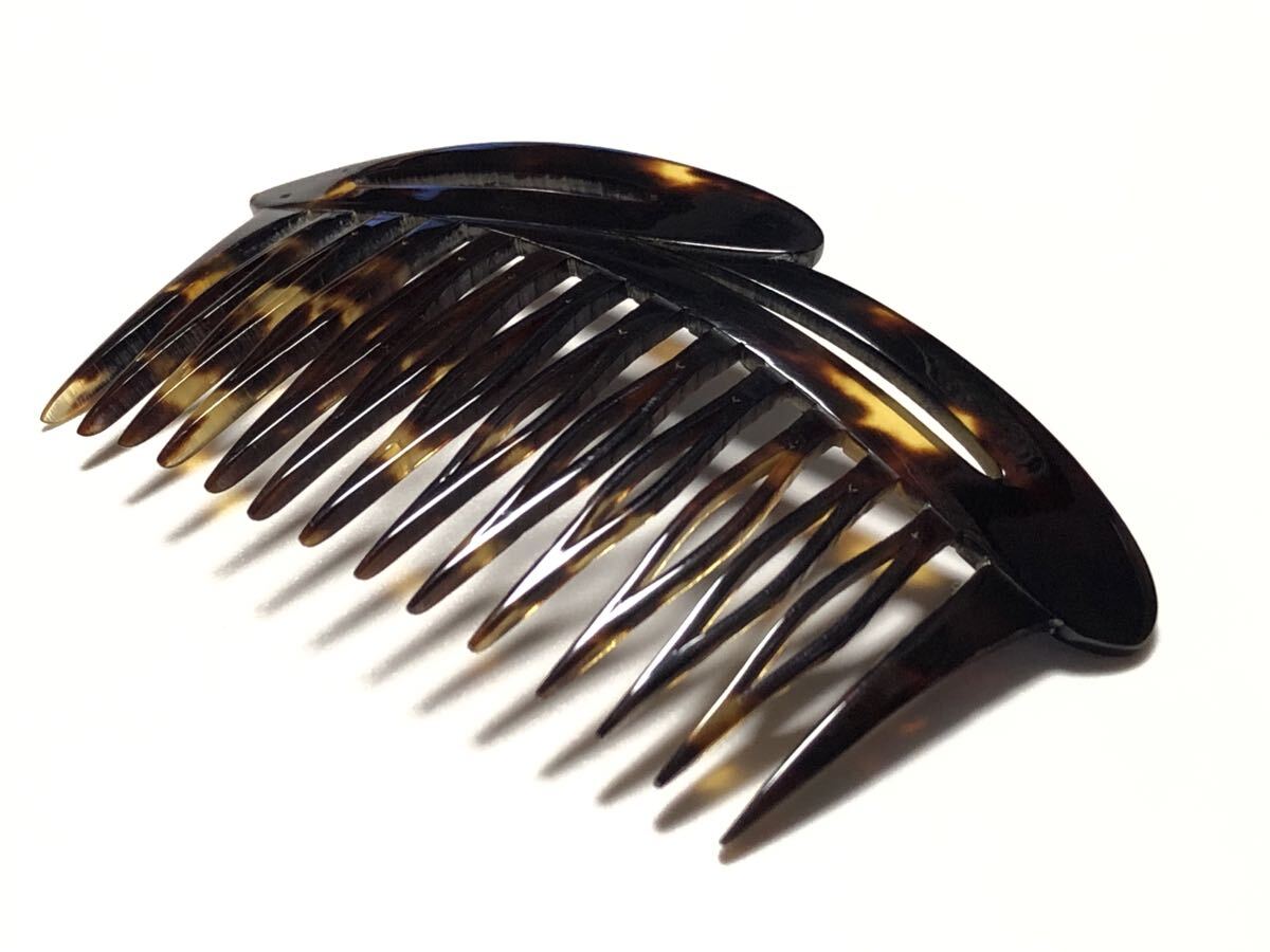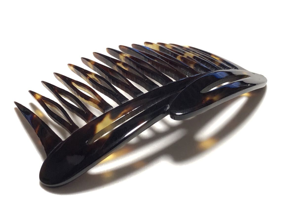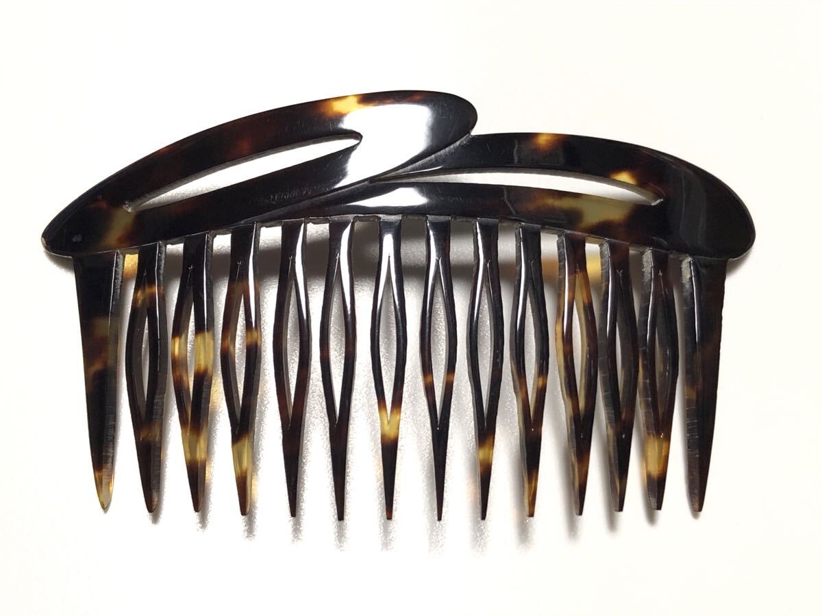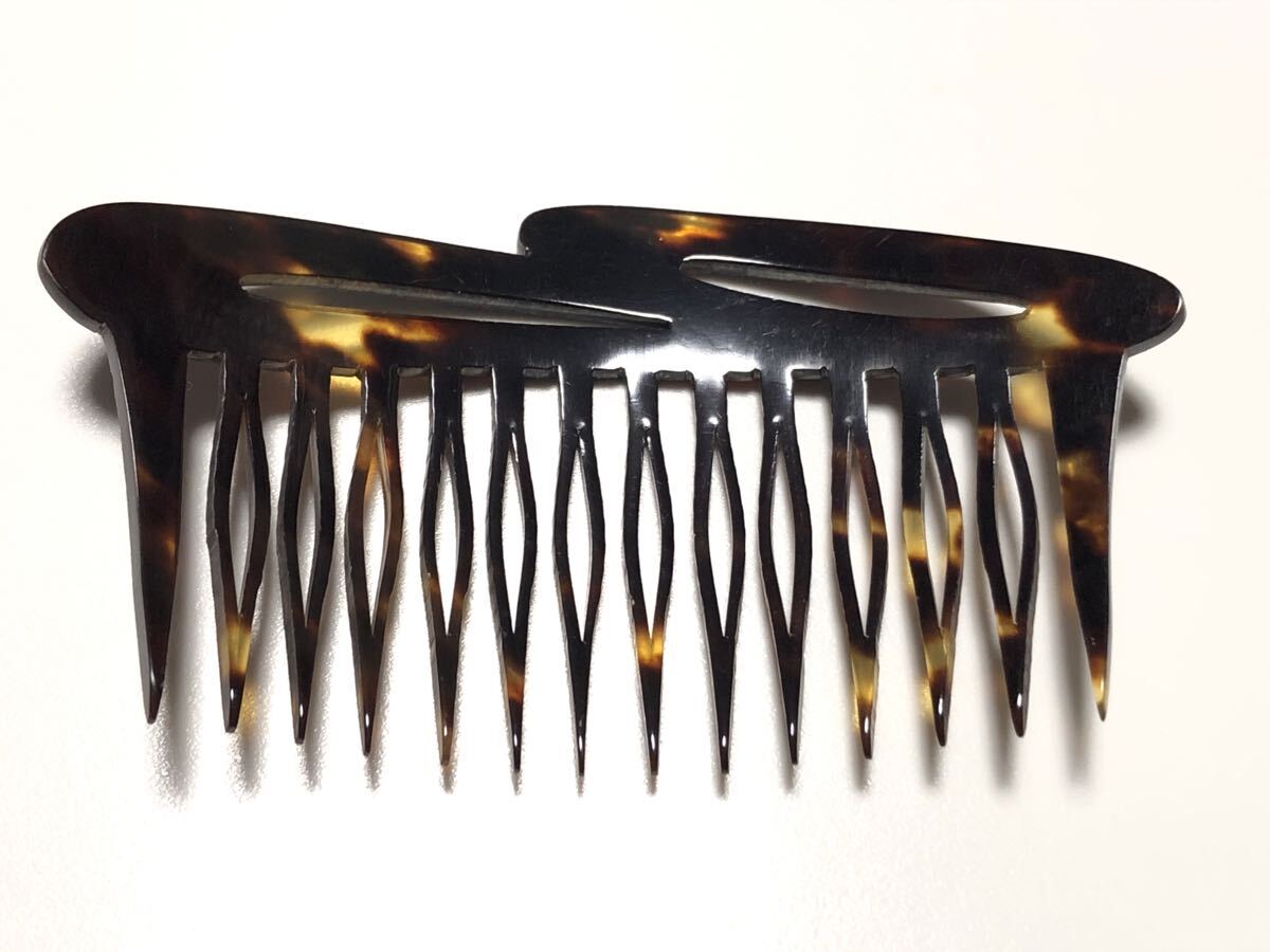 アンティークの本鼈甲を使用し、透かし細工を施した、デザイン櫛です。表面左上部に微細な虫食いがあります。