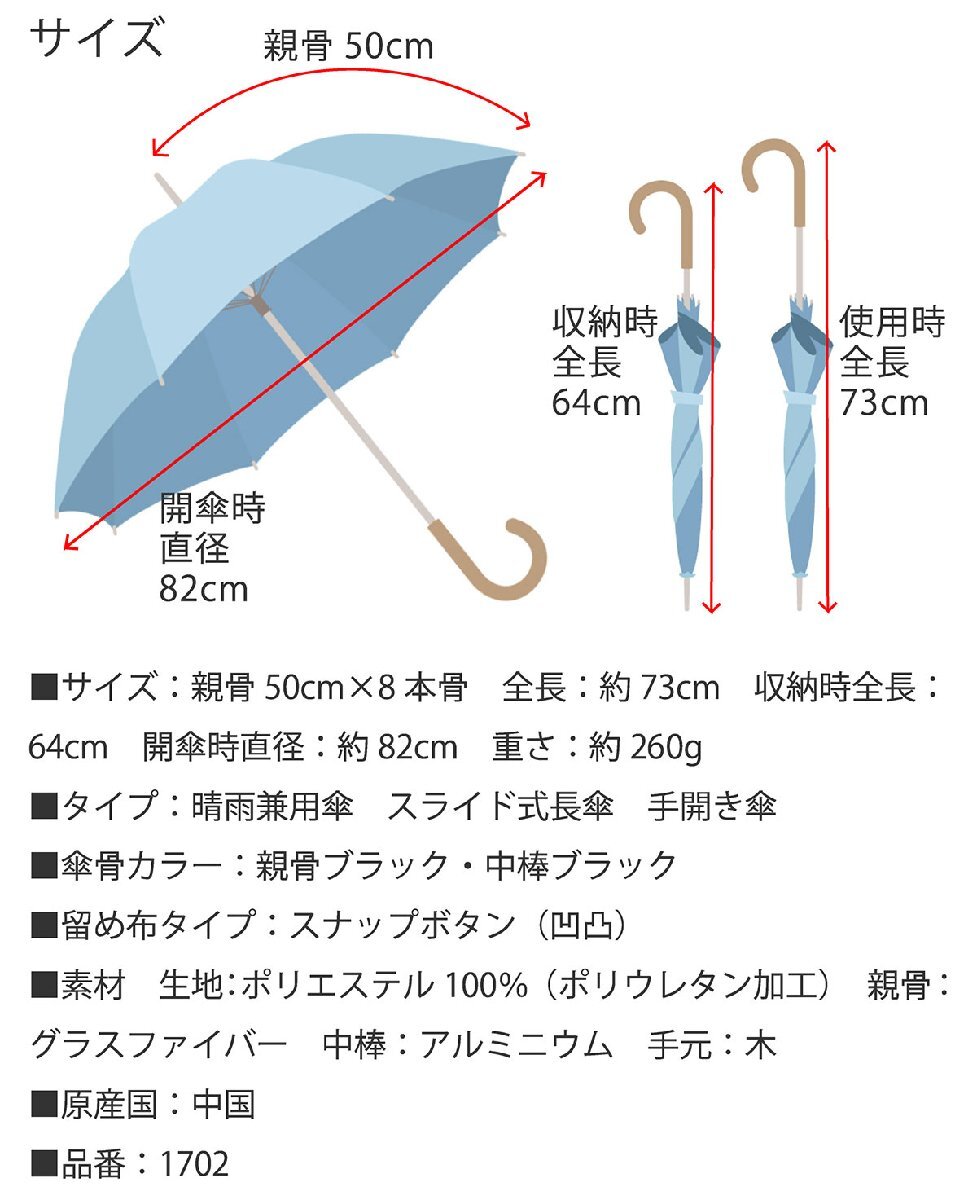 ■サイズ:親骨50cm×8本骨 全長:約73cm 収納時全長:64cm 開傘時直径:約82cm 重さ:約260g