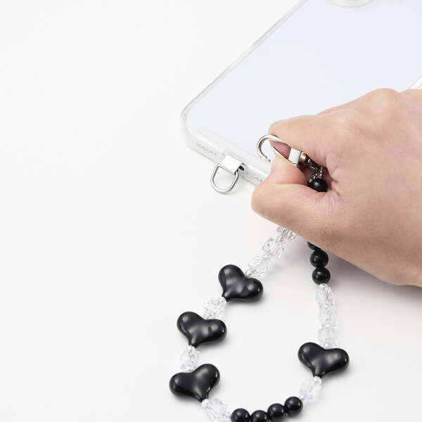 | ●ブラックのハートとビーズが甘すぎず、ほどよく大人っぽさも感じられる ビーズハンドストラップ | |