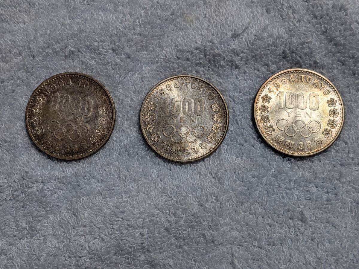 1964年東京オリンピック1000円銀貨3枚になります。左側、照明の加減で黒く見えますが3枚とも同じような状態です。銀貨3枚は特有の黒ずみがあります、送料は一律185円になります。
