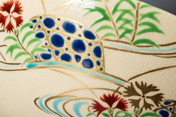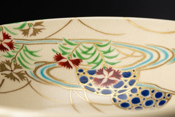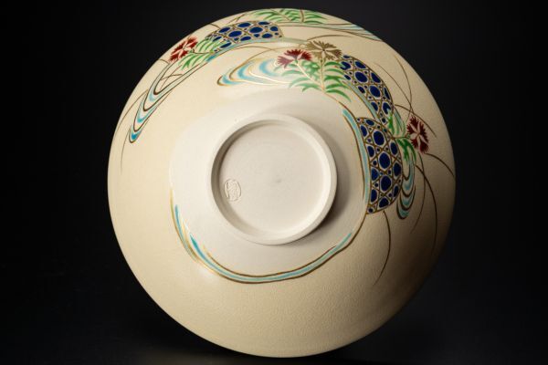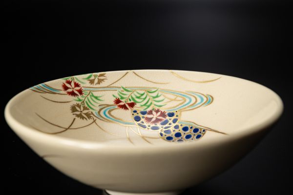 粟田窯 曉山作の、仁清写 撫子絵平茶碗です。