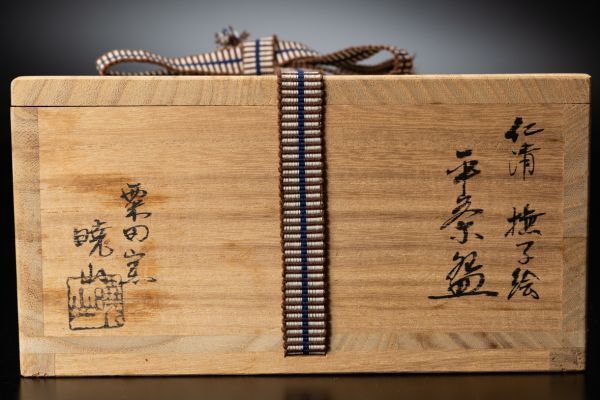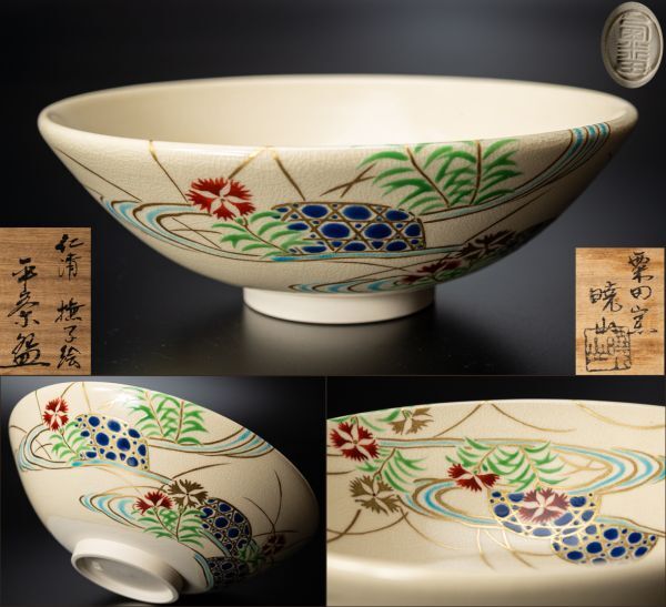 【茶道具】粟田窯 曉山 仁清写 撫子絵平茶碗 四方桟桐共箱 黄布 保証品