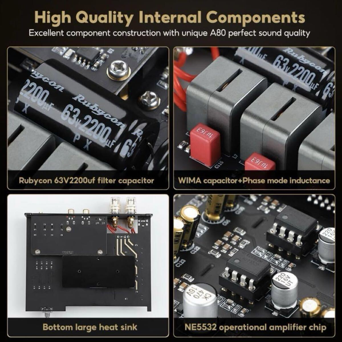 【ハイファイオーディオアンプ】:AIYIMA A80 Bluetoothデコードアンプは、高性能TPA3255クラスDアンプチップを採用し、Rubyconコンデンサ、ドイツWIMAコンデンサ、プロフェッショナルオーディオマニアコンポーネントを搭載しています。 高出力を確保するだけでなく、全高調波歪率(THD)は0.006%と低く、SN比(SINAD)は109dBを達成しています。