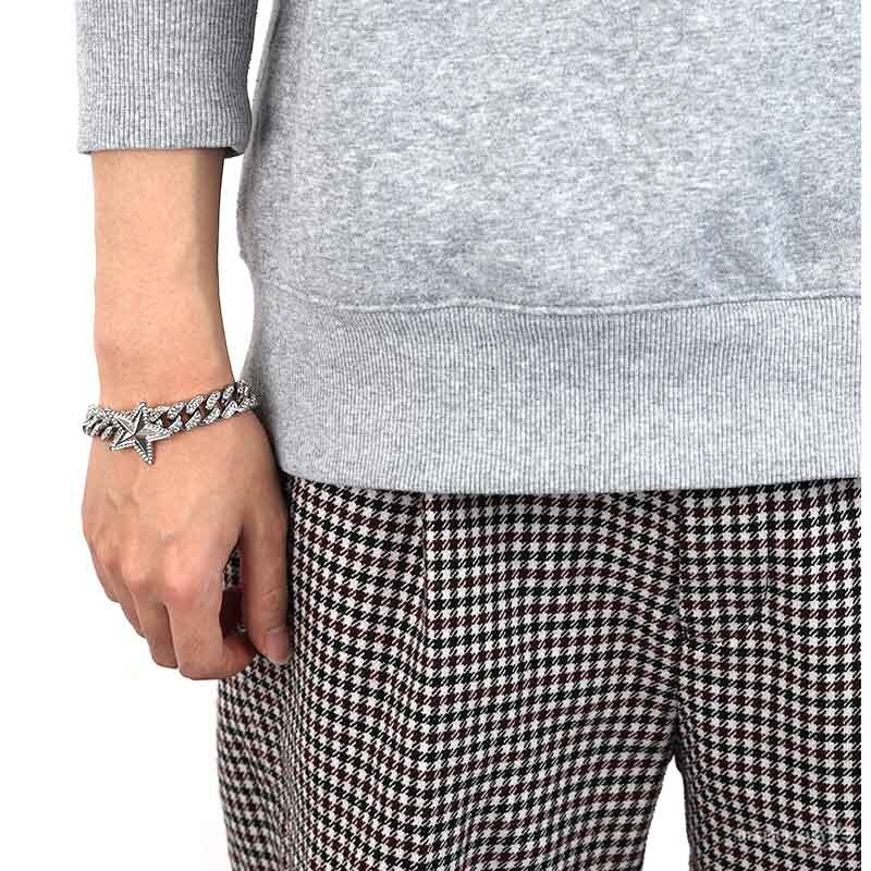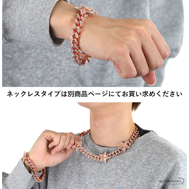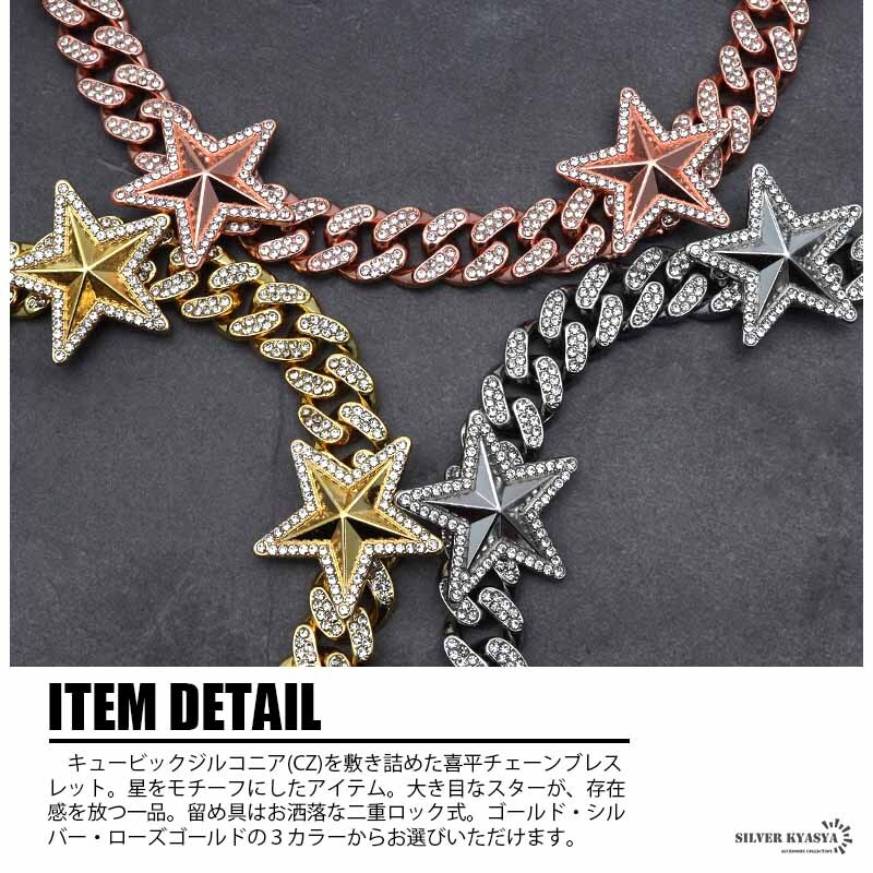 キュービックジルコニア(CZ)を敷き詰めた喜平チェーンブレスレット。星をモチーフにしたアイテム。大き目のスターが、存在感を放つ一品。留め具はお洒落な二重ロック式。ゴールド・シルバー・ローズゴールドの3カラーからお選びいただけます。