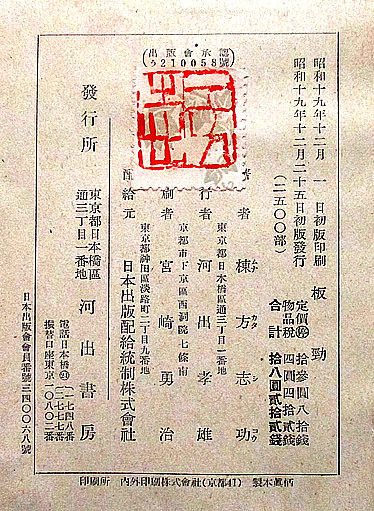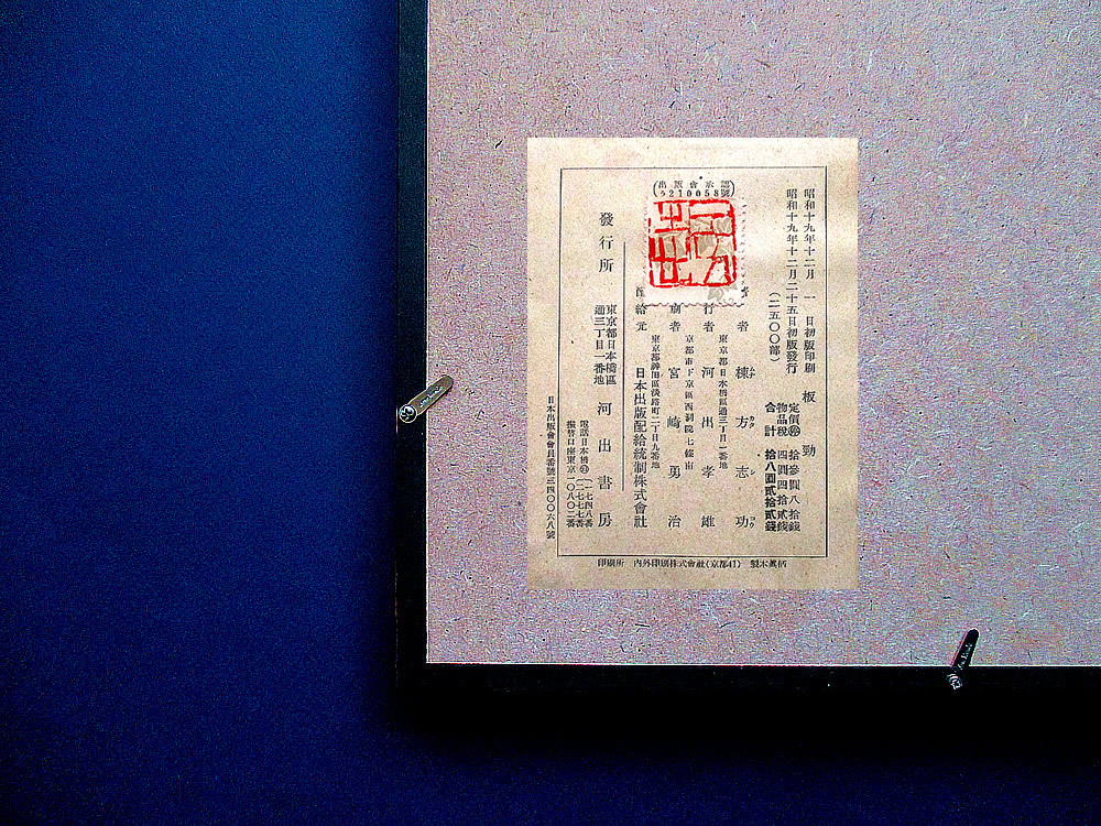 ※額の裏面には、棟方志功の「検印」が付いたこの木版画集「板勁」昭和19年発行の「奥付(コピー)」が添付されております。
