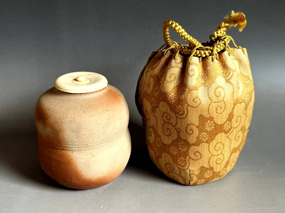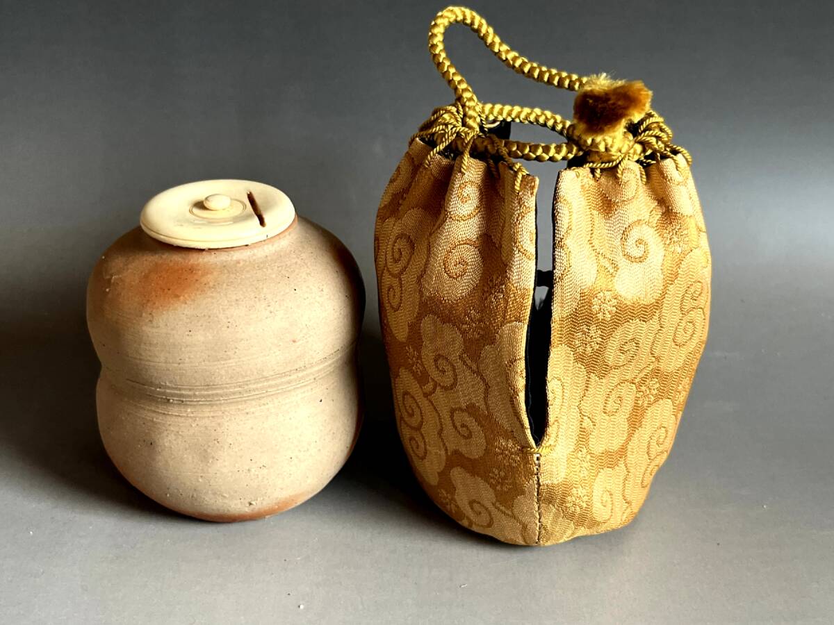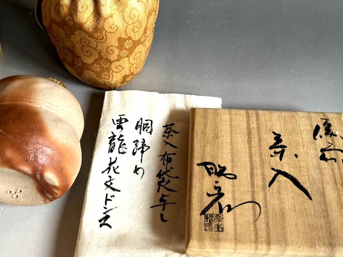 茶入れ■備前焼き 岸本昭彦 茶入布袋銅締め雲龍花文ドンス 共箱 お茶道具 古美術 時代物 骨董品■