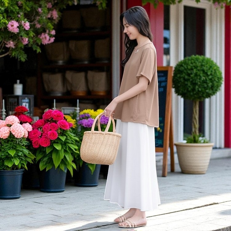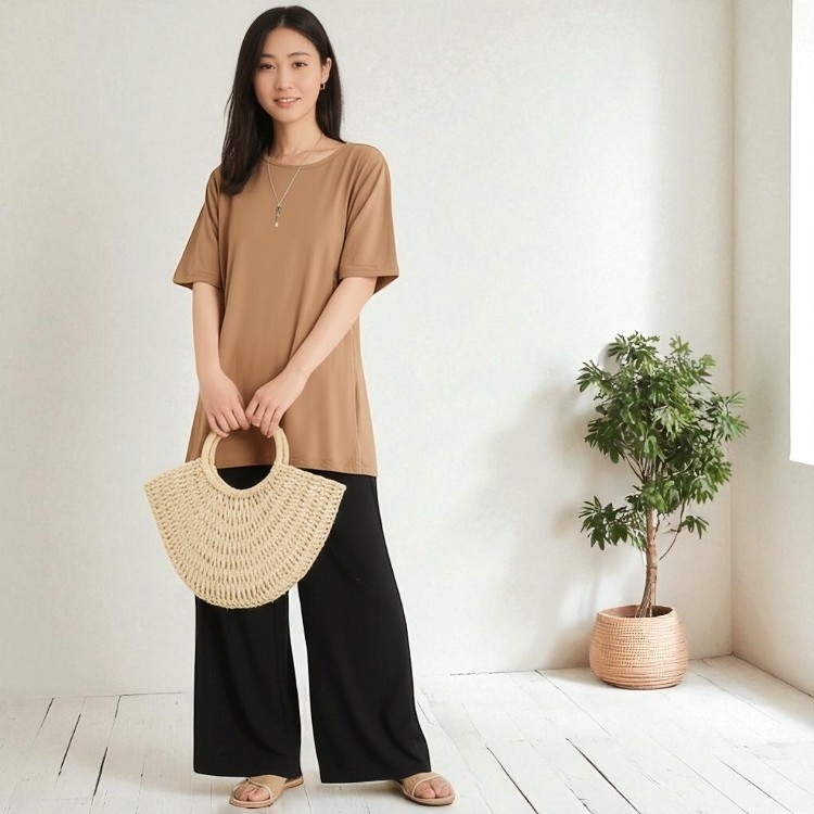 程よい開きのネックラインや、さりげない袖口のアクセントが、カジュアルながらも上品な印象を与えます