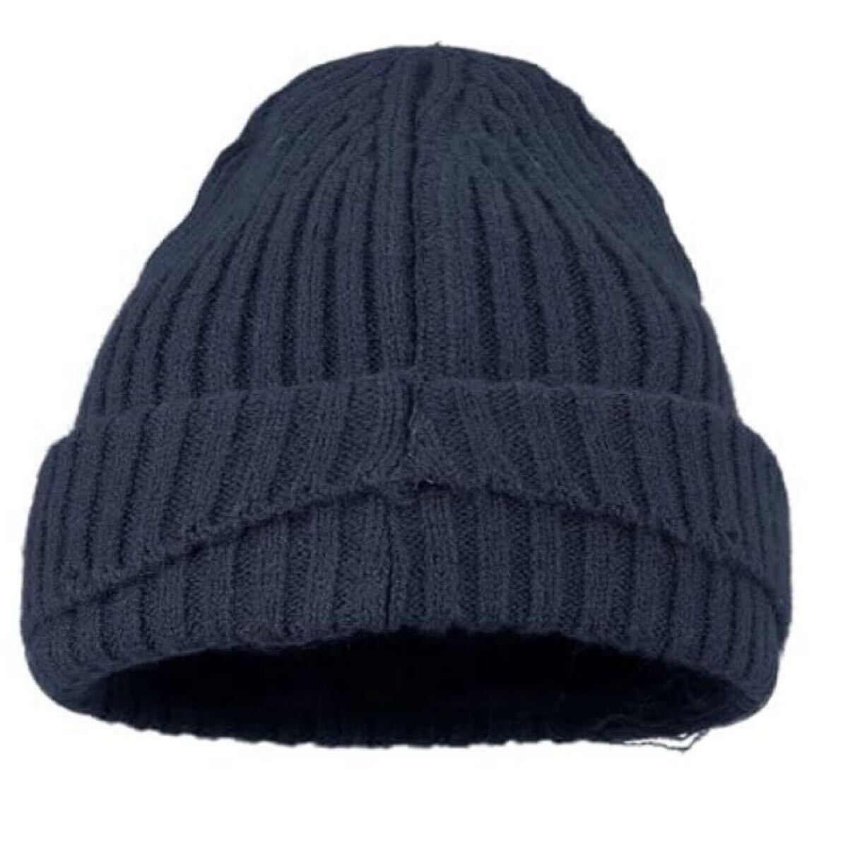 リブ編みデザインのネイビーニット帽、カジュアルスタイルに最適。