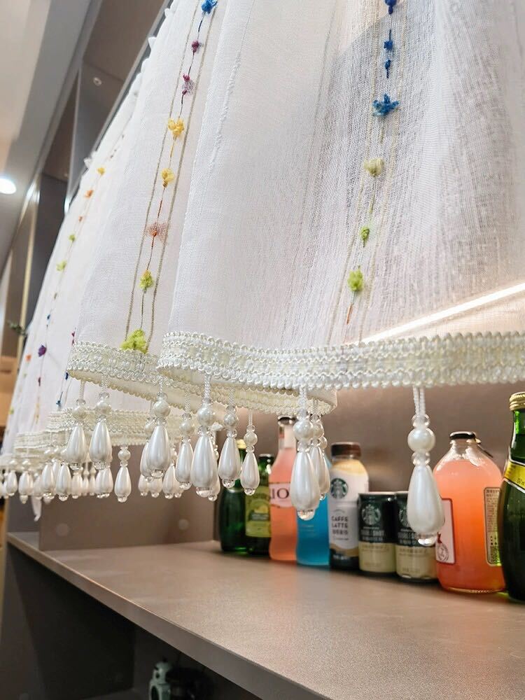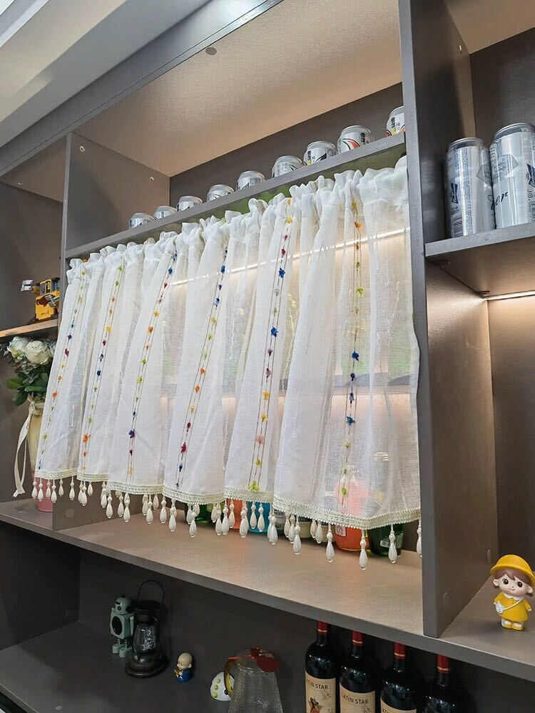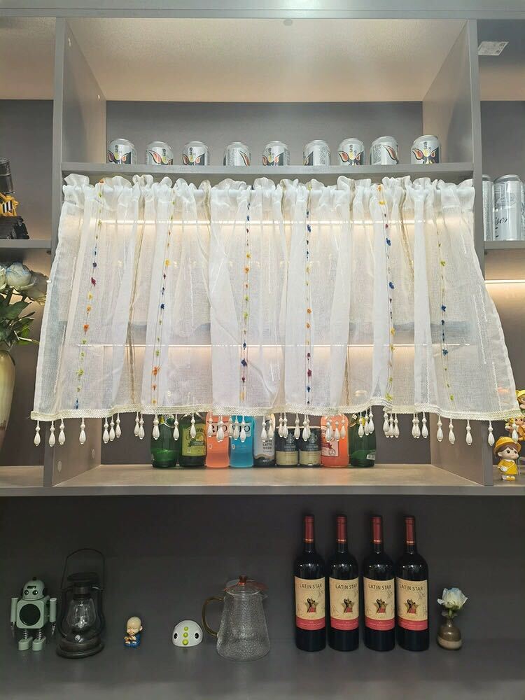 レース素材でお部屋を上品に彩ってくれる小窓カーテンです。小窓や戸棚の目隠し、インテリアのワンポイントにお使いください。
