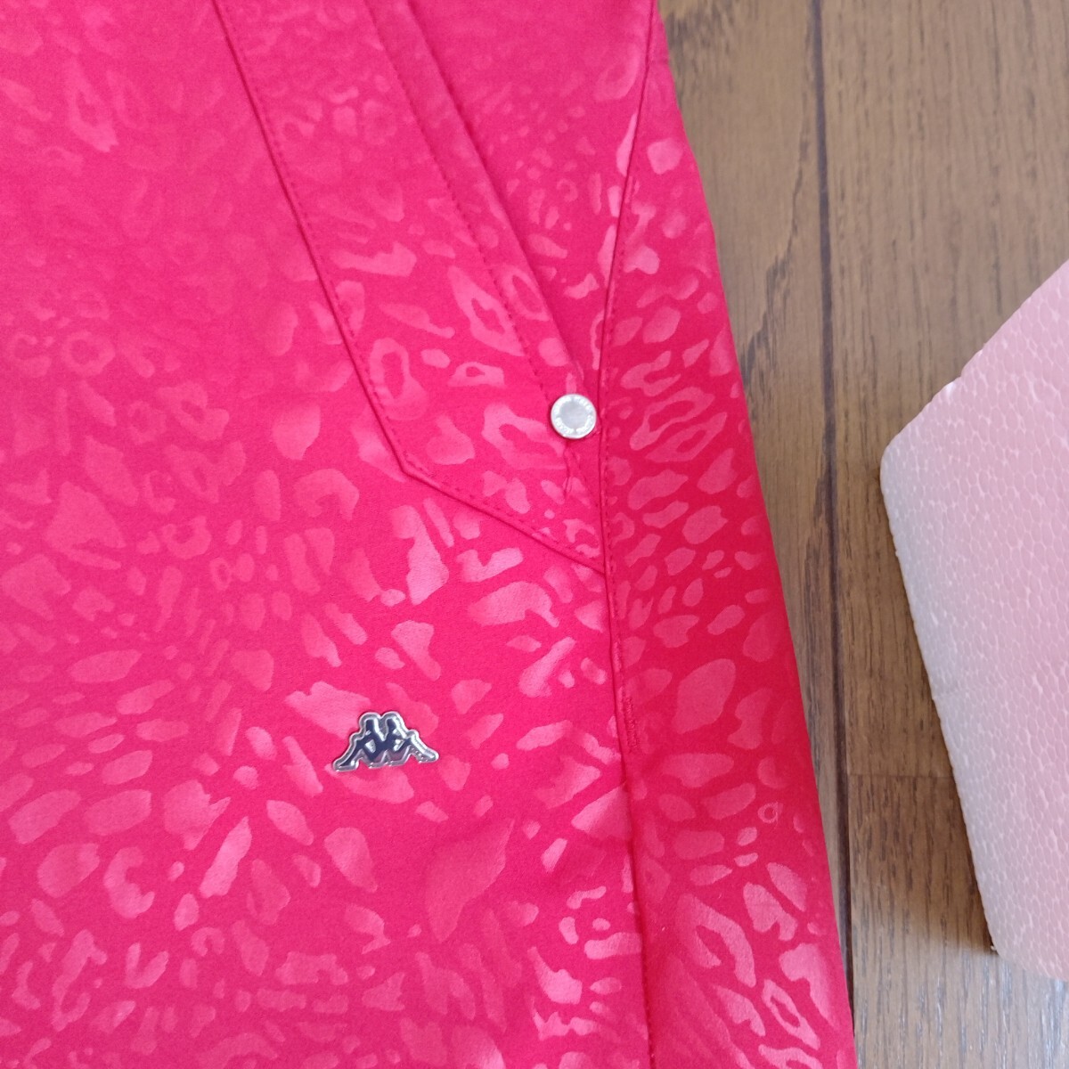 Kappaロングパンツです。色は赤地/地模様です。前ポケット2つ、左ポケット下に『Kappa』のシルバーのロゴアクセント、後ポケット2つ、左ポケットは蓋付き、右ベルト通しにはベルトループ、右後ベルト通し下に合成皮革プレートがデザインされています。