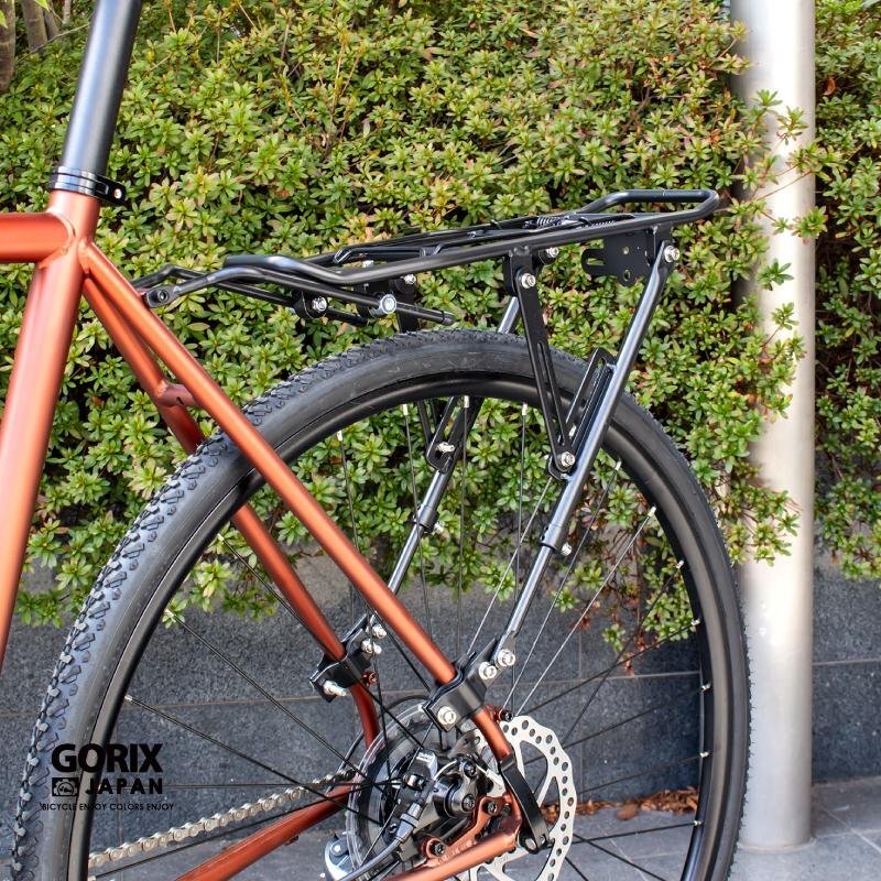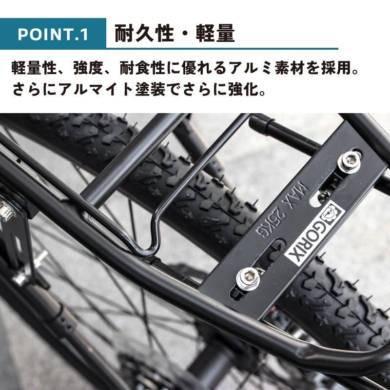 自転車荷台、自転車用リアキャリアを装着して荷物を沢山自転車に積載できる! 自転車通勤・通学やツーリング、旅行、お買物に最適なリアキャリアです。 キャリアを付ける事で背中に汗を掻いて不快な思いをしたり、長時間背負い体に負担を掛ける事も無くなります。 上下と前後に調整可能なので取付角度を柔軟に調整可能。 背面には台座があるのでライトなど取り付ける事も可能です。 ダボ穴のない自転車でも装着できるフォークセンターブラケット付属。 700cロードバイクやクロスバイク、マウンテンバイク、折り畳み自転車等ほとんどの自転車タイプに適用。 [耐久性・軽量] 軽量性、強度、耐食性に優れるアルミ素材を採用。また通常の塗装に比べ軽量性、耐久性に優れるアノダイズド(アルマイト)塗装を採用し さらに強化。 [超耐荷重] 最大耐荷重約25kg!重い荷物を積むことが可能。自転車通勤や自転車通学に最適です。 ツーリングで荷物が増えても安心。 [様々な自転車に取付け可能] ダボ穴なしの自転車タイプにも付属のフォークセンターブラケットを使用して装着可能。 24-29インチ、ロードバイク、クロスバイク、マウンテンバイク、折り畳み自転車等ほとんどの自転車タイプに適用します。 [バネ] リアキャリアについているバネは、ちょっとした物を挟んで荷物を固定するときに便利。 [簡単装着] 日本語説明書入りで装着に必要な工具が附属しております。 上下と前後に調整可能なので取付角度を柔軟に調整可能。 ほとんどのパーツが取付済みなので作業もスムーズに。 商品内容リアキャリア、フォークセンターブラケット、工具、ゴムパッド、日本語説明書 荷台サイズ長さ 41×幅13.5cm 材質アルミニウム合金 最大耐荷約25kg ・ジャンク品となりますので汚れやキズ、修理が必要な場合がございます。パーツや付属品が足りない等ある場合がございます。ノークレーム、ノーリータン  |    |