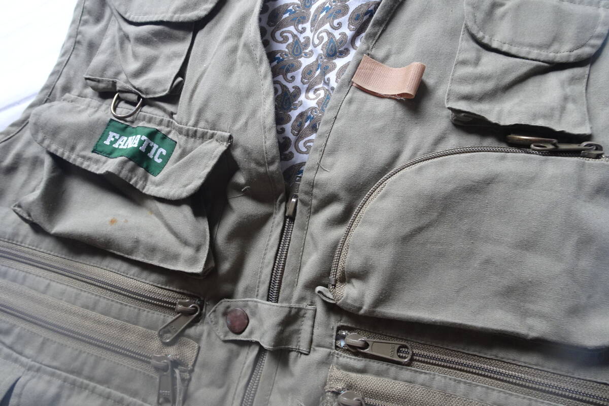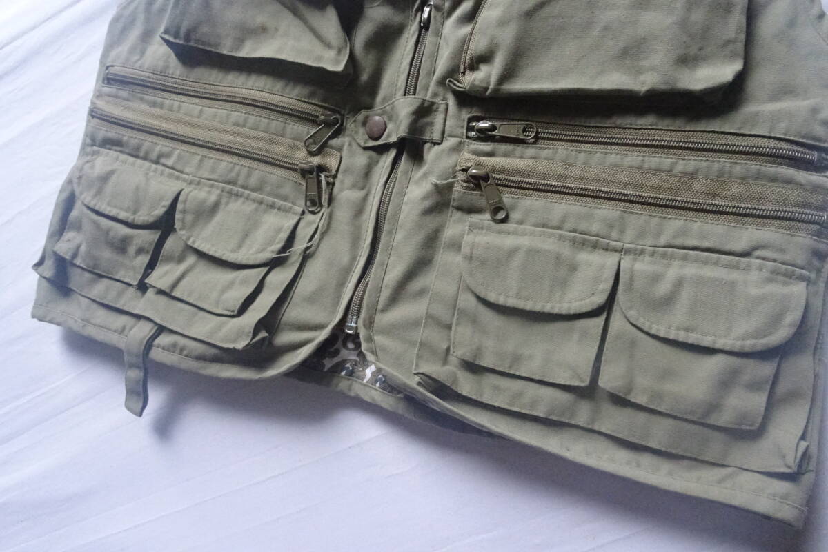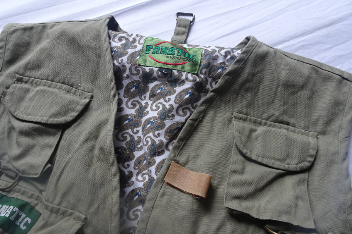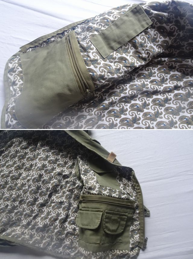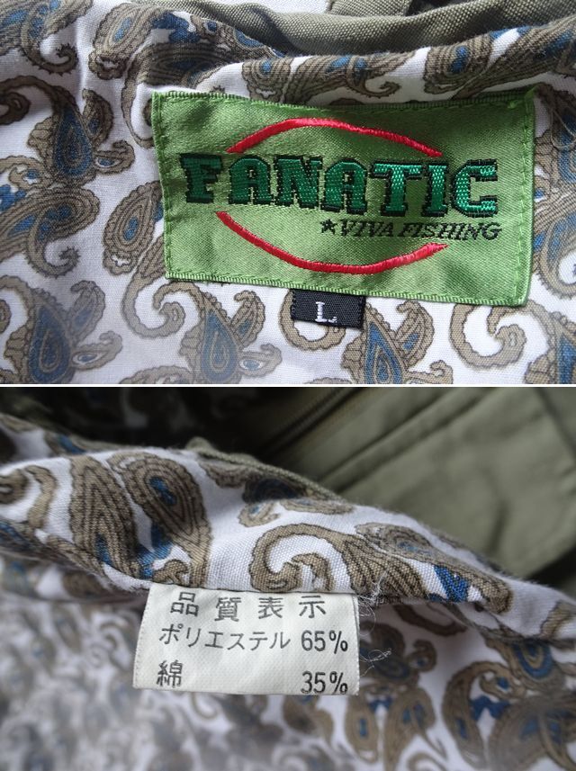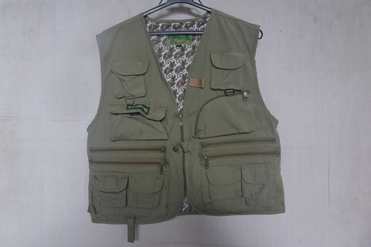 FANATIC/アウトドアベスト/Vネック/前ジップアップ/フラップ・ファスナーポケット/裏地ペイズリー柄/緑系カーキ/Lサイズ(8/12R7)