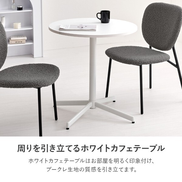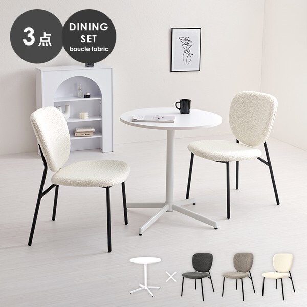 ※現在ご覧の商品ページはホワイトのご購入ページとなります。 ヤフオクの仕様上単一ページに複数バリエーションを掲載することができませんので、他バリエーションが希望の場合は別ページでご購入お願い致します。 ぽこぽことした質感が特徴的なブークレ生地のチェアとホワイトカフェテーブルを合わせた、モダンでありながら温かみのある雰囲気の3点セット。 配達業者を指定いただくことはできません。 北海道/沖縄/離島のお届けに別途中継料金が発生します。 ※別途送料が発生する場合は後ほどご連絡させていただきます。 当店は正規店です。 タイミングによっては在庫切れの場合があります。