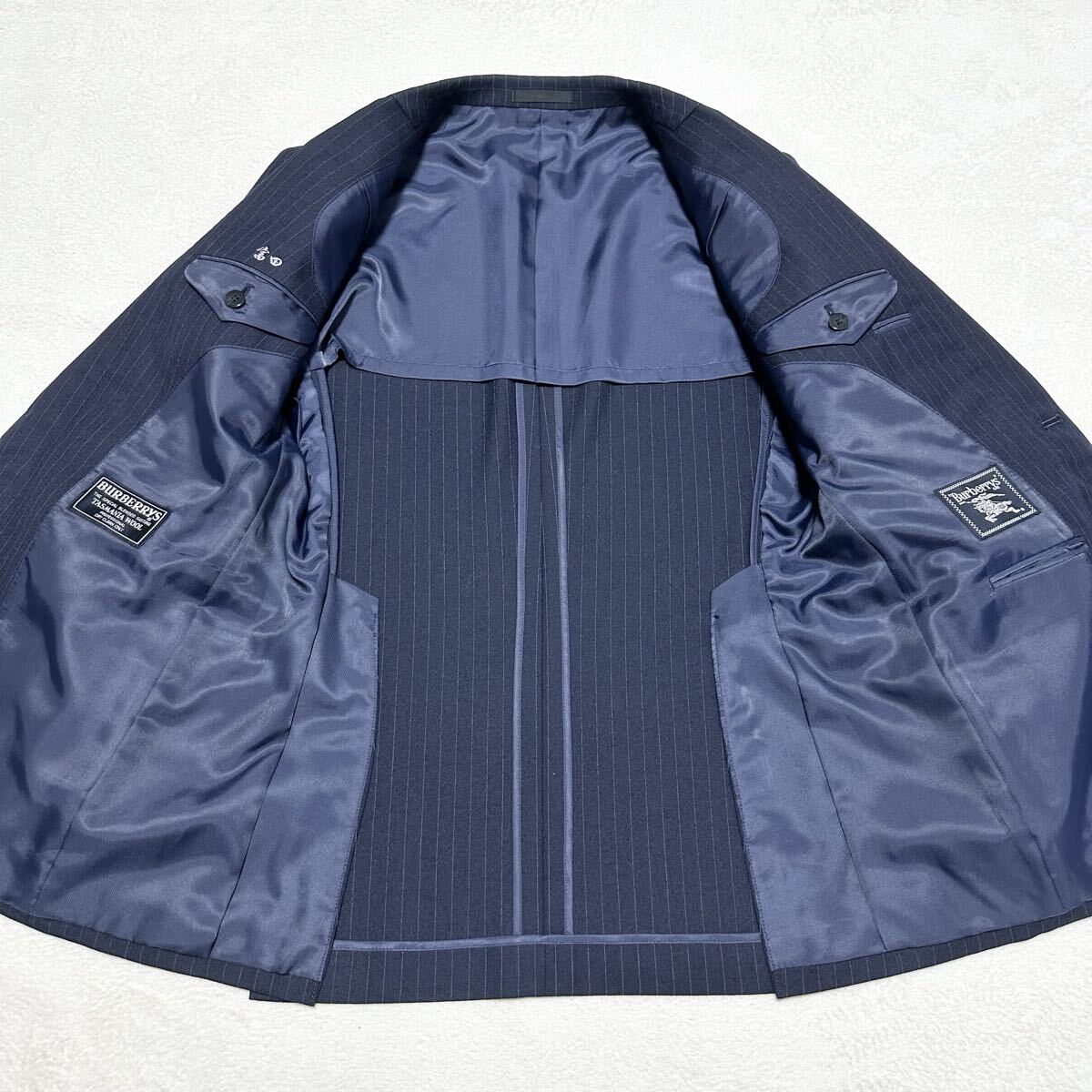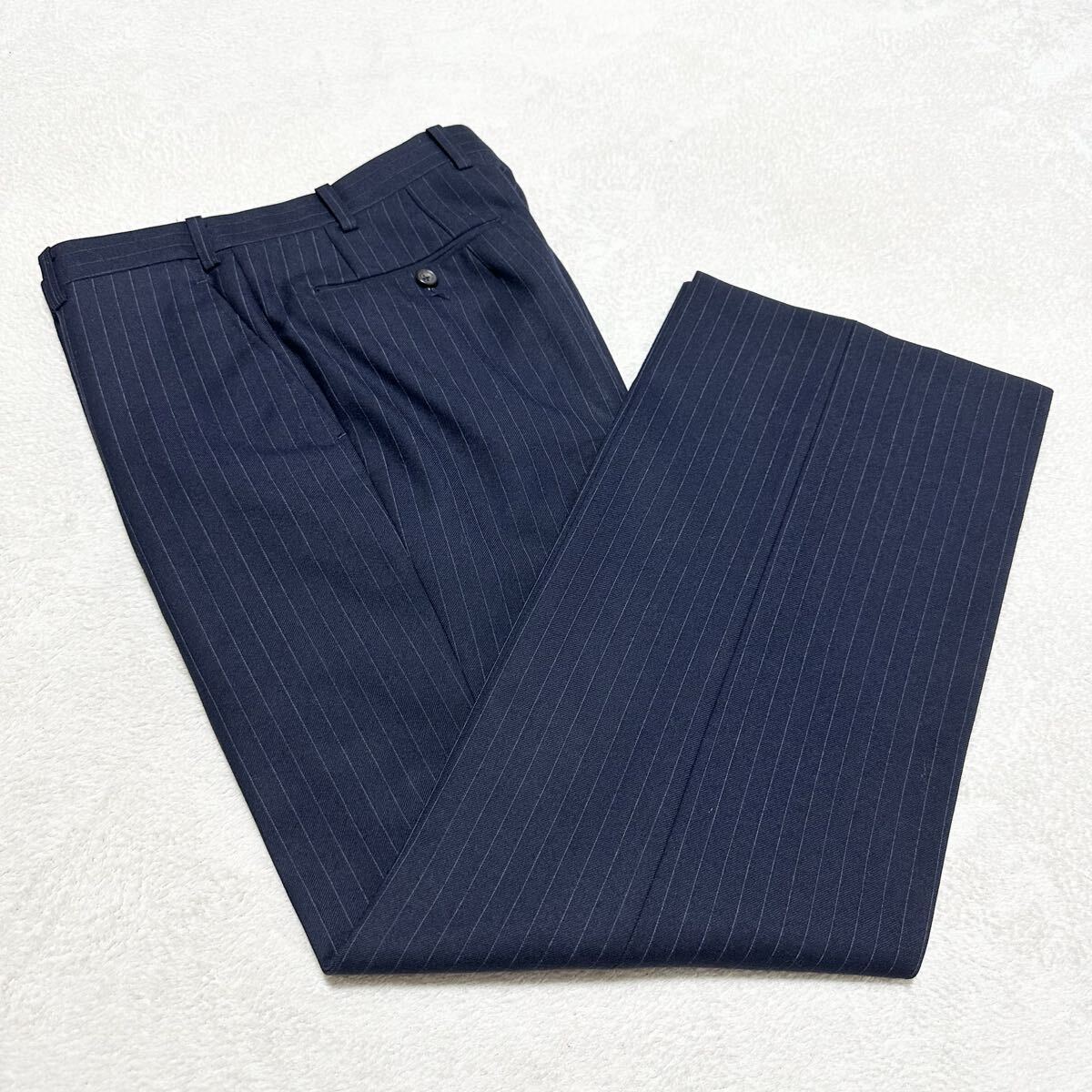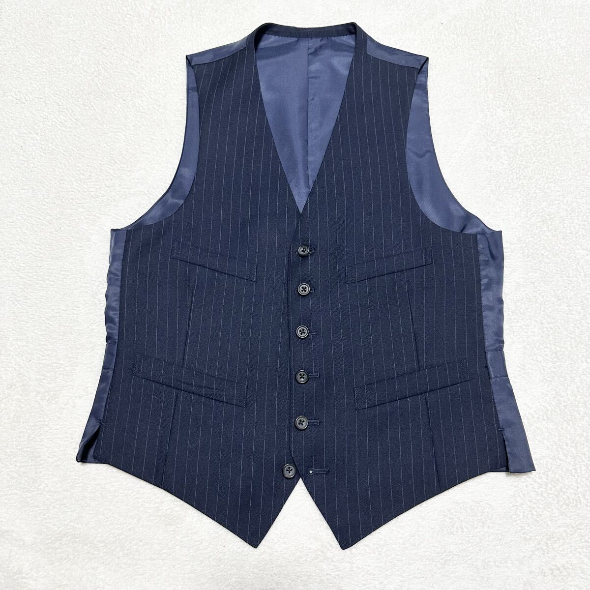ネイビーベースに繊細なストライプが入った、上品で洗練された印象のセットアップ。