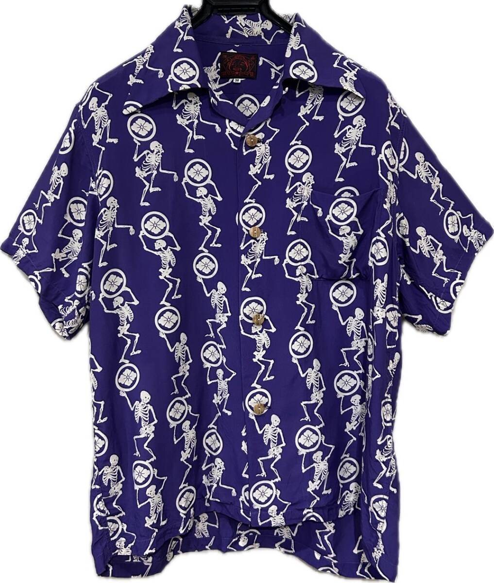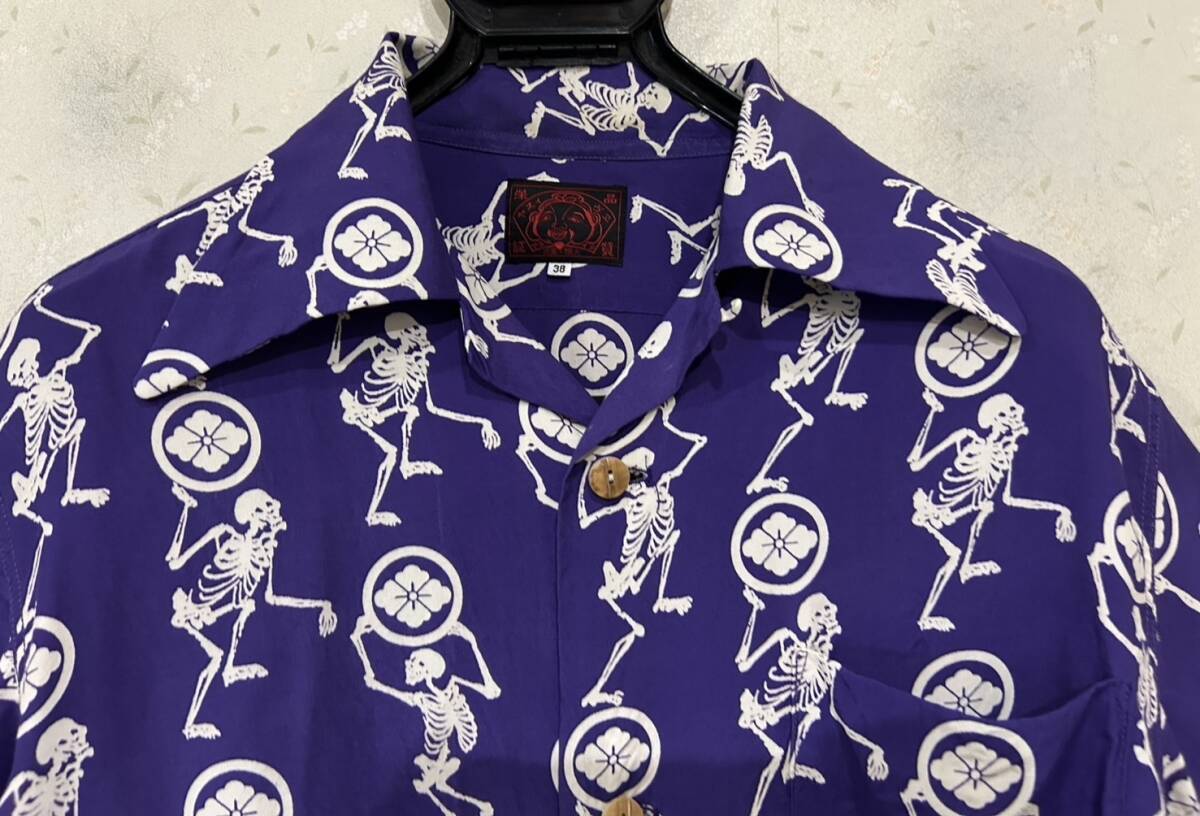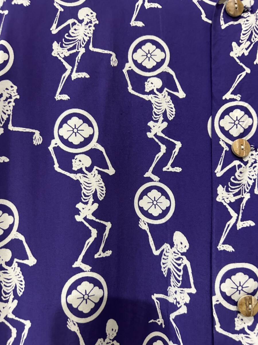 *エヴィス EVISU YAMANE 家紋 骸骨 総柄 レーヨン アロハシャツ 開襟半袖シャツ オープンカラーシャツ トップス 38       BJBE.H