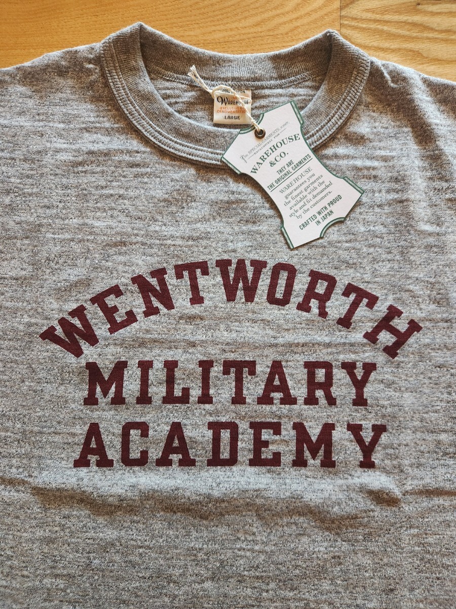 ◎特徴 「吊り編み機より希少」といわれる旧式のローゲージ編み機で編まれたウエアハウスの定番ボディです。12番のムラ糸で独特の陰影が出るように編まれたこの生地はシャドウボーダーと呼ばれており、無地でありながらうっすらと横段のようなムラが浮かびます。極端に前下がりの現代的なネックラインではなく、フライスにパイピングを噛ませる事で強度を保ちながら、着込むほどにネックラインが緩み自然な前下がりが生じます。