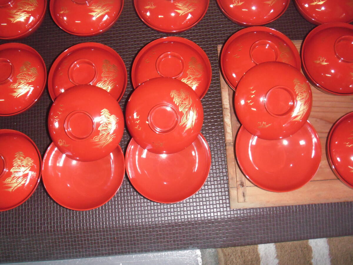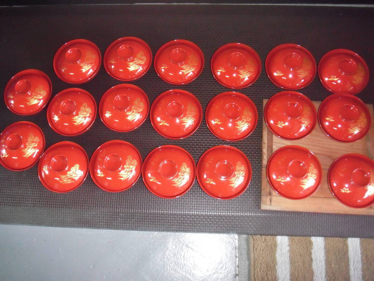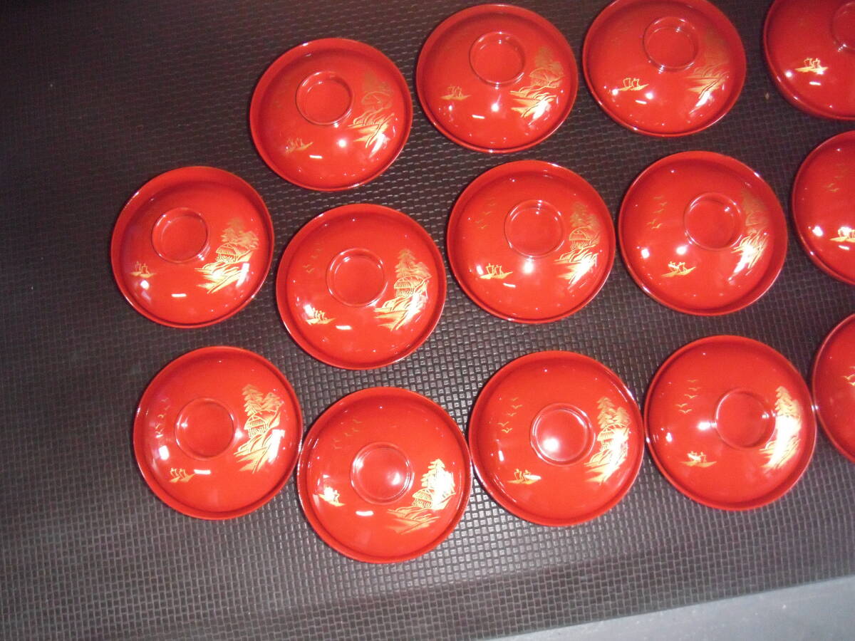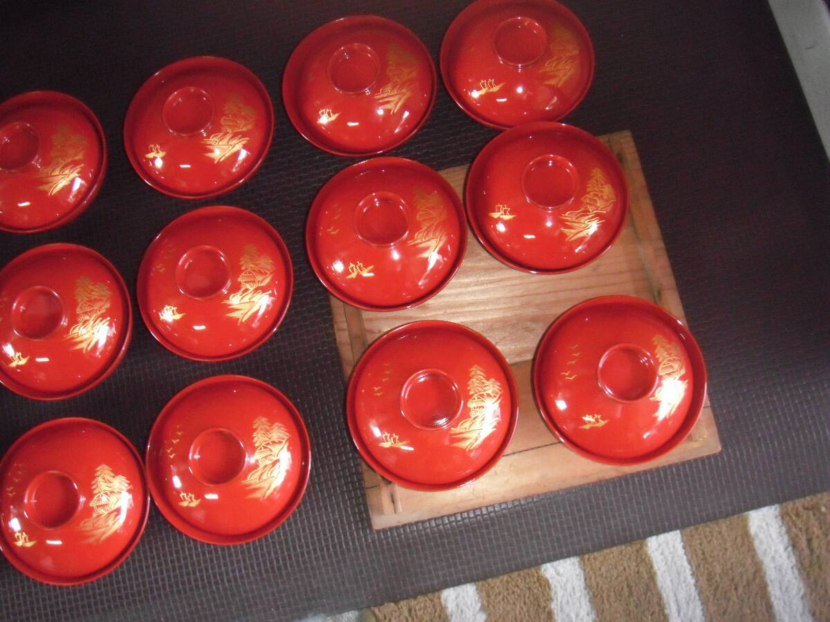 昭和レトロ、昭和中期の朱塗りで絵入りのお椀20組セットです。