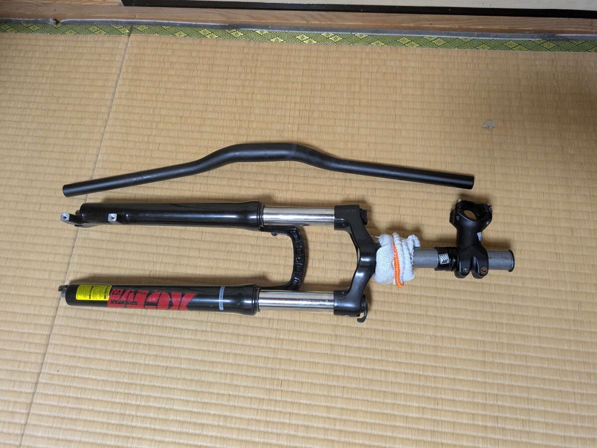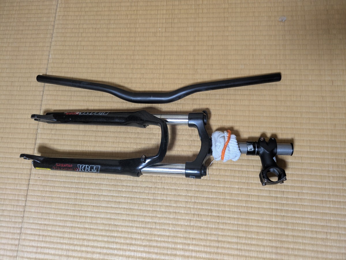 知人から譲り受けましたが不要になりましたので出品します。GTアバランチェ3.0の純正フロントフォークとハンドルバーのセットです。ダンパーは手で押して戻ってくるのは確認できました。ハンドルバーはおまけです。画像追加や寸法の計測等お気軽に質問欄よりお問い合わせください。