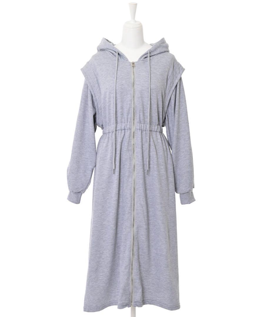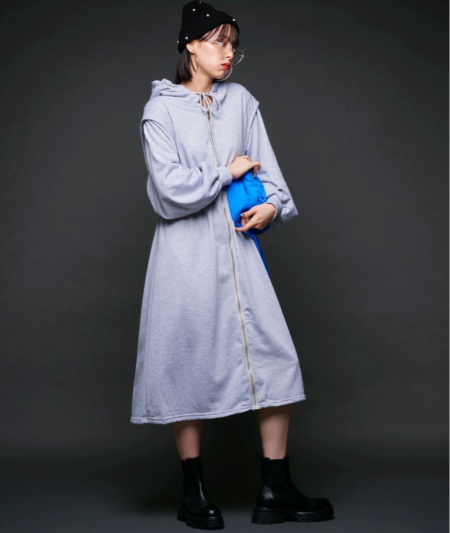 ジップフレアワンピースラフな印象のスウェットフードとショルダーの立体的なデザインで、メリハリあるスタイルに仕上げた一枚。