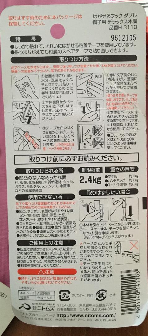 ■画像通りの、ニトムズ はがせるフック ダブル帽子用 デラックス木調 H3110です。